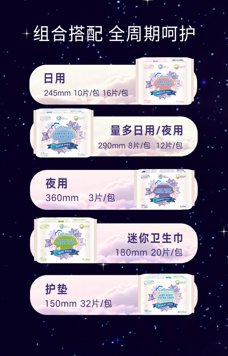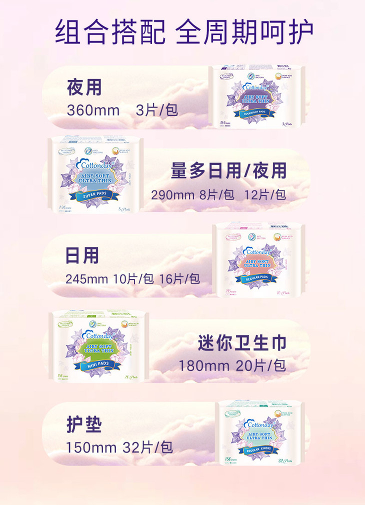 【品名】丹麦 Cottonday绵柔时光 干爽舒适卫生巾/安心裤/私处自检检测护垫 【规格】 日用245mm*10片*3包+夜用290mm*8*3包+护垫150mm*1包 安心裤4包*5片 私处自检检测护垫:6片/盒 【产地】丹麦 【保质期】3年 【发货包装】独立包装袋 【发货地】 【发货快递】圆通,中通,申通,邮政,韵达等随机发 【不发货区域】港澳台 【补邮费地区】内蒙古,海南,西藏,甘肃,青海,宁夏,新疆+10元 【发货时效】48-72小时,周末节假日顺延 |