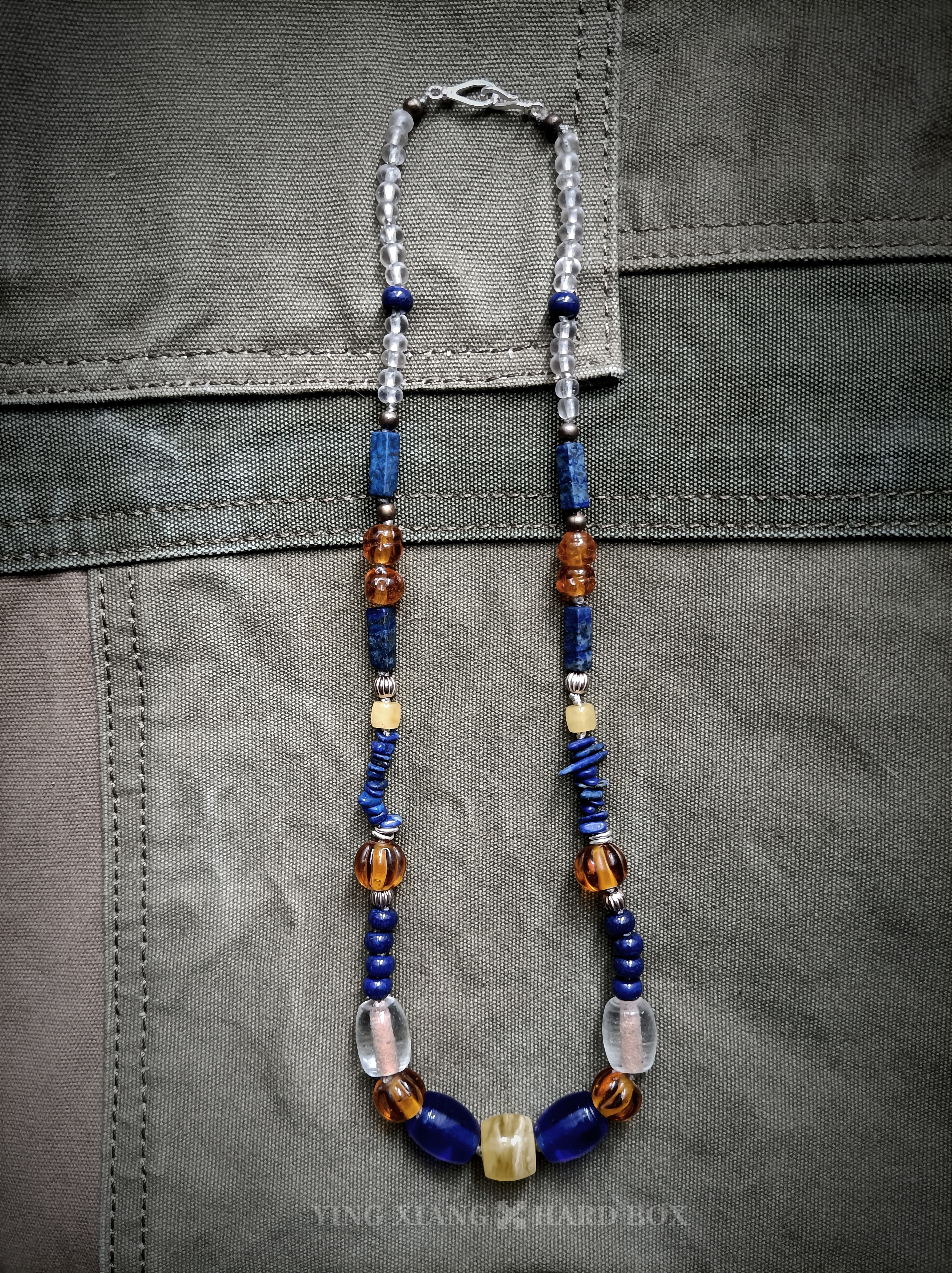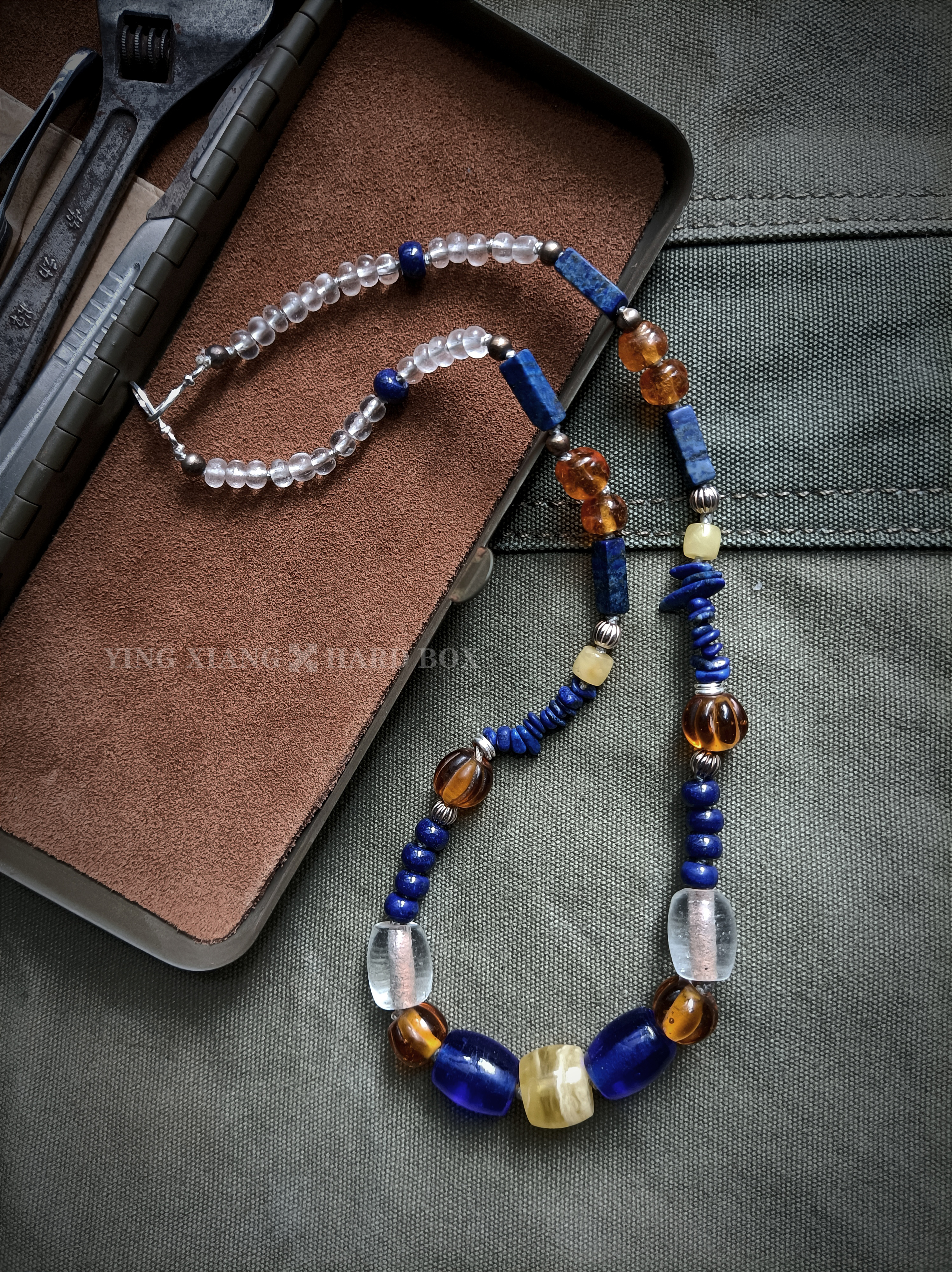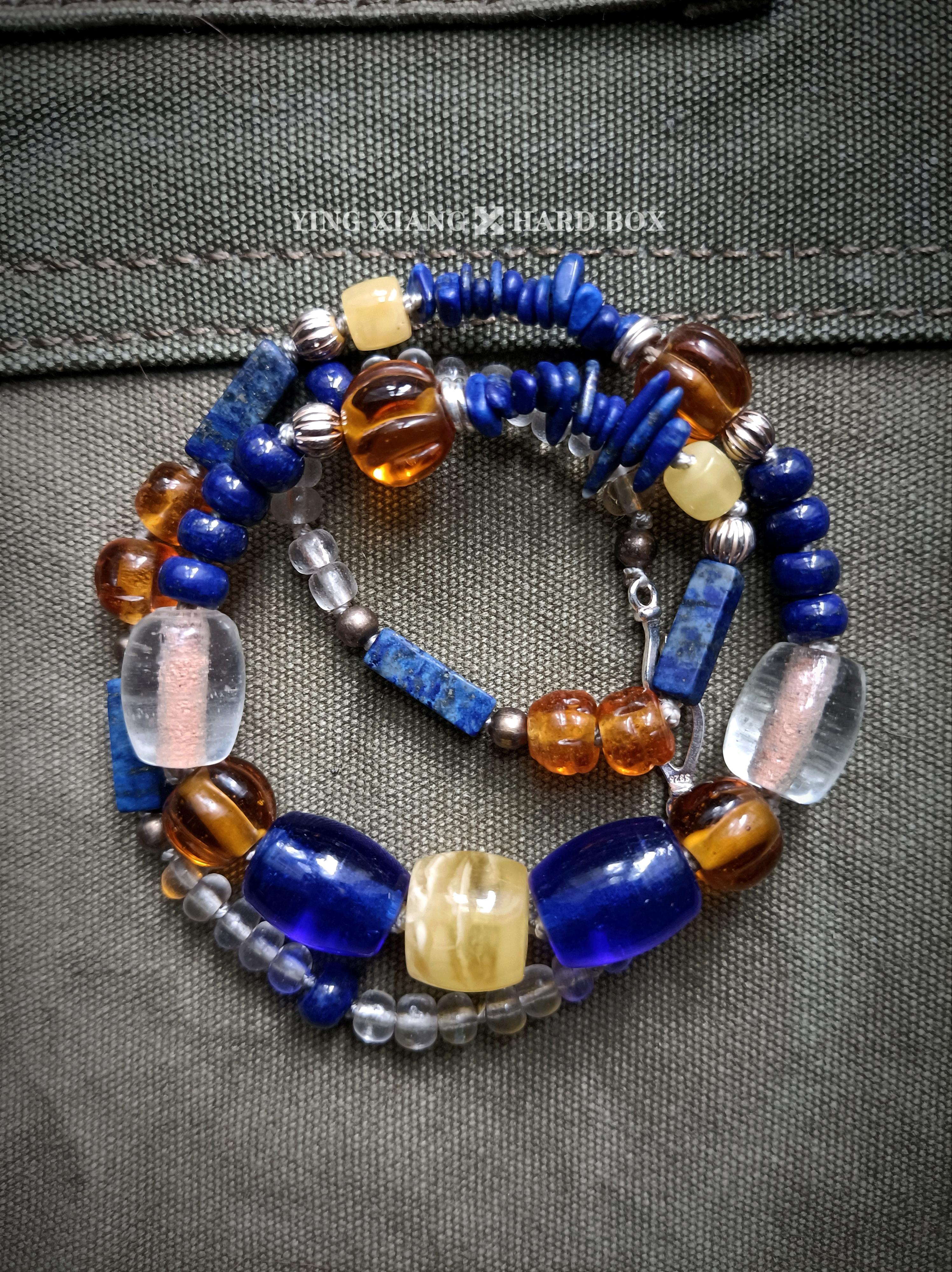 老琉璃珠 天然青金石管+珠+随型 老铜珠 天然蜜蜡 925银隔珠+环+连接扣