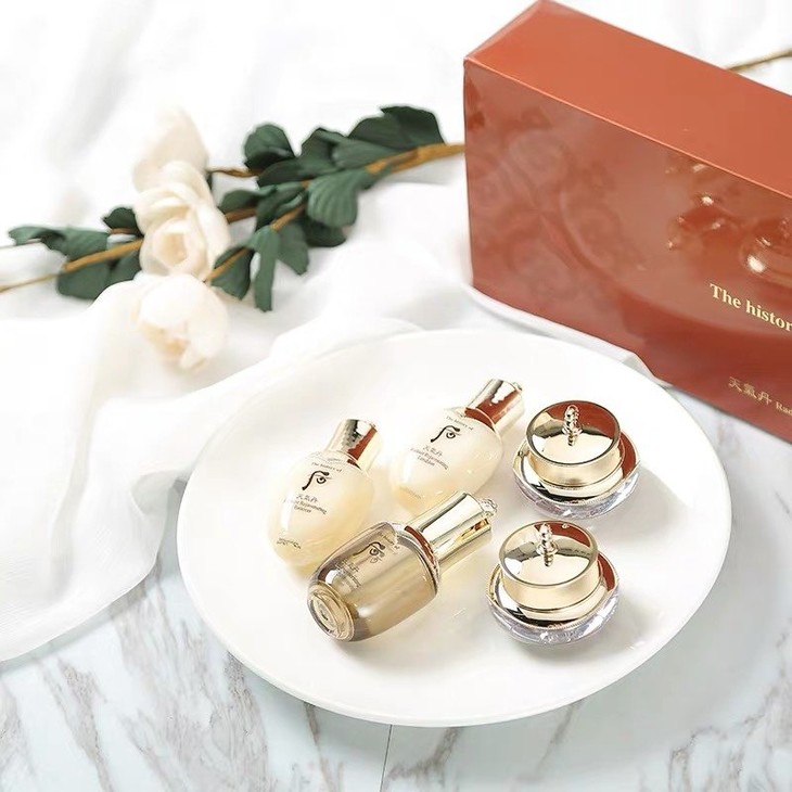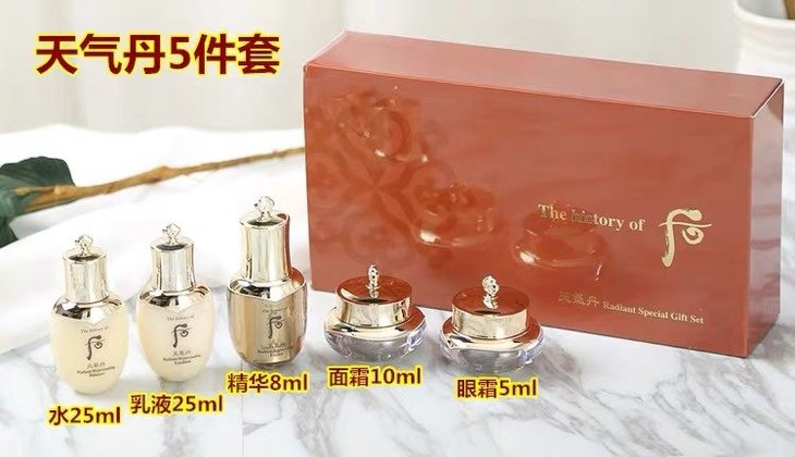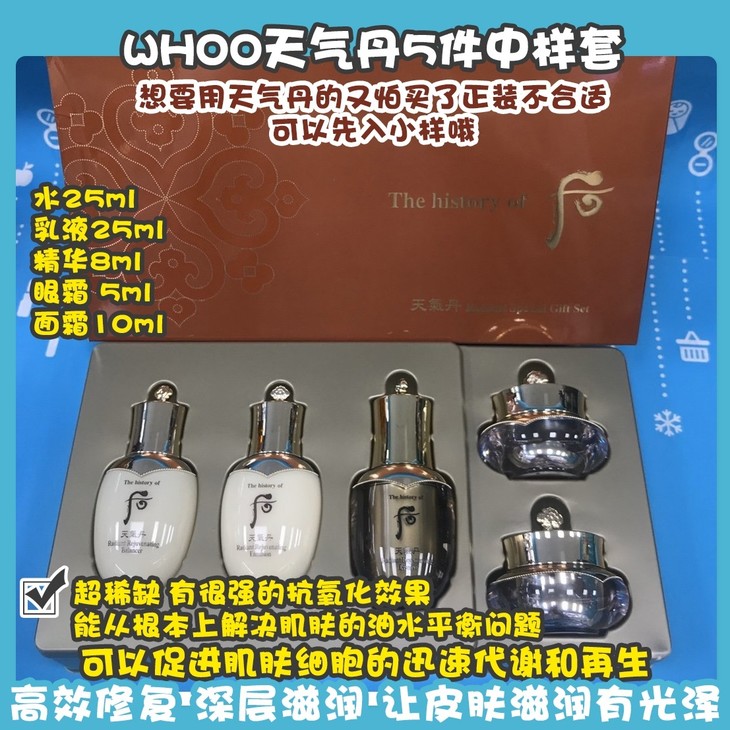 WHOO天气丹5件中样套 👍想要用天气丹的又怕买了正装不合适可以先入小样哦😁!天气丹最全小套,超稀缺‼️有很强的抗氧化效果,能从根本上解决肌肤的油水平衡问题〽️,能使肌肤保持一整天的油水平衡💦,可以促进肌肤细胞的迅速代谢和再生👏🏻。高效修复,深层滋润,让皮肤滋润有光泽🌟。套盒包括:水25ml➕乳液25ml➕精华8ml➕眼霜 5ml➕面霜10ml