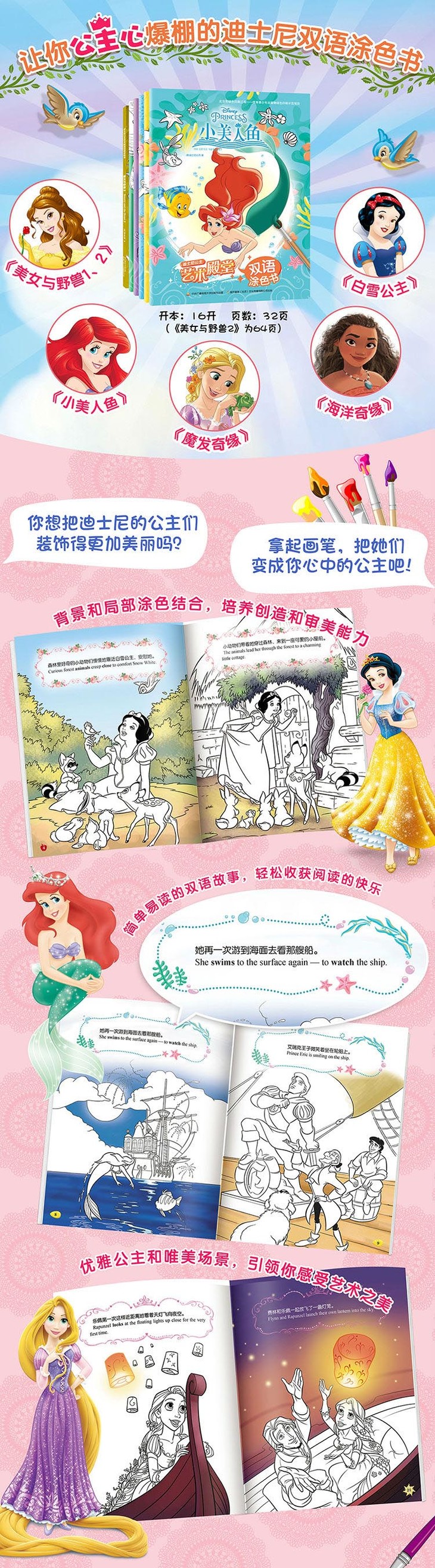 【51TAIK直播间专享】迪士尼公主艺术殿堂双语涂色书合辑(6册)