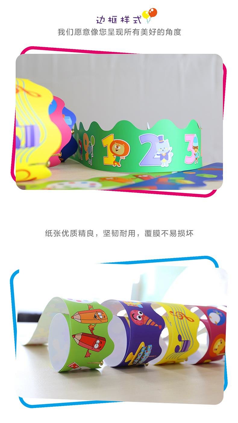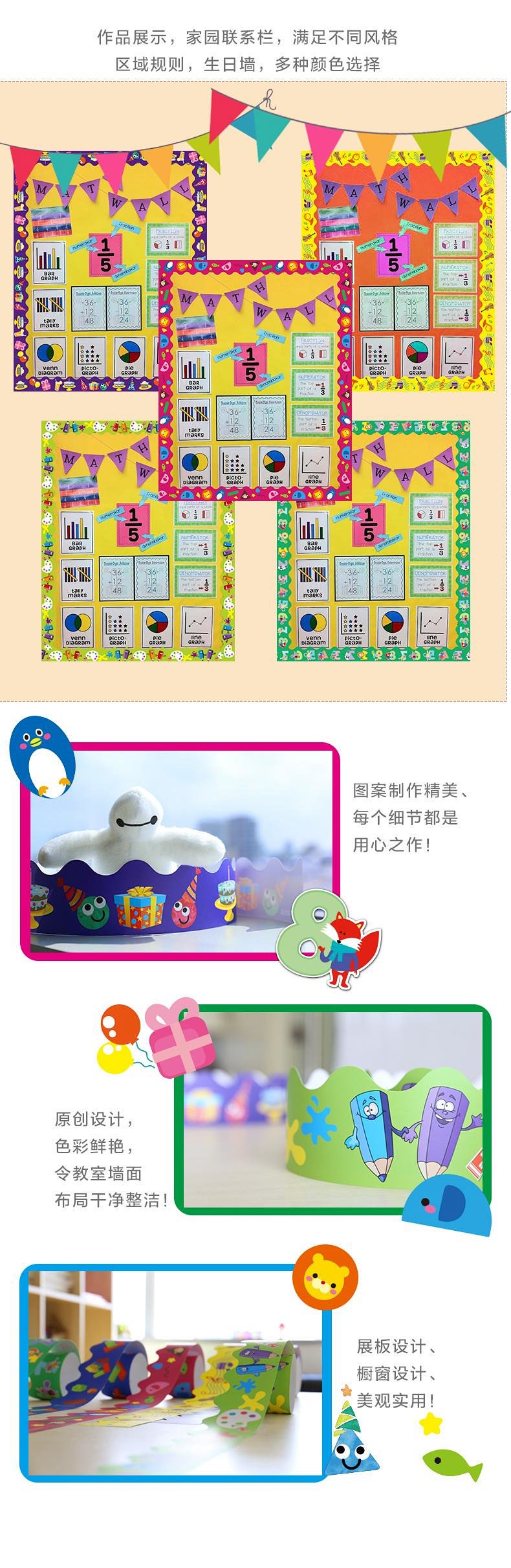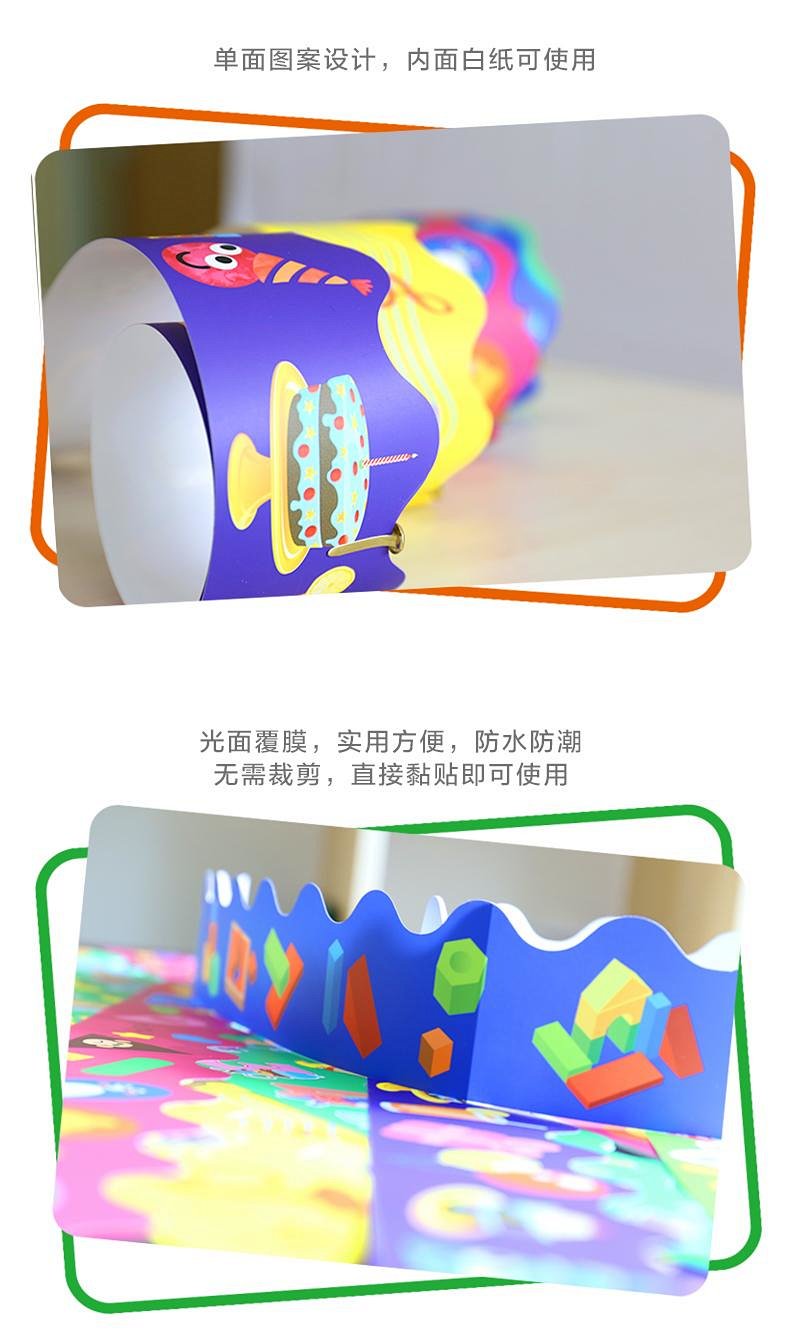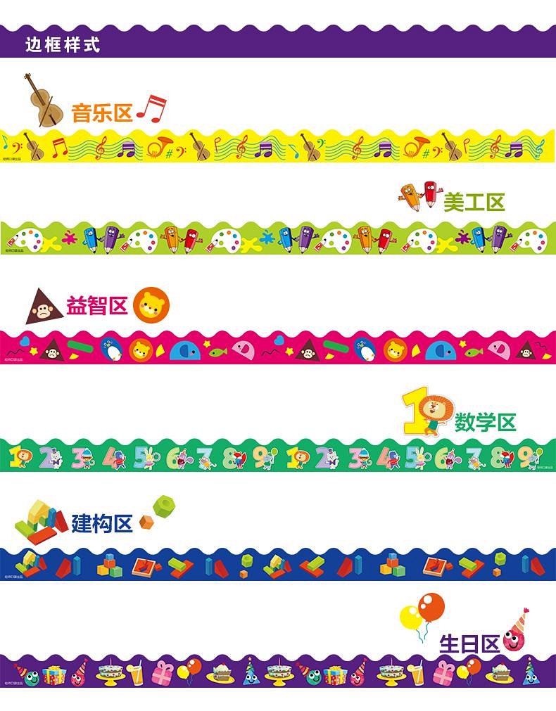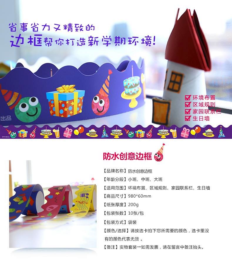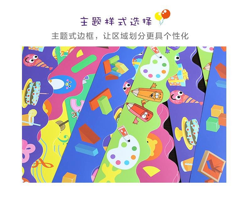 商品名称:防水创意边框年龄分段:小班、中班、大班适用范围:环境布置、区域规则、家园联系栏、生日墙