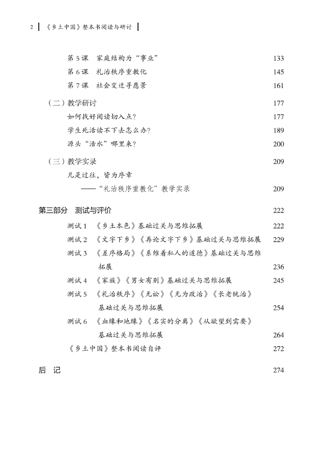 本书正是学习《乡土中国》的好帮手:“导读”带领师生“了解中国和中国人”,走近斯土斯人,关注吾国吾民;“基础解读”帮助学生扫除阅读“拦路虎”,为教师提供备课“百宝箱”;“教学设计与研讨”覆盖课前、课中、课后,完整呈现教学过程;“测试与评价”提供从基础到拓展、从篇章到整体、从书内到书外等多元阅读评价。