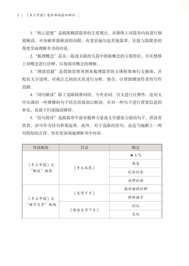 《〈乡土中国〉整本书阅读与研讨》先为师生精读每一篇,每一篇都有结构化的提炼,再从教学层面做设计,意在提供教学路径,最后还尝试测试和评价,薄薄一本书,却解决了整本书阅读最关键的三个问题。