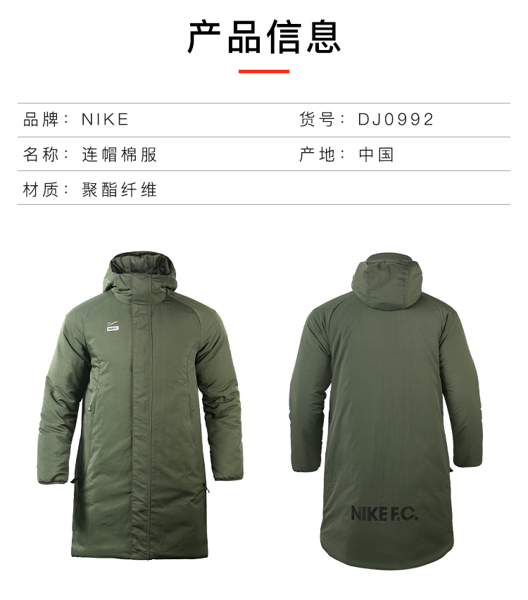 NIKE/耐克FC长款防寒保暖防风连帽棉服长棉服男DJ0992335