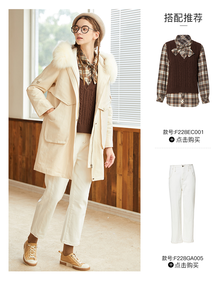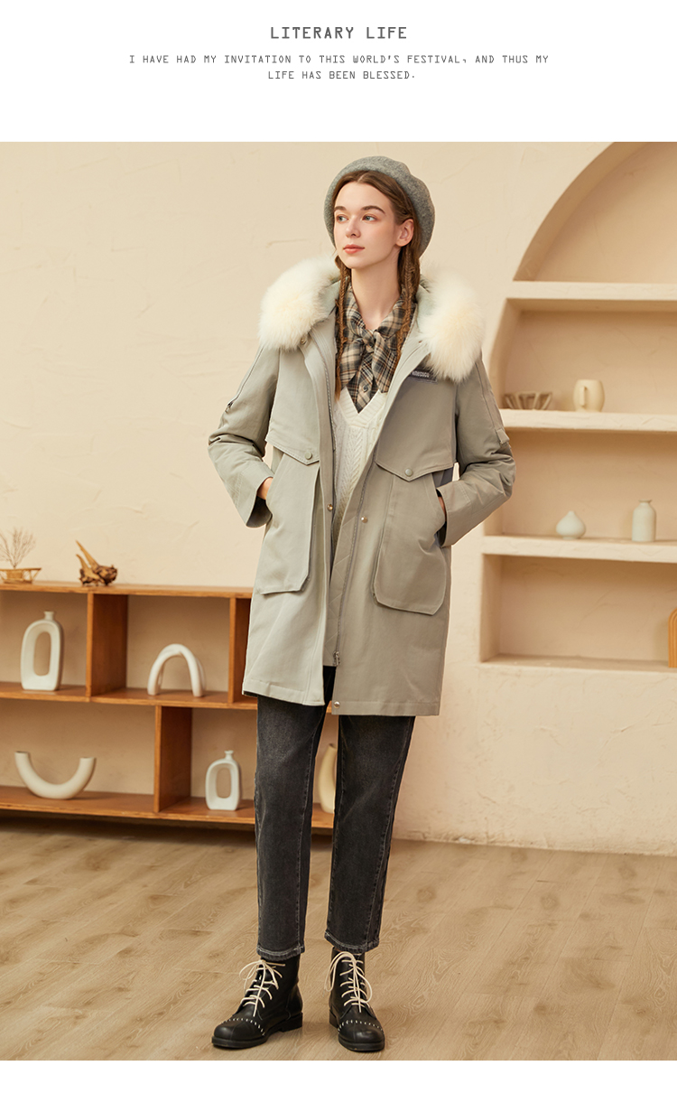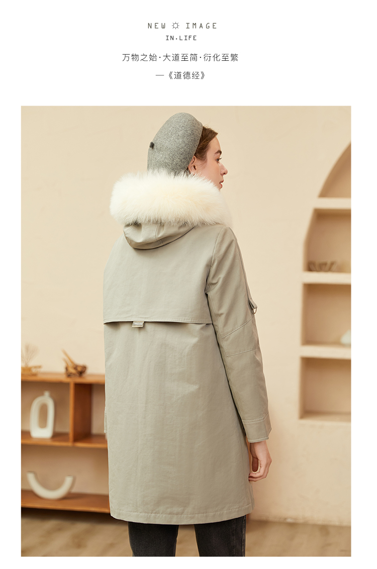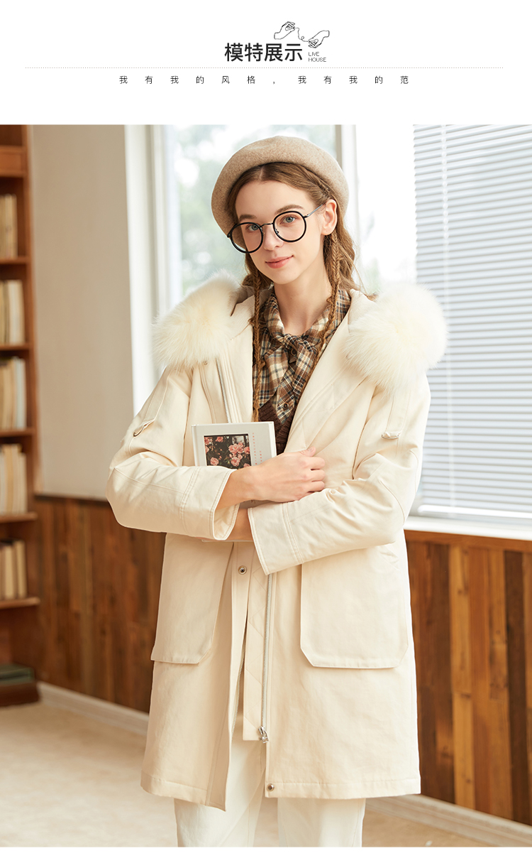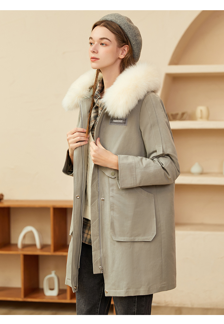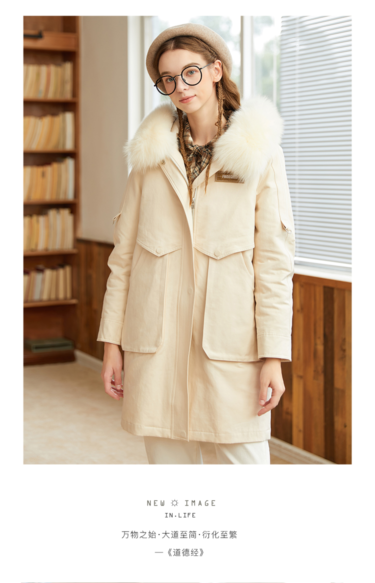 Famecoco范可儿原创设计派克羽绒服女冬加厚大毛领工装外套中长款F228AD001