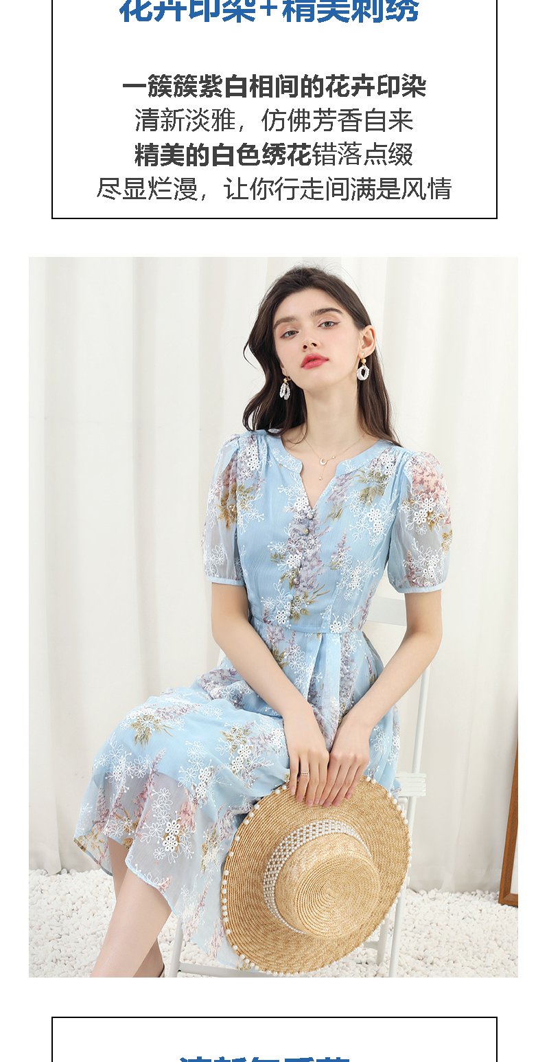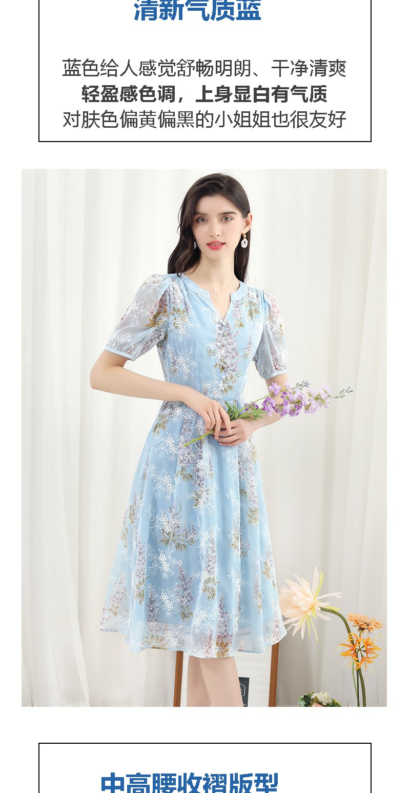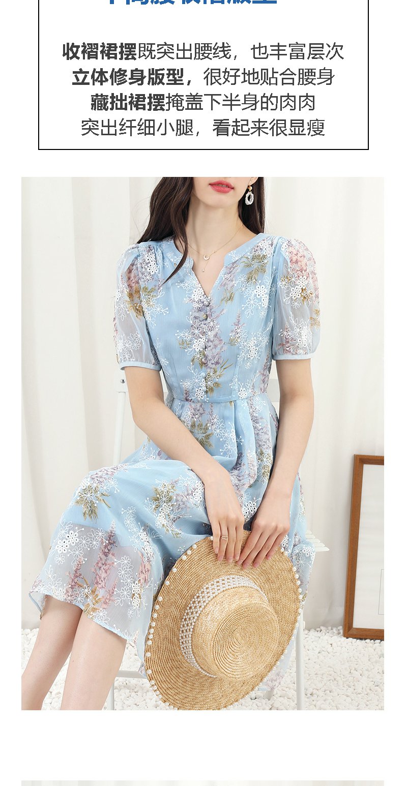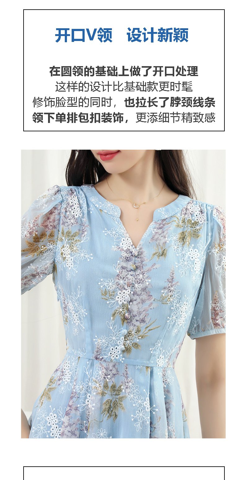 未风蓝色雪纺绣花连衣裙女夏2024夏季新款气质泡泡袖遮肉长款裙子