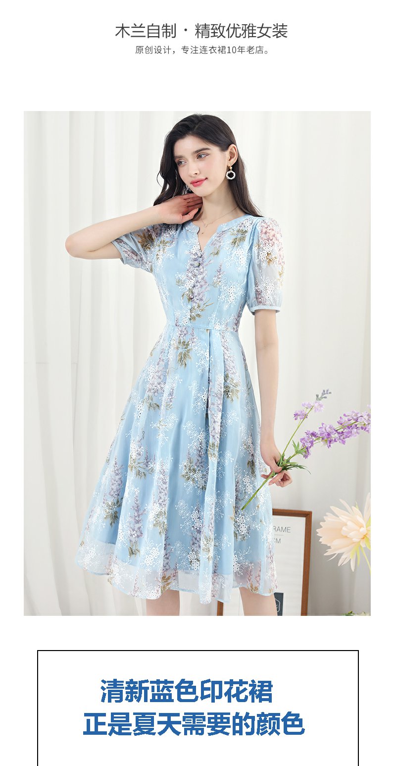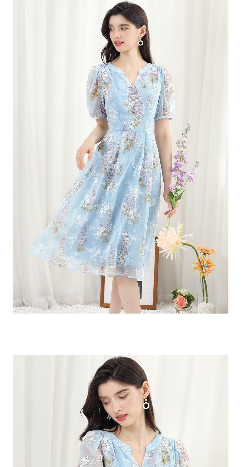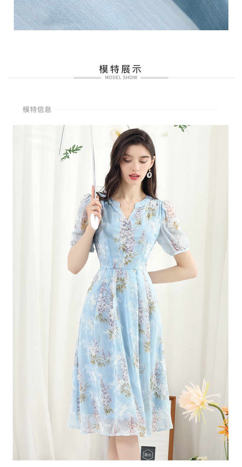 未风蓝色雪纺绣花连衣裙女夏2024夏季新款气质泡泡袖遮肉长款裙子