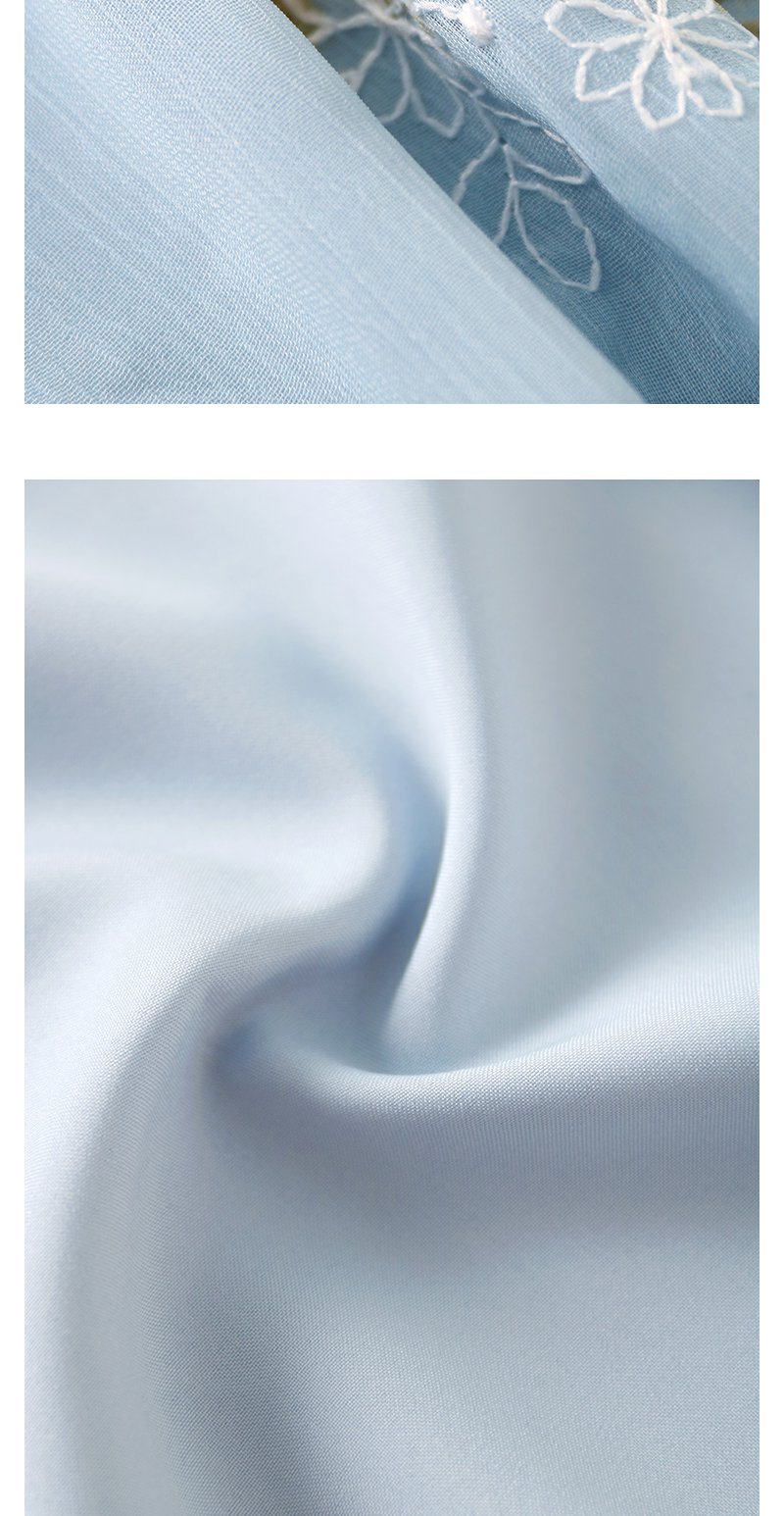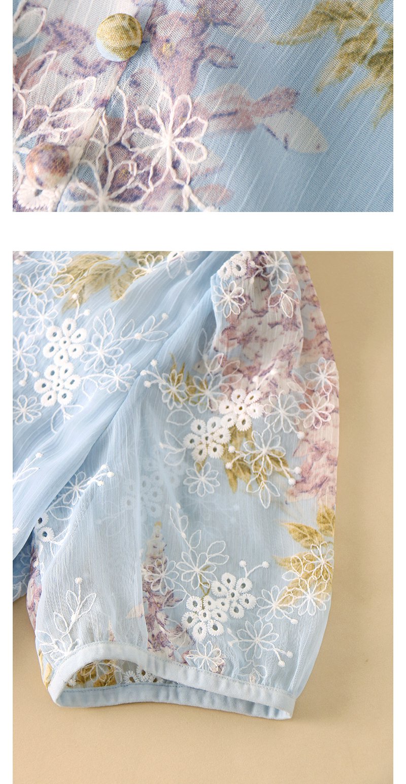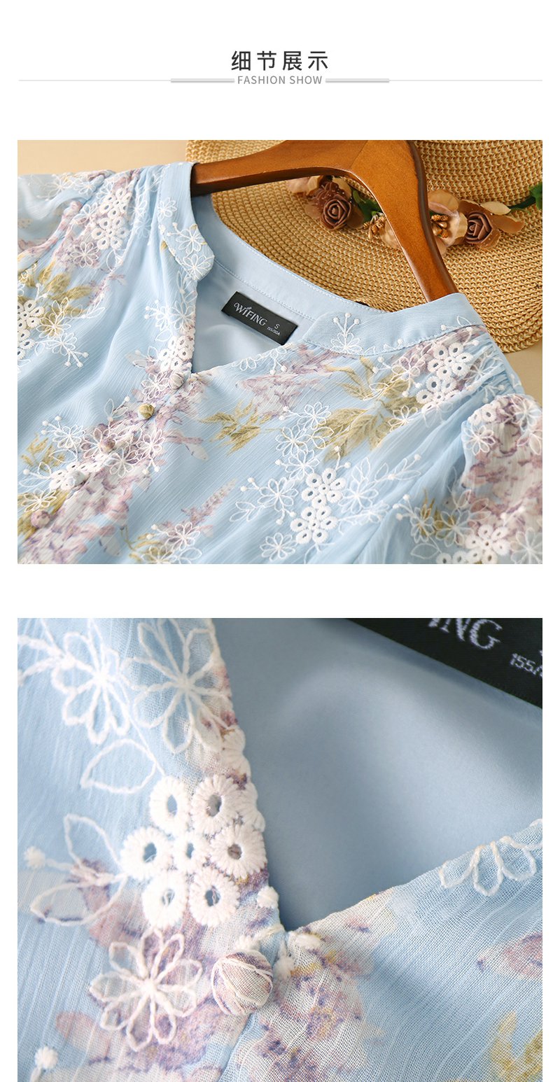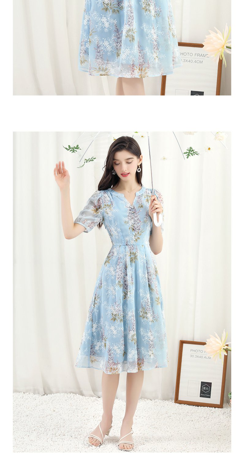 未风蓝色雪纺绣花连衣裙女夏2024夏季新款气质泡泡袖遮肉长款裙子