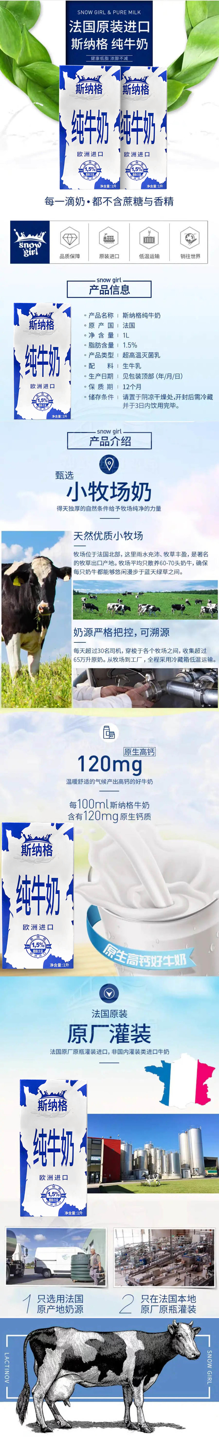 法国进口斯纳格纯牛奶营养学生成人早餐1.5%低脂 1L/盒