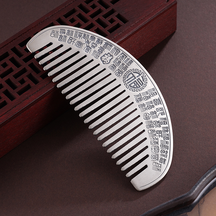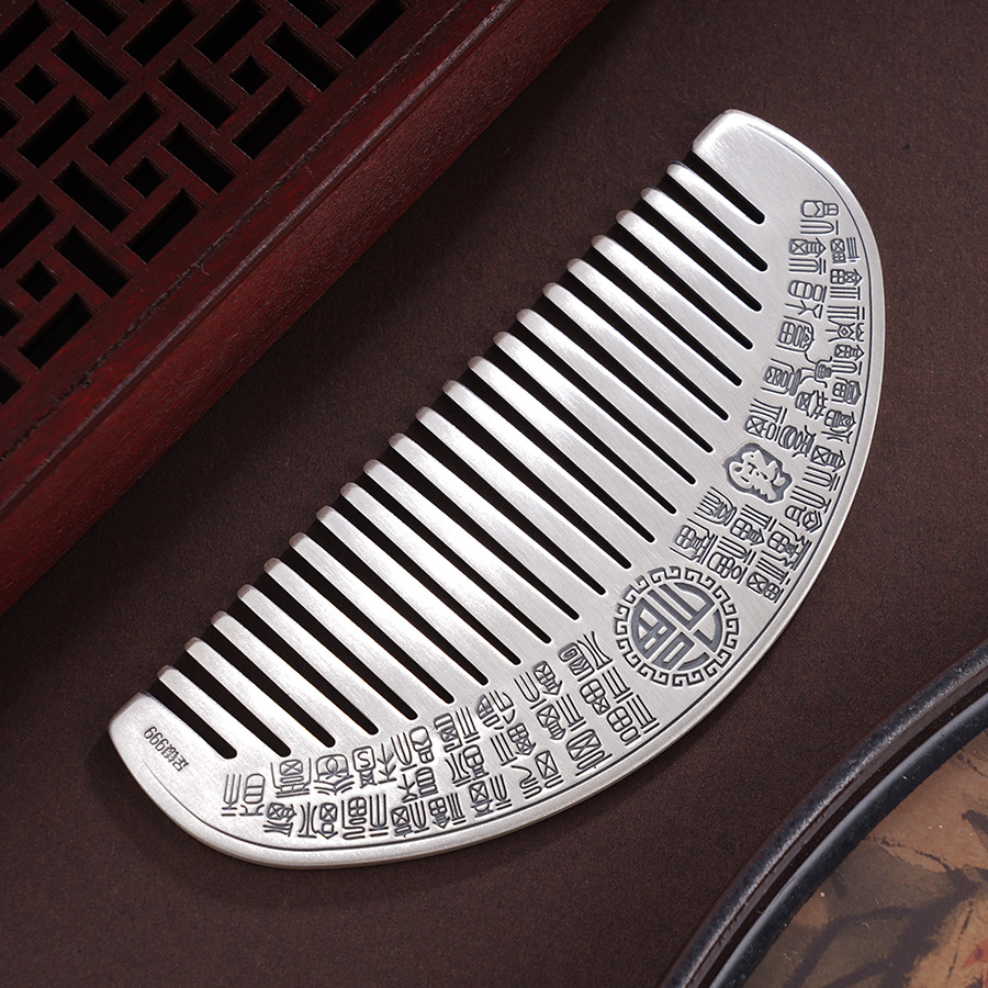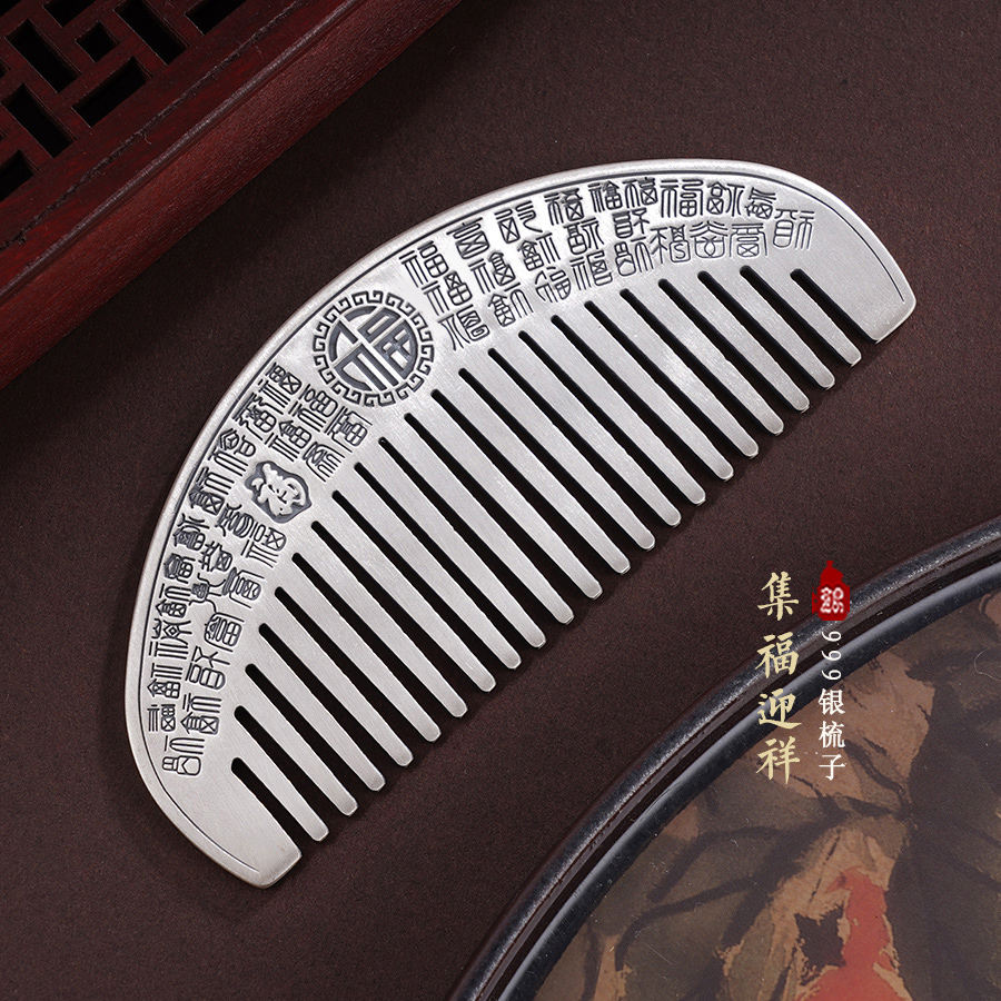【寓意】:银梳浮雕百福纹样,整体古朴端庄,寓意福气满满,幸福康宁。日常使用,悦神爽志,一梳百顺,常梳常福。