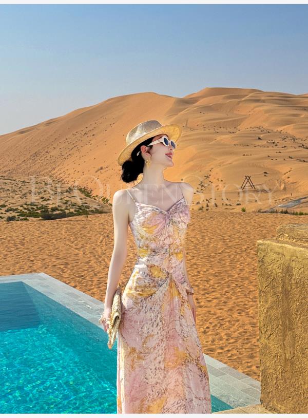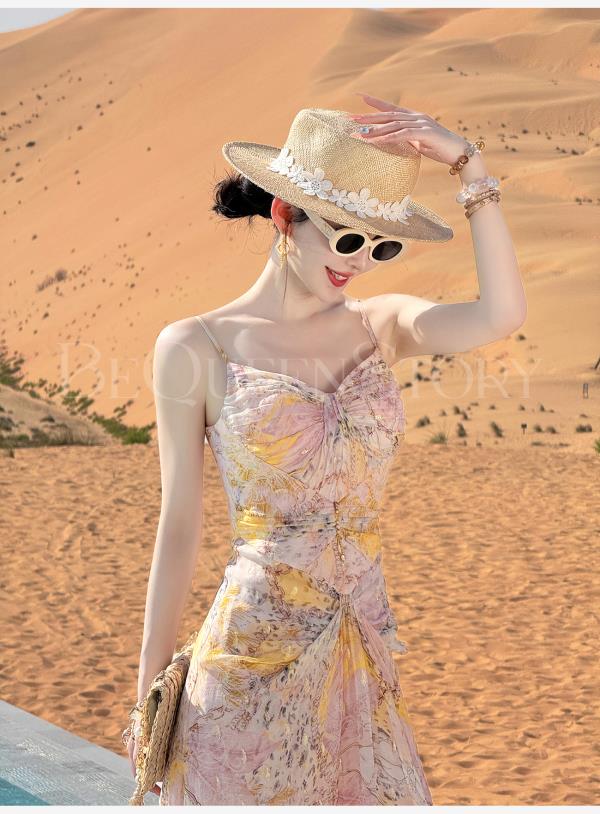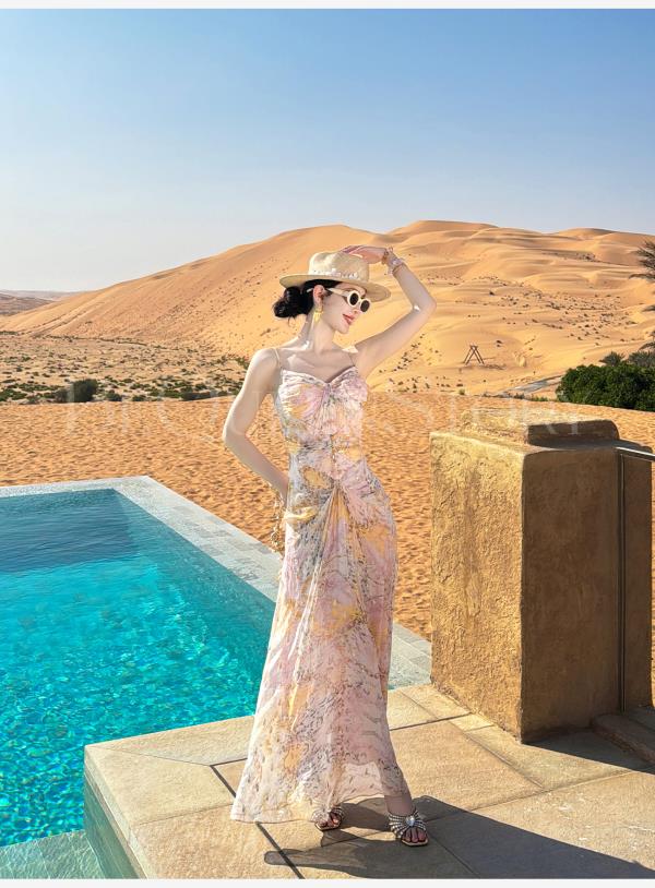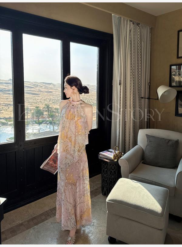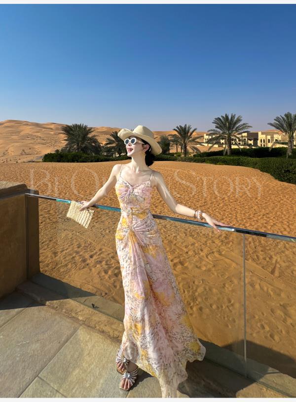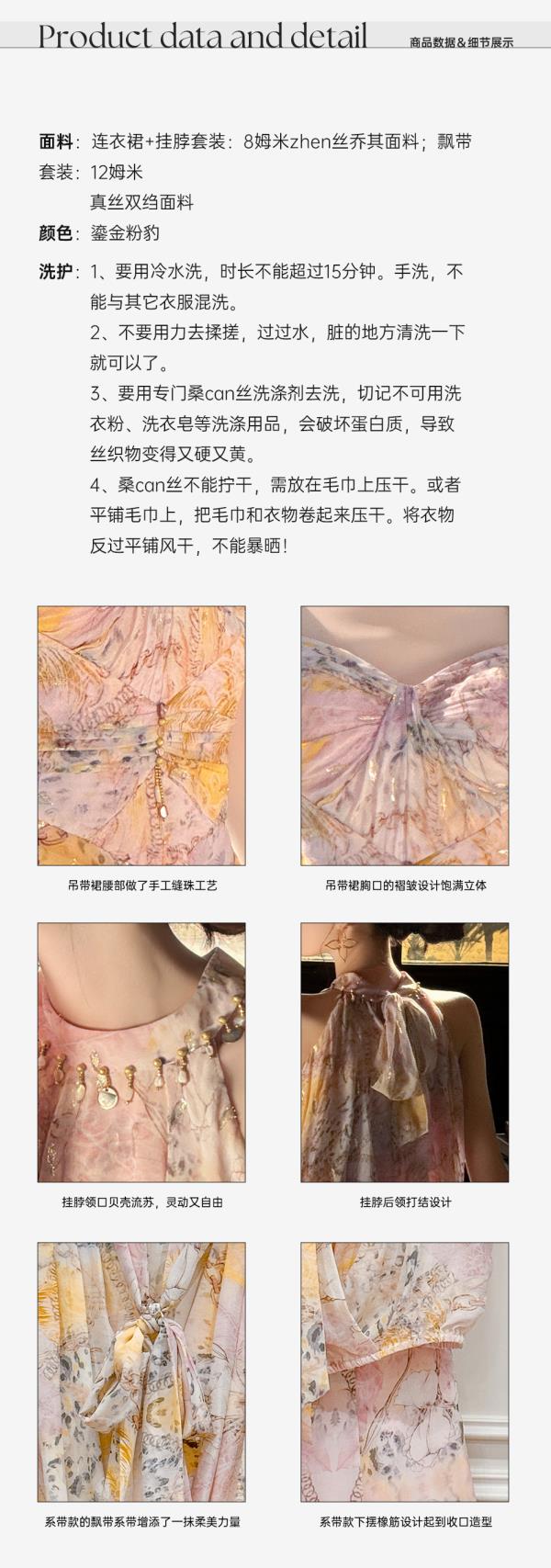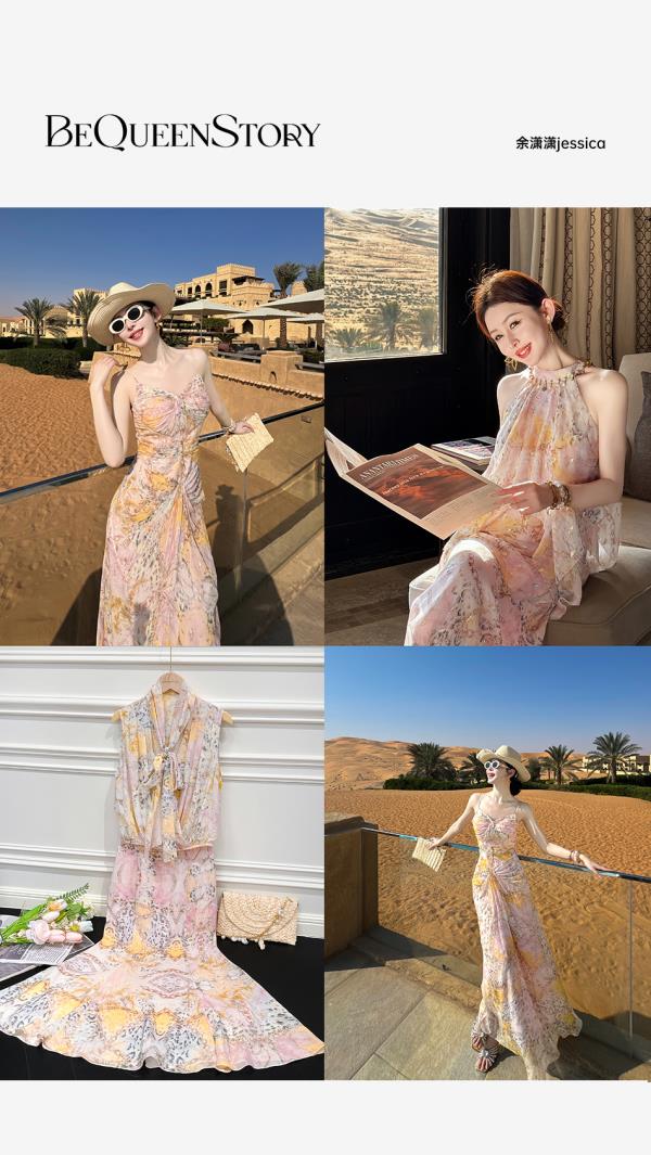 余潇潇【鎏金粉豹】2025春装新款欧若风印花桑蚕丝吊带连衣裙&套装