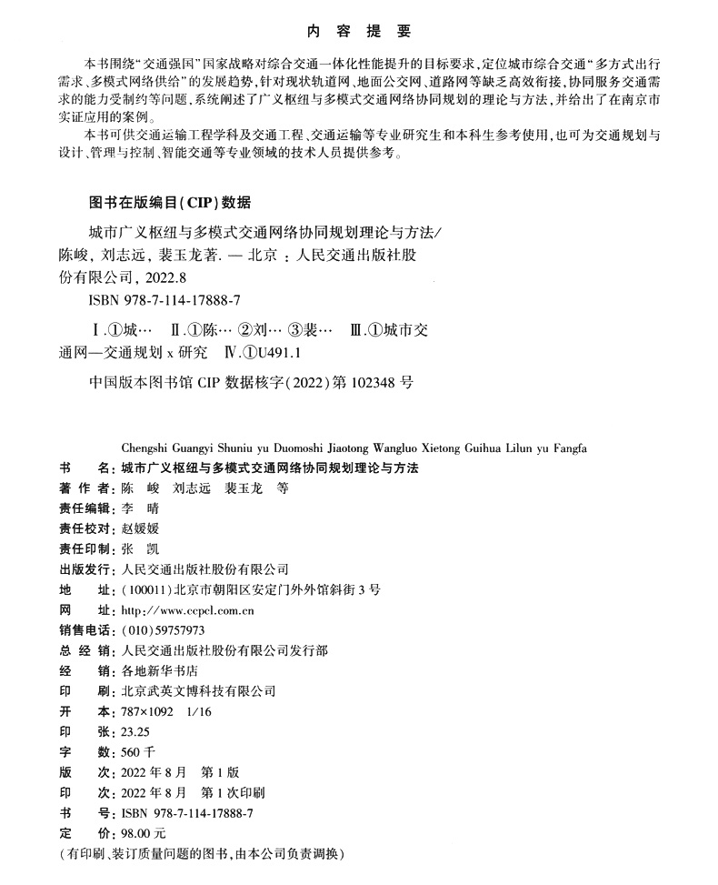书名:城市广义枢纽与多模式交通网络协同规划理论与方法