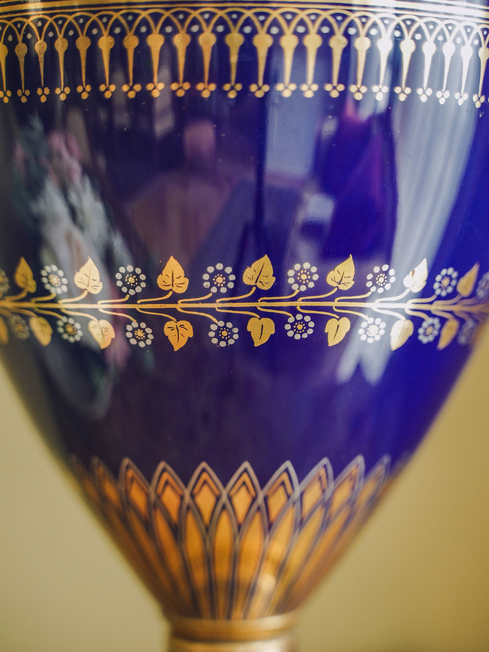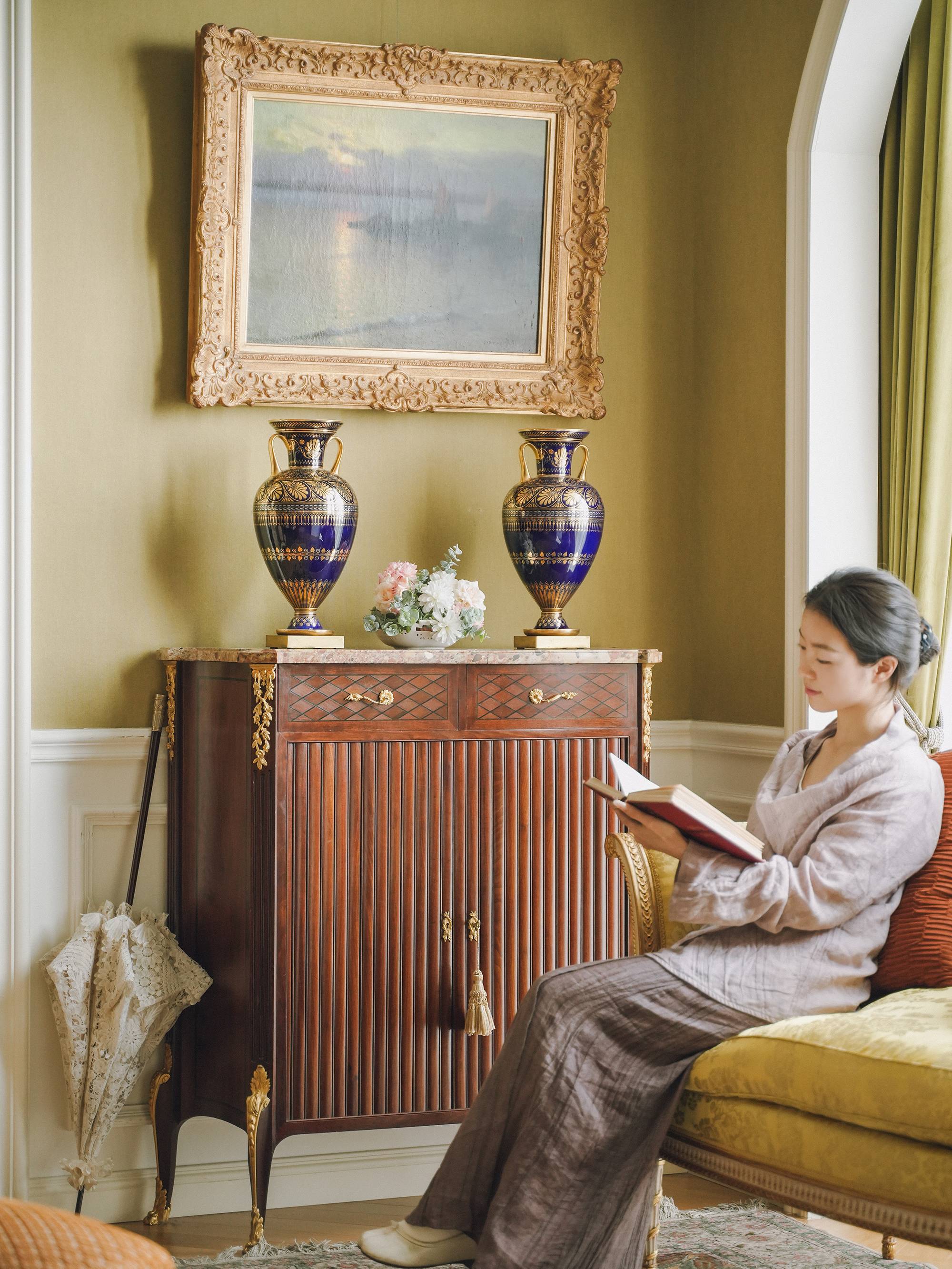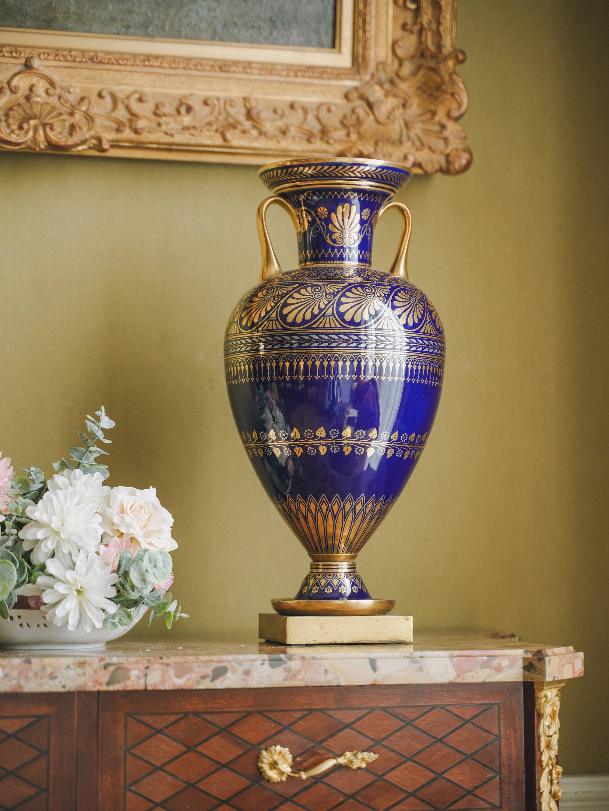 独角鹿西洋古董1845年法国御窑塞弗尔签名出品手绘描金棕榈叶纹主题双耳方底座伊特鲁利亚对瓶
