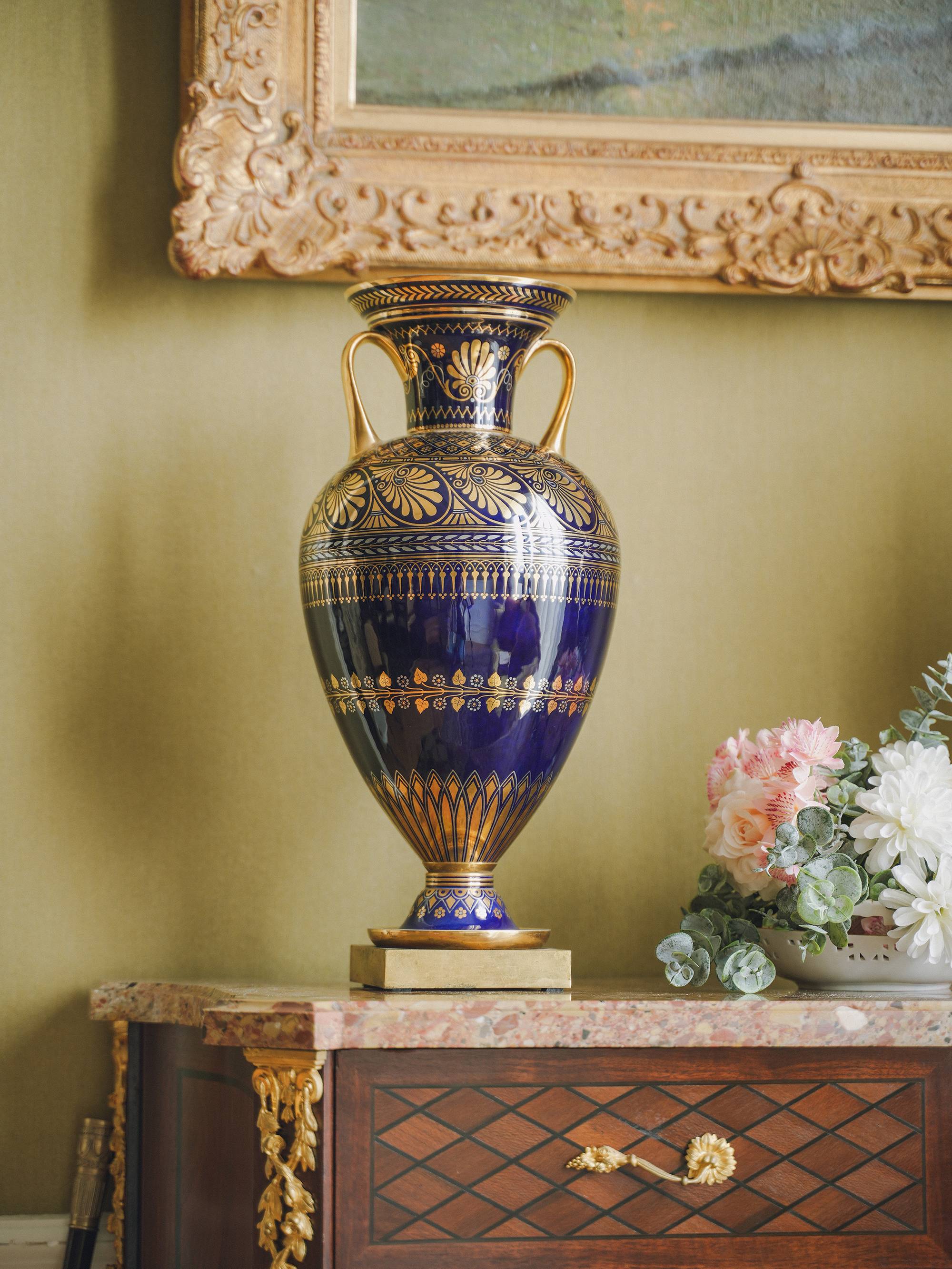 1845年法国御窑塞弗尔签名出品手绘描金棕榈叶纹主题双耳方底座伊特鲁利亚对瓶