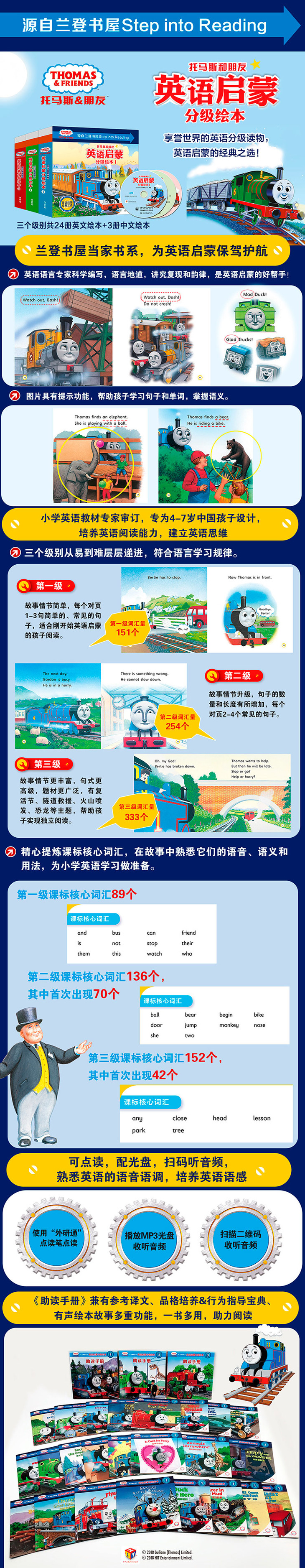 《托马斯和朋友英语启蒙分级绘本》是从兰登书屋Step into Reading 系列引进的英语分级读物,共3个级别,每个级别包含8册英文故事书、1册中文助读手册和1张MP3光盘,适合4-7岁的孩子英语阅读启蒙使用。这套书由兰登书屋邀请英语语言专家编写,语言地道,词汇和句式简单,讲究复现和韵律,注重培养孩子的英语阅读能力,让孩子在高质量的英语阅读中加强对英语语音语义的感知能力,实现英语启蒙。3个级别从易到难层层递进,帮助孩子逐步提升英语阅读能力,培养英语语感,建立英语思维。