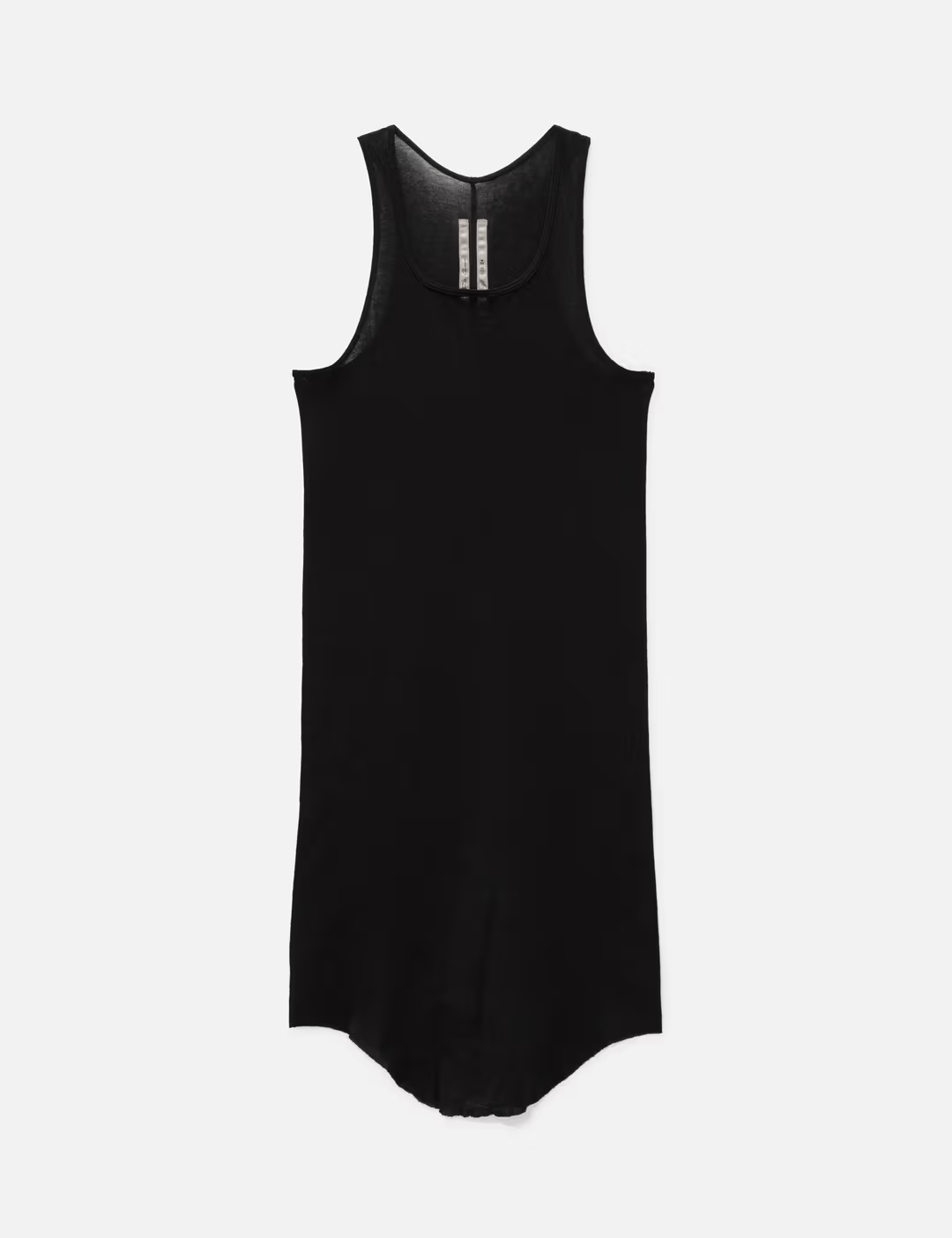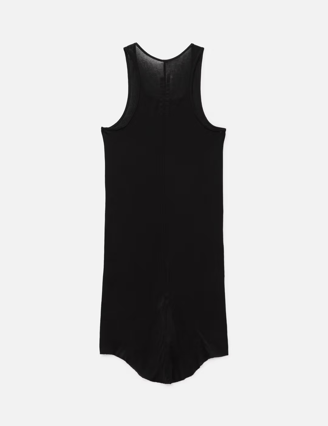 这款基本款罗纹背心长及臀部,圆润毛边剪裁,前后下摆略微收拢。圆领设计,纤细肩带与略带工字形的后背融为一体。标志性的单线缝合贯穿后背中央脊柱。