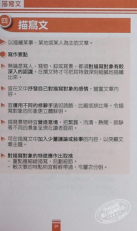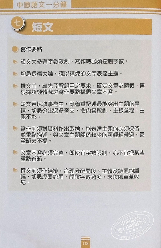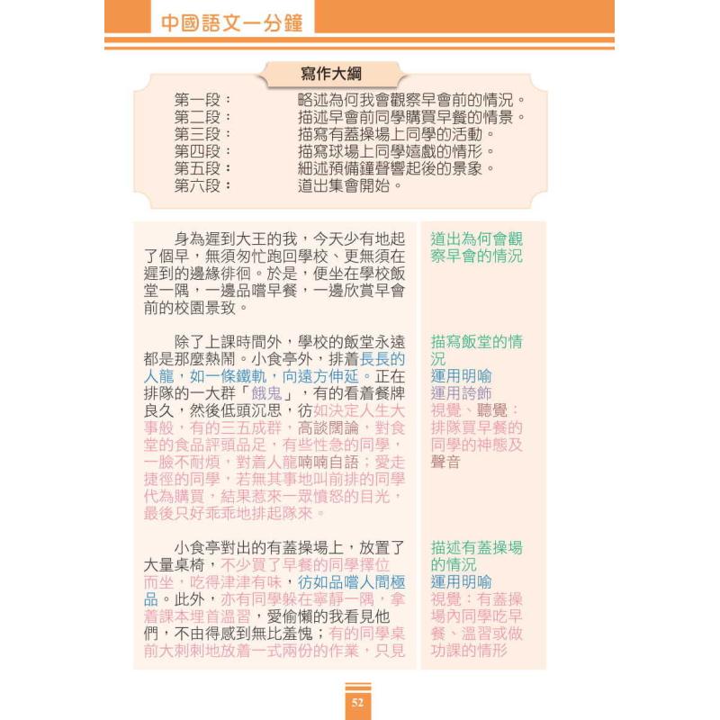 • 本书详述记叙文、描写文、抒情文、议论文及短文的写作要点及技巧,并以多篇范文为教材,说明分析、拆解题目的方法,以及提出一些宜在写作前思考的问题,引导同学构思文章内容。 此外,书中亦详列范文中所运用的写作及修辞技巧,让同学学习如何活用各种写作手法; 而附录中更分类列出数百个常用词汇,供同学参考使用。