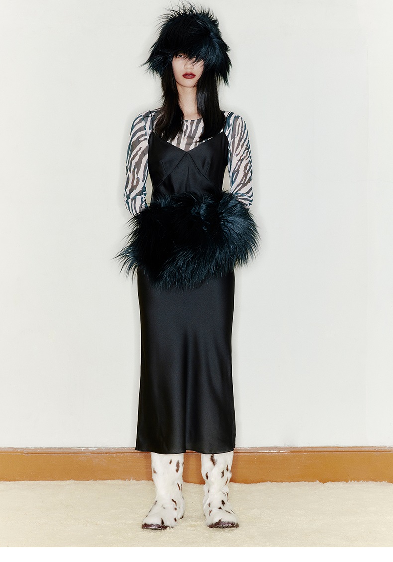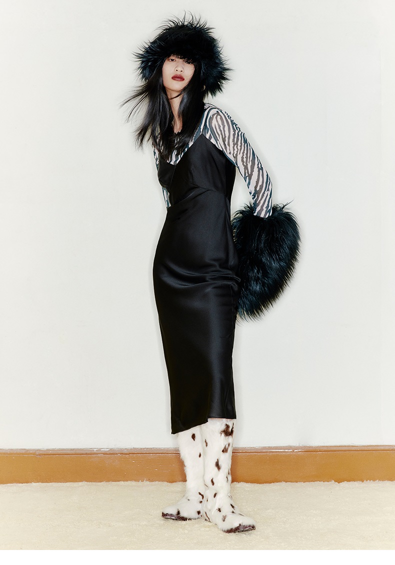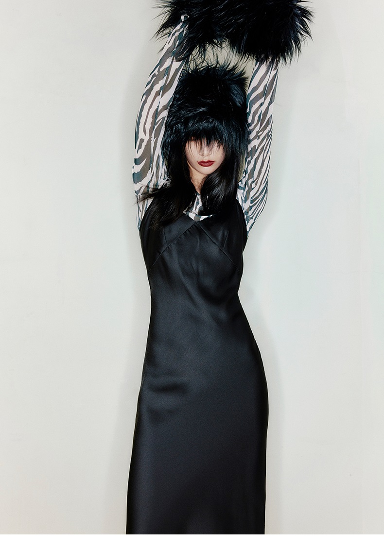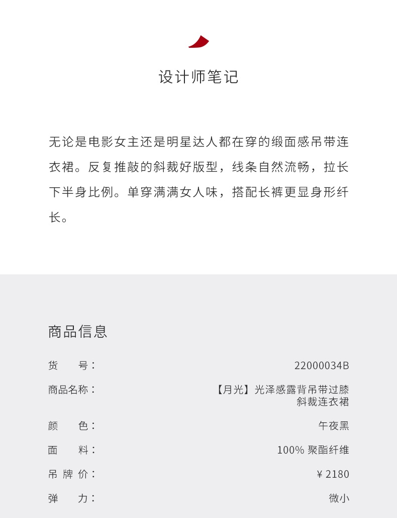 【月光】光泽感露背吊带过膝斜裁连衣裙/22000034A