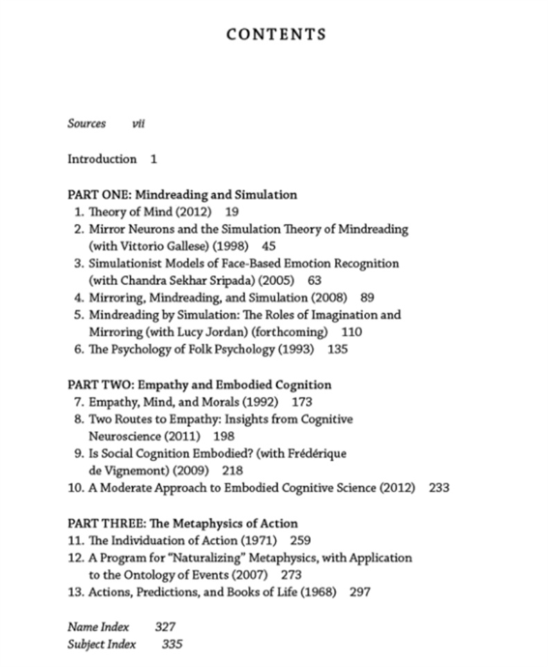 本卷收集了阿尔文·戈德曼的文章,其中许多文章在具体化这种 "模拟 "或 "移情 "的读心术方面发挥了重要作用,并表明它如何被心理学和认知神经科学的新发现所证实。当你观察他人的大脑时,你的大脑区域会与他人的大脑产生共鸣。当你观察到他人在面部表情中表现出他们的感受,或者看到他们即将经历痛苦的刺激,或者仅仅是手臂上的一个触摸,你的大脑区域就会与他人的大脑产生共鸣。本卷中的文章探讨了认知科学哲学的一系列主题,从具身认知到行动和事件的形而上学。行动和事件的形而上学。"具身认知 "是认知科学哲学中当前一系列建议的套话。其中一些建议要求对认知科学进行彻底的重塑,另一些建议则要求对反复的实验发现作出更有分寸的回应,即身体或者身体的表征占据了整个认知科学。身体的表征在认知中的作用比以前的认识更突出。戈德曼以一种为大量科学证据带来连贯性和统一性的理论潜入这一领域。其他文章重温了他早期关于行动个体化的工作,但以心理学的方式重新配置了它。心理学的转折。结尾篇文章为读者准备了一个未来的场景:一本书向你展示了你过去的生活、你现在的想法,甚至你即将做出的决定,这些都非常准确。你应该如何回应它?