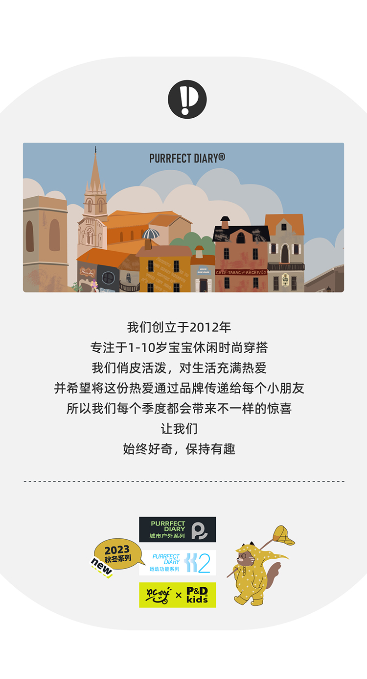 - Purrfect-Diary专注于贴近自然随性的穿着概念,轻奢平价的童装文化传播,在产品设计上更加注重婴童穿着的舒适性、安全性、更出众的国际化品牌,将欧美的育婴文化在中国进行深入的传播与推广。