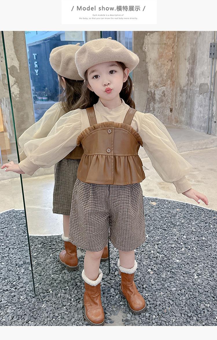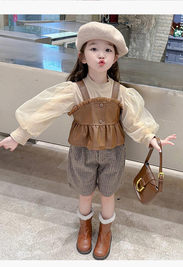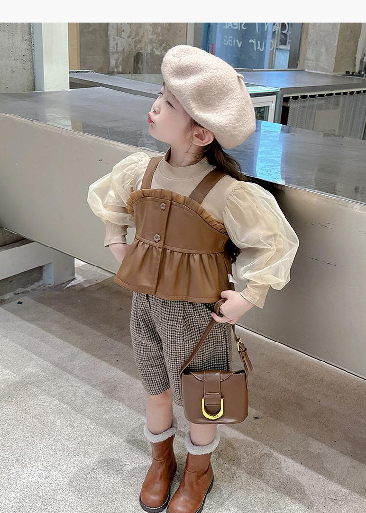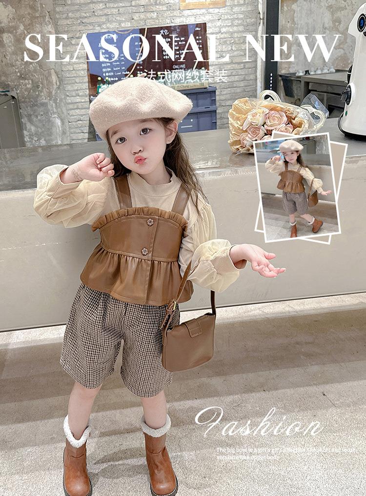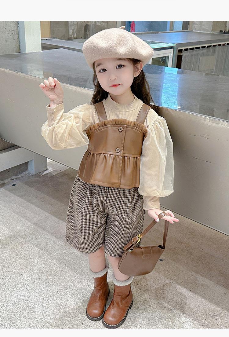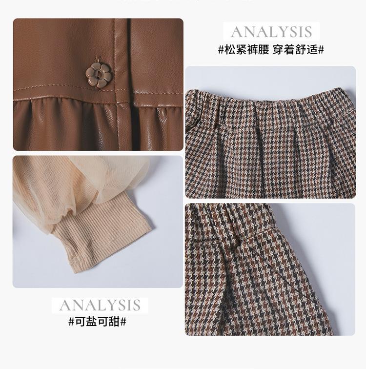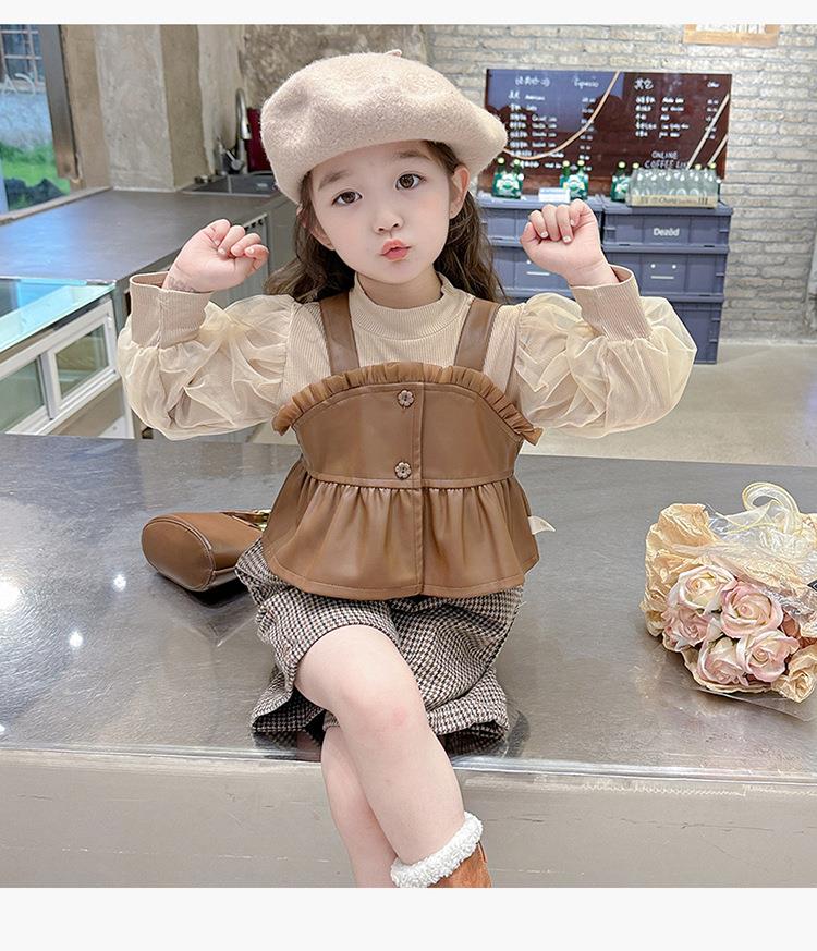 女童小香风皮马甲三件套2024年春季新款韩版套装童装