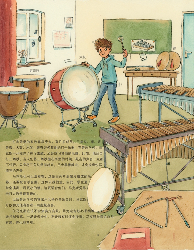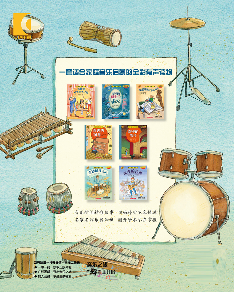 《音乐绘本亲子读·奇妙的笛子》 《音乐绘本亲子读·奇妙的吉他》 《音乐绘本亲子读·奇妙的打击乐》《音乐绘本亲子读·奇妙的钢琴》本系列为儿童音乐启蒙绘本,引进自德国于特劳伊贝尔音乐出版社。该系列中,每本图书围绕一个主题,如作曲家、乐器、音乐常识等,用故事、音乐与绘画的交融,为孩子们生动地介绍了关于音乐的各方面知识。本套系列中的乐器系列,每本以绘本的形式介绍了故事中主人翁学习笛子、钢琴、吉他和打击乐的故事,在讲述的过程中介绍了每件乐器的构造和乐器的历史发展,并附带了经典的乐曲。图文音像配套的童书,帮助孩子们在阅读故事的同时对音乐有更形象的感受。