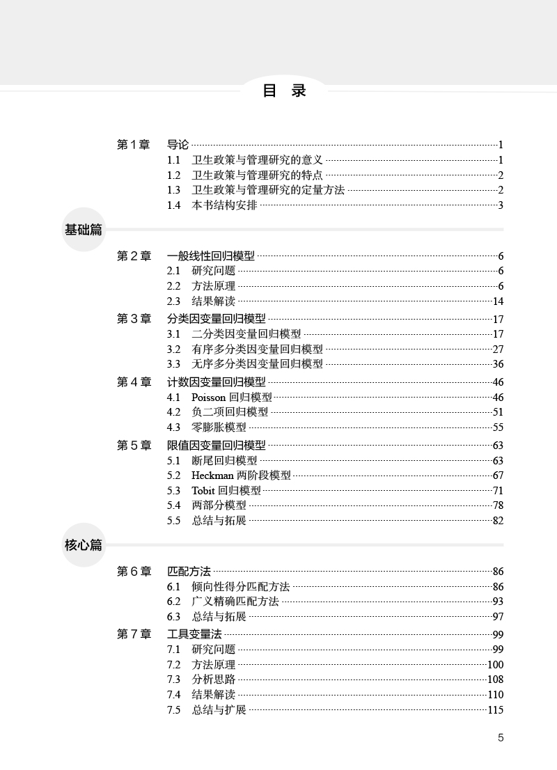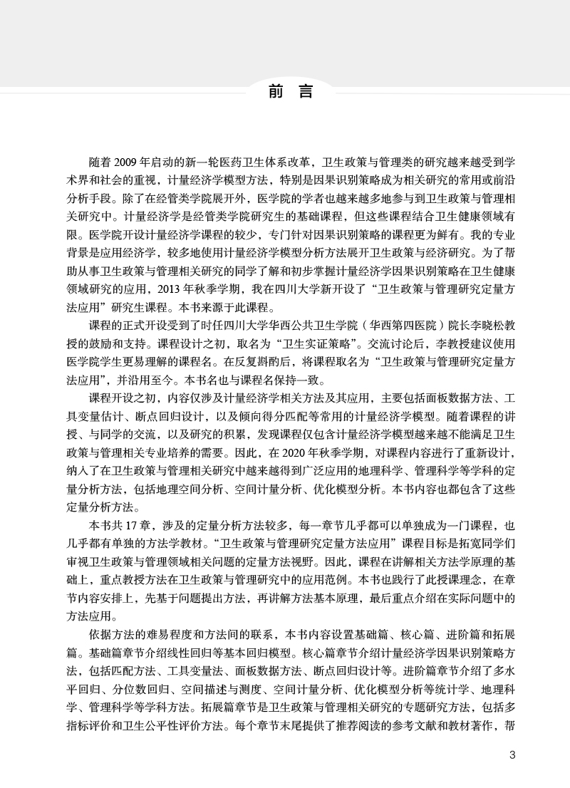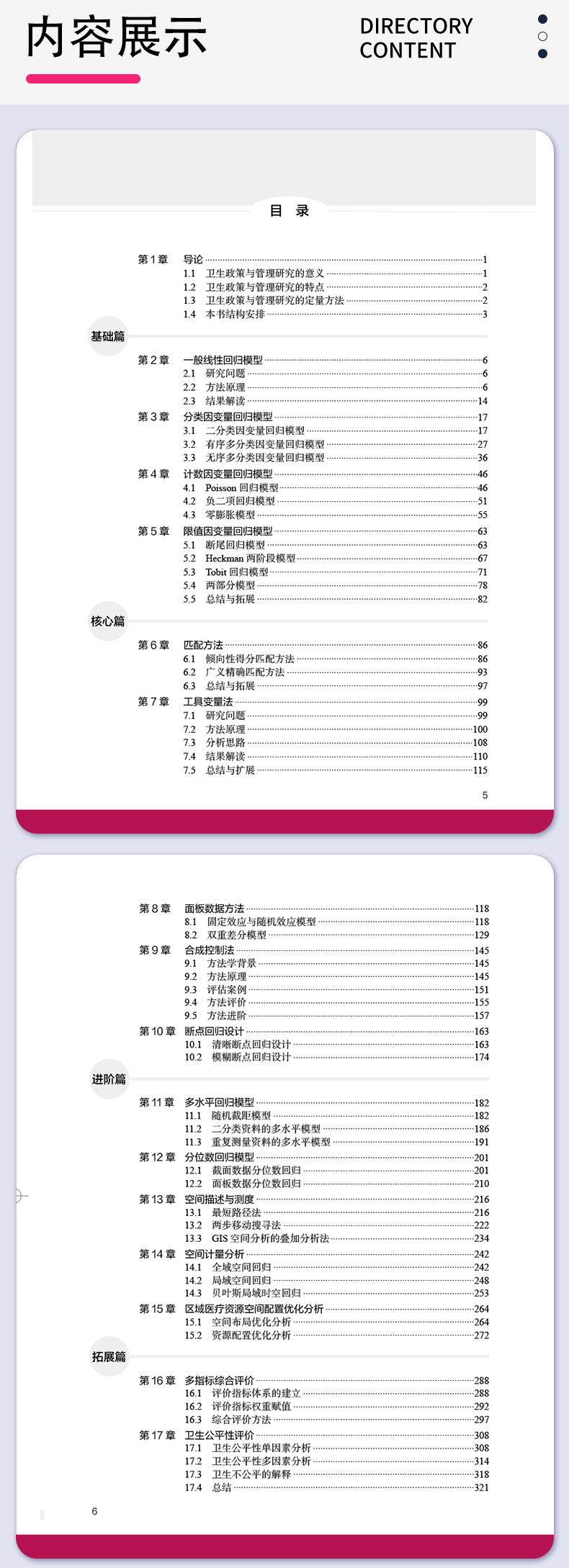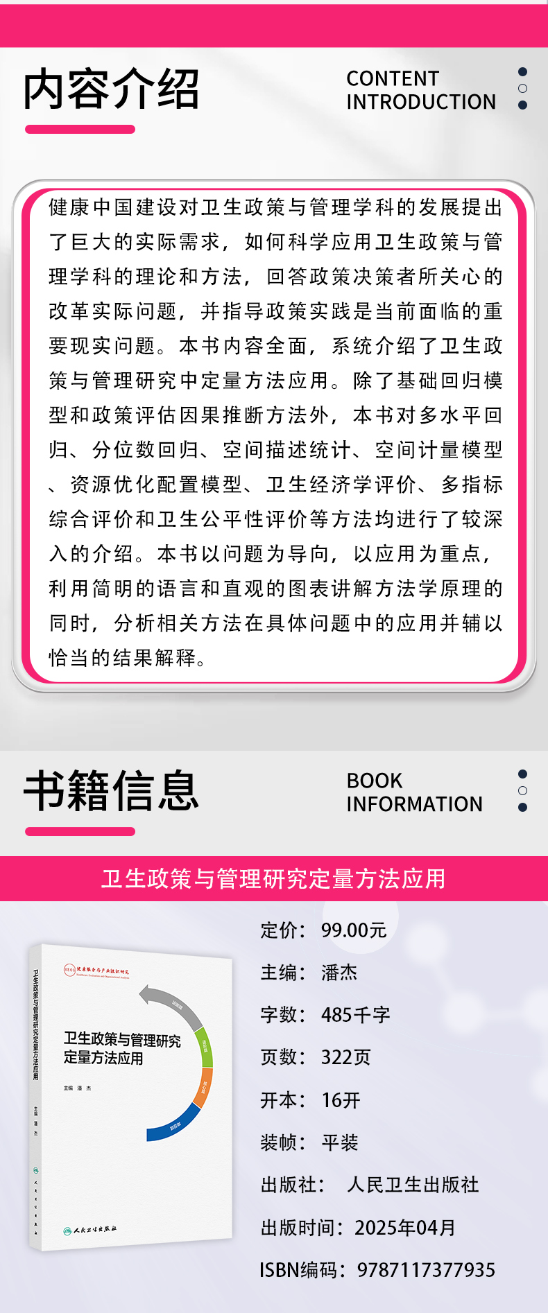 健康中国建设对卫生政策与管理学科的发展提出了巨大的实际需求,如何科学应用卫生政策与管理学科的理论和方法,回答政策决策者所关心的改革实际问题,并指导政策实践是当前面临的重要现实问题。本书内容全面,系统介绍了卫生政策与管理研究中定量方法应用。除了基础回归模型和政策评估因果推断方法外,本书对多水平回归、分位数回归、空间描述统计、空间计量模型、资源优化配置模型、卫生经济学评价、多指标综合评价和卫生公平性评价等方法均进行了较深入的介绍。本书以问题为导向,以应用为重点,利用简明的语言和直观的图表讲解方法学原理的同时,分析相关方法在具体问题中的应用并辅以恰当的结果解释。