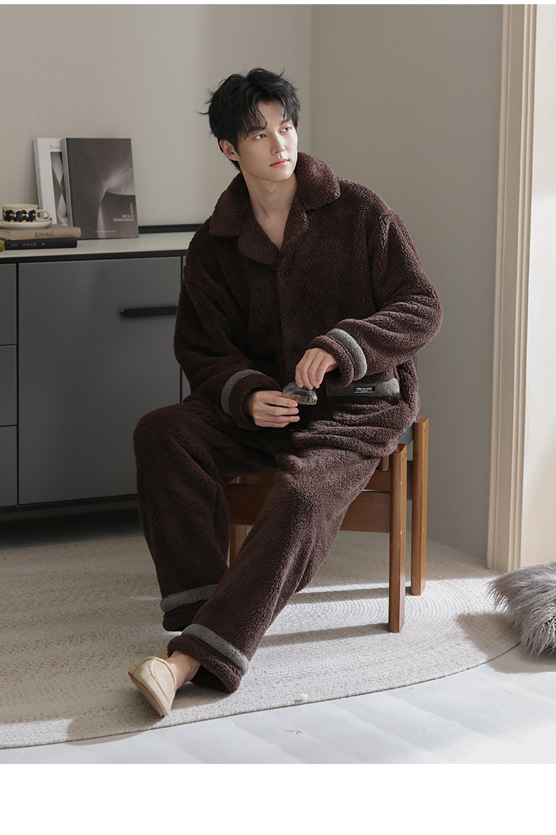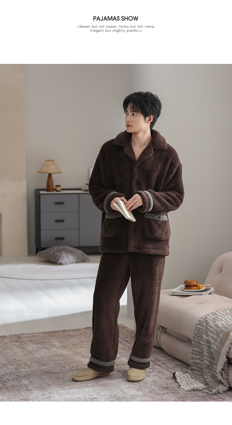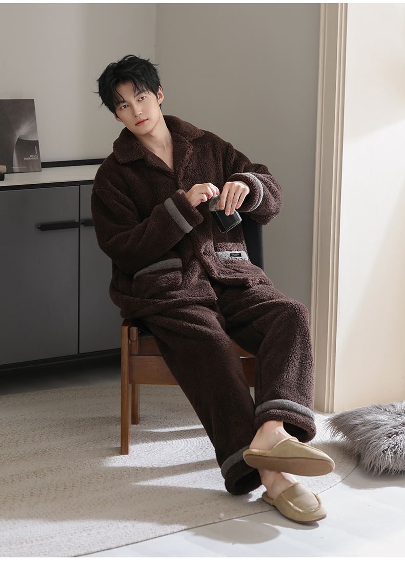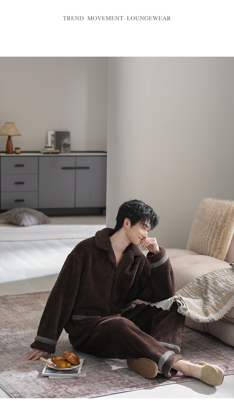 可人儿冬季男士保暖舒棉绒睡衣秋冬休闲翻领男款加厚珊瑚绒家居服