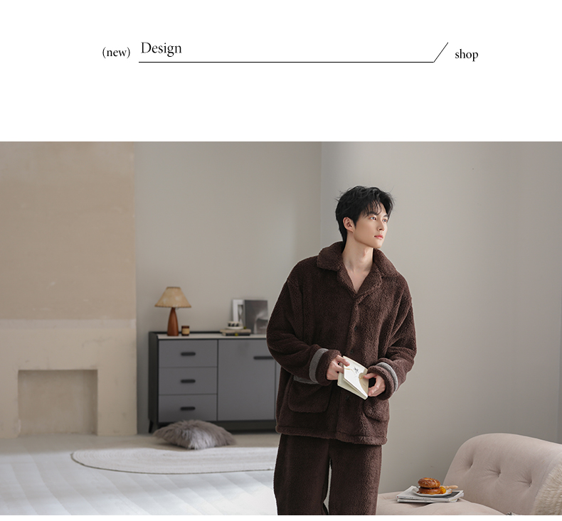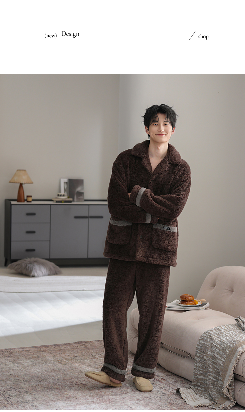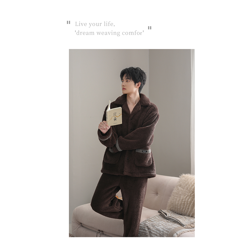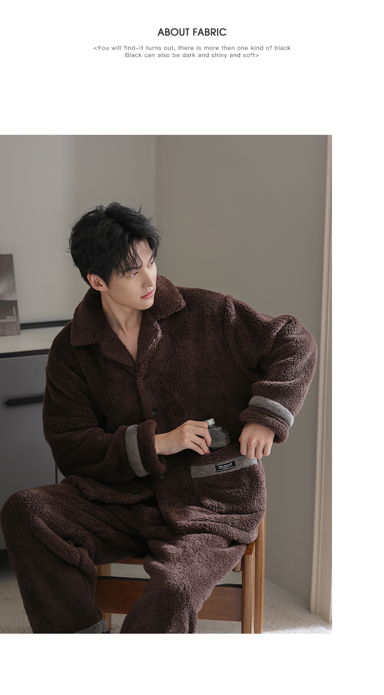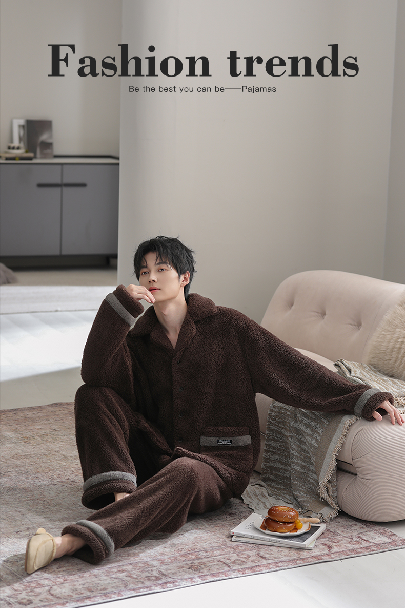 可人儿冬季男士保暖舒棉绒睡衣秋冬休闲翻领男款加厚珊瑚绒家居服