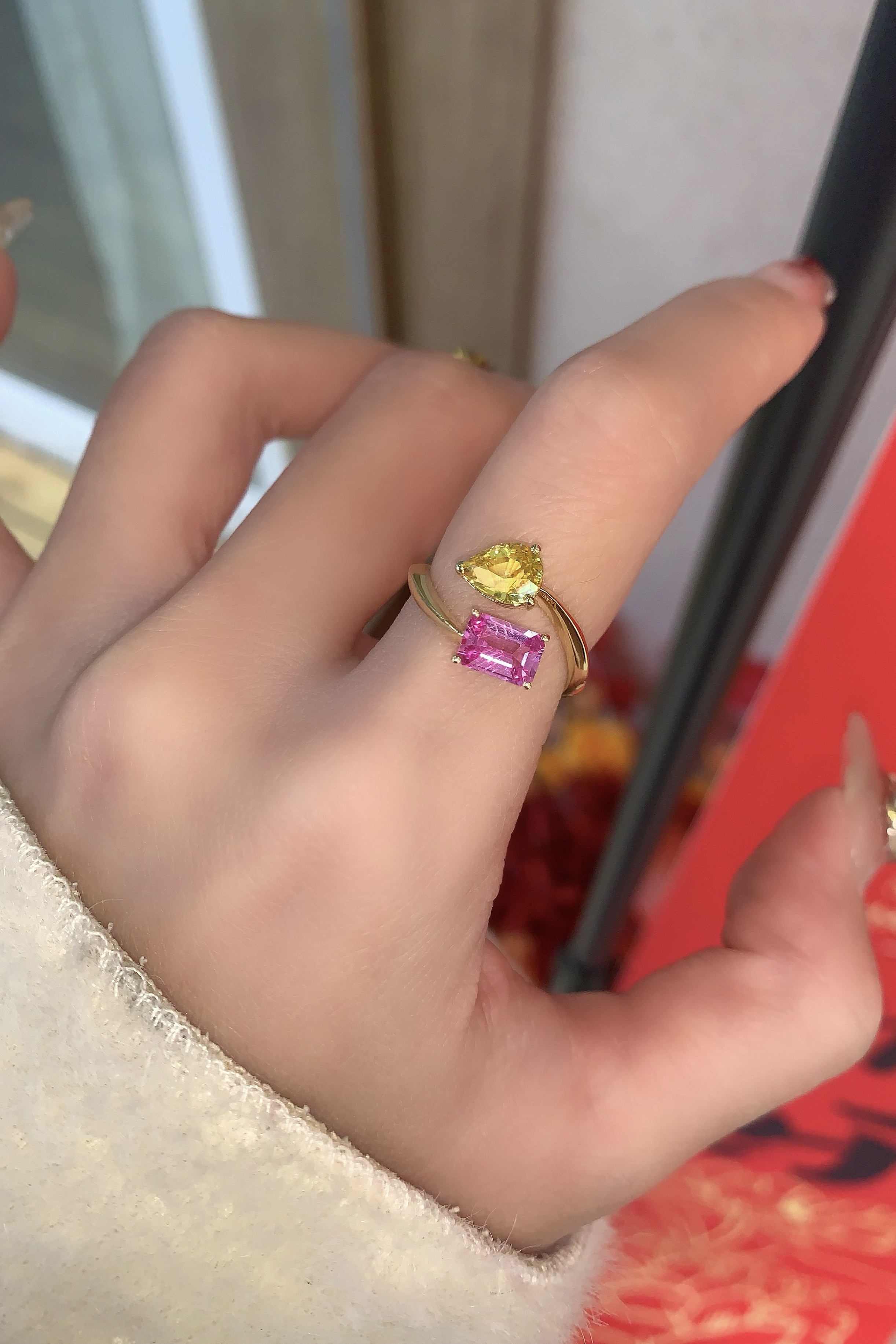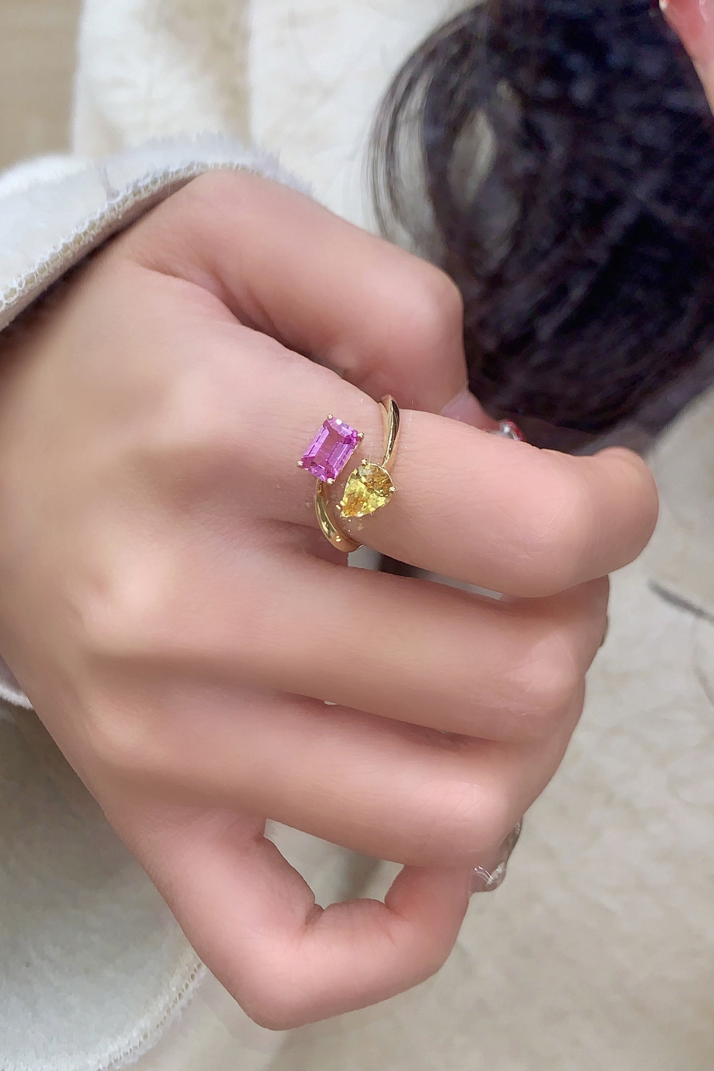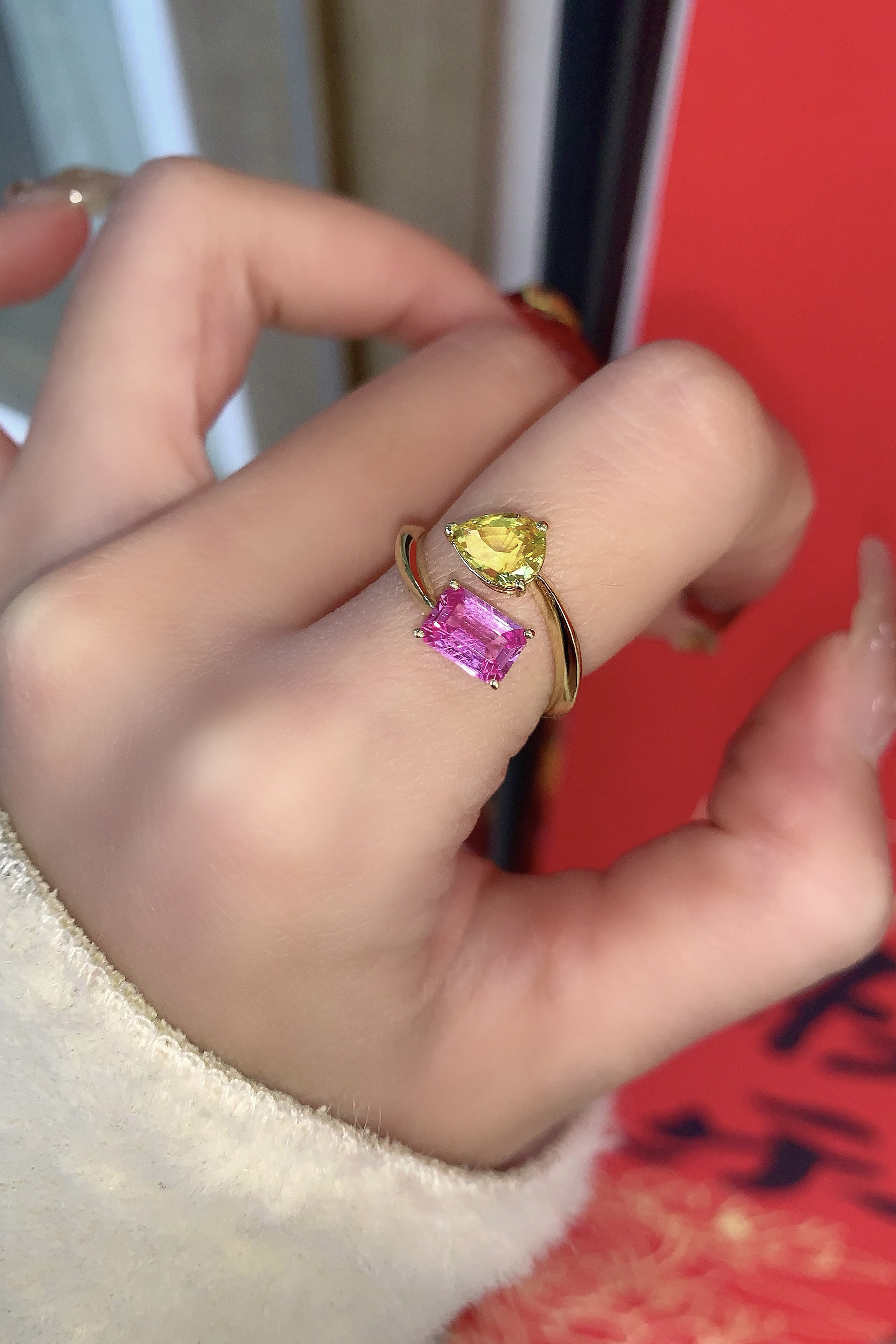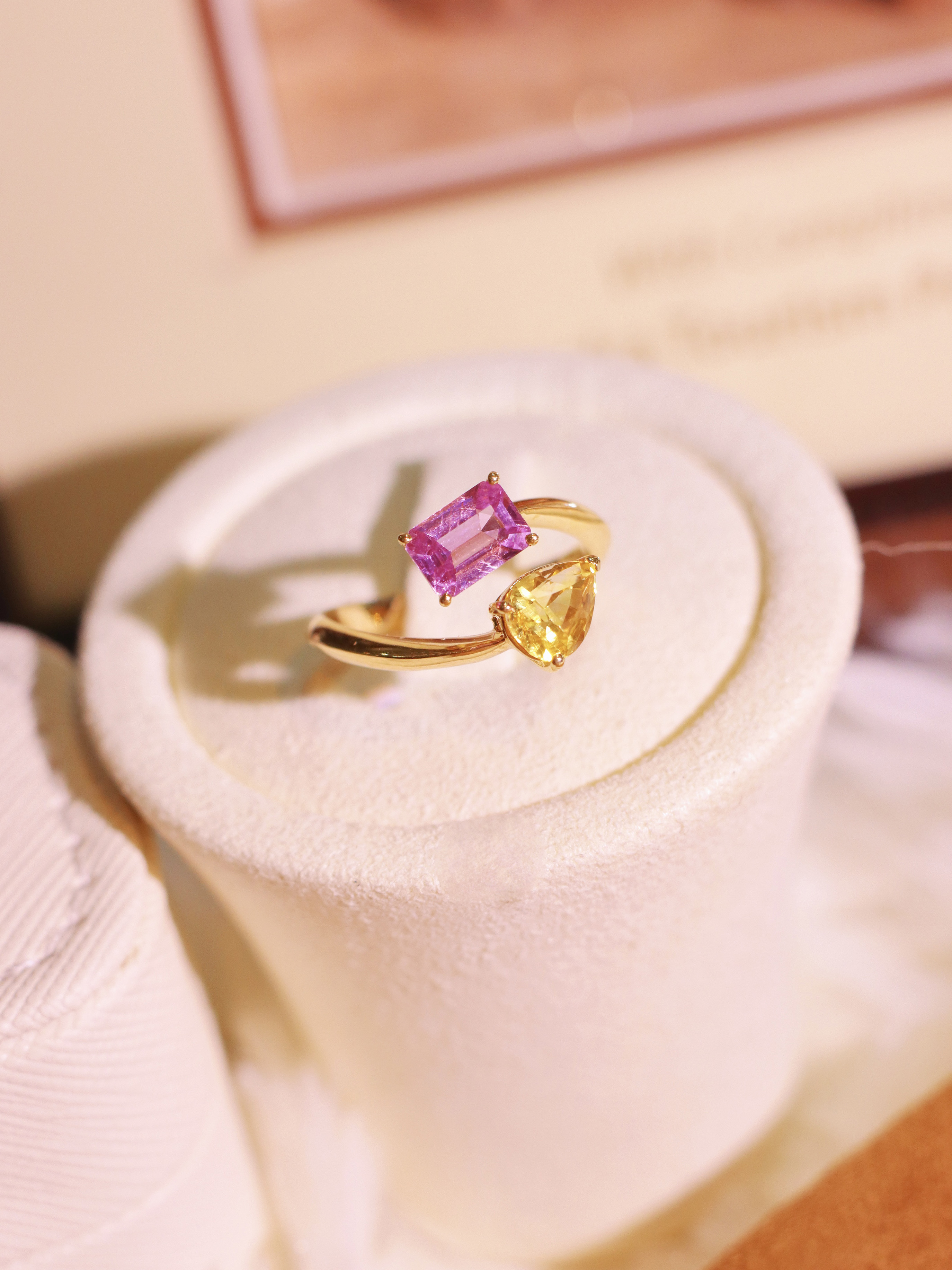 双石款,分别是斯里兰卡黄色蓝宝石和粉色蓝宝石的结合。