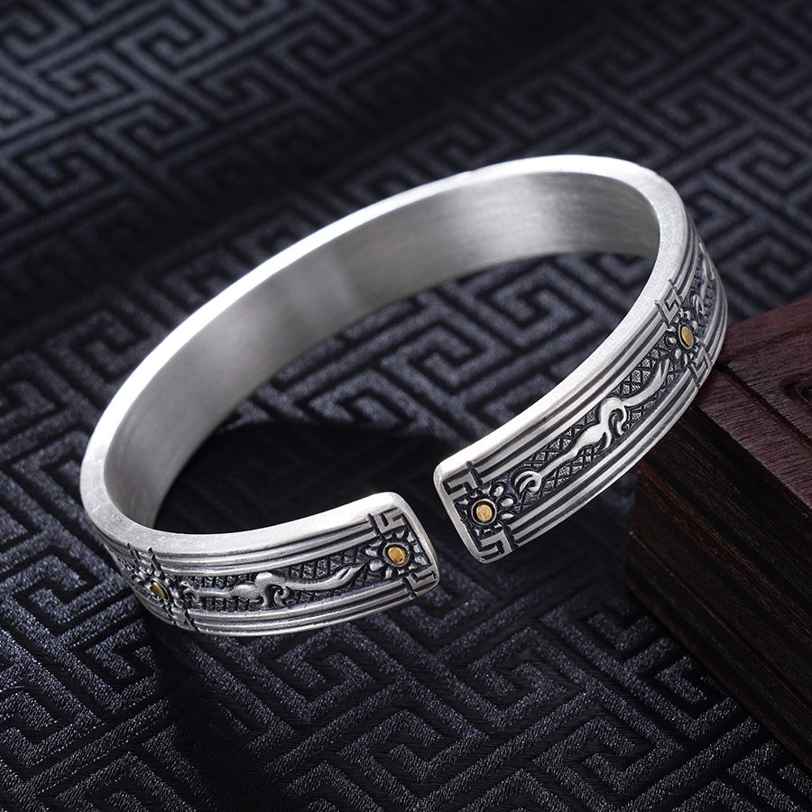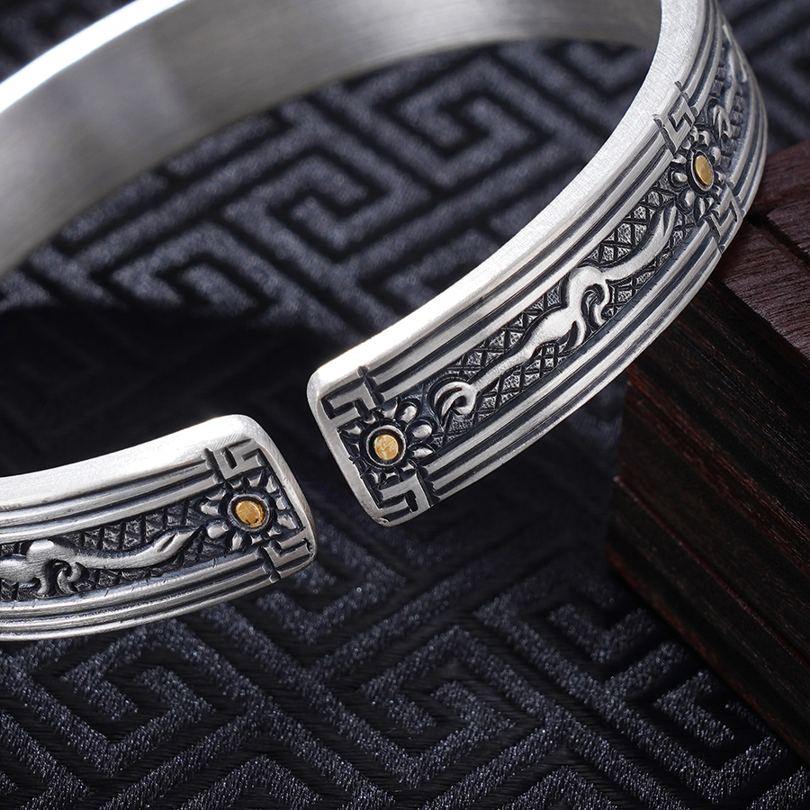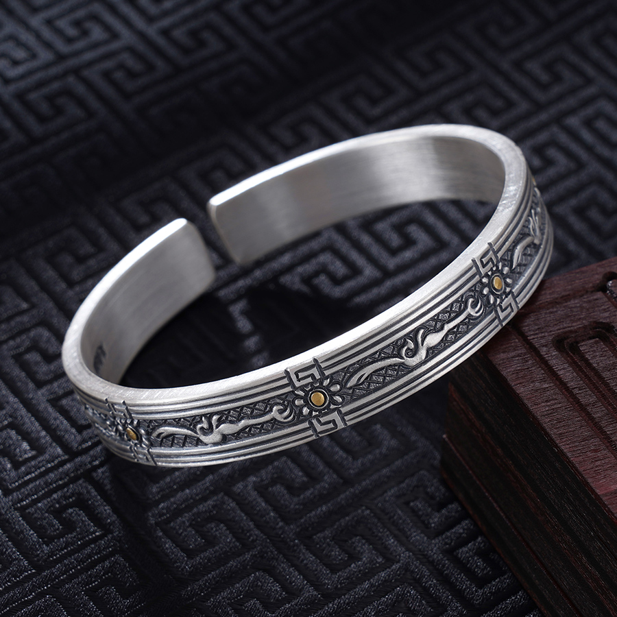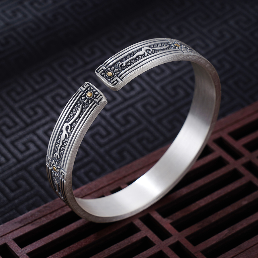 子佩集S999银【山川】手镯【YS032】纯银手镯仿古带金色嵌真金2408