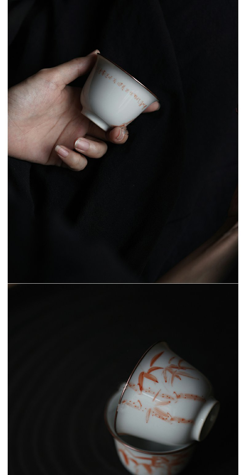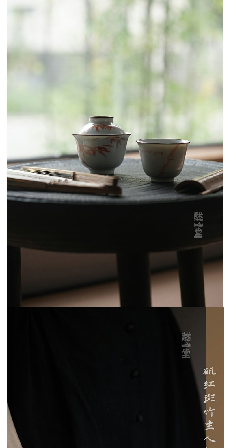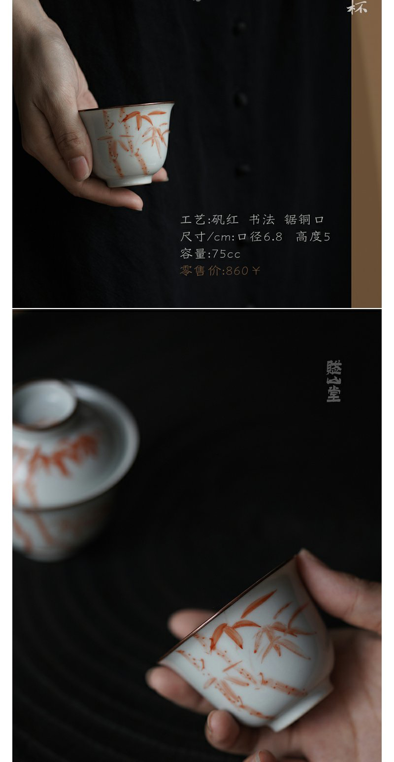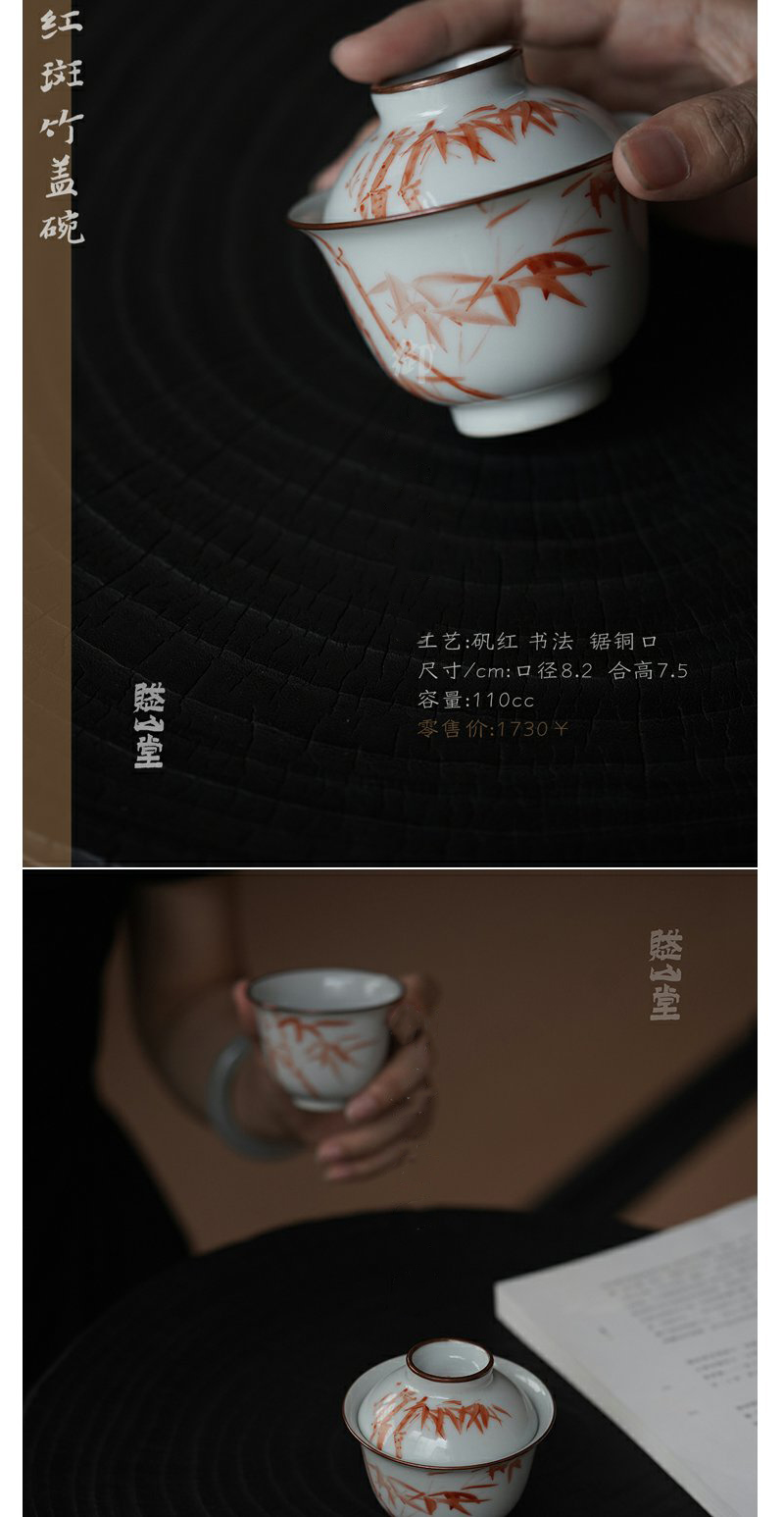 景德镇赋山堂 巩红斑竹铜口盖碗手绘诗文主人杯锔铜口泡茶碗新