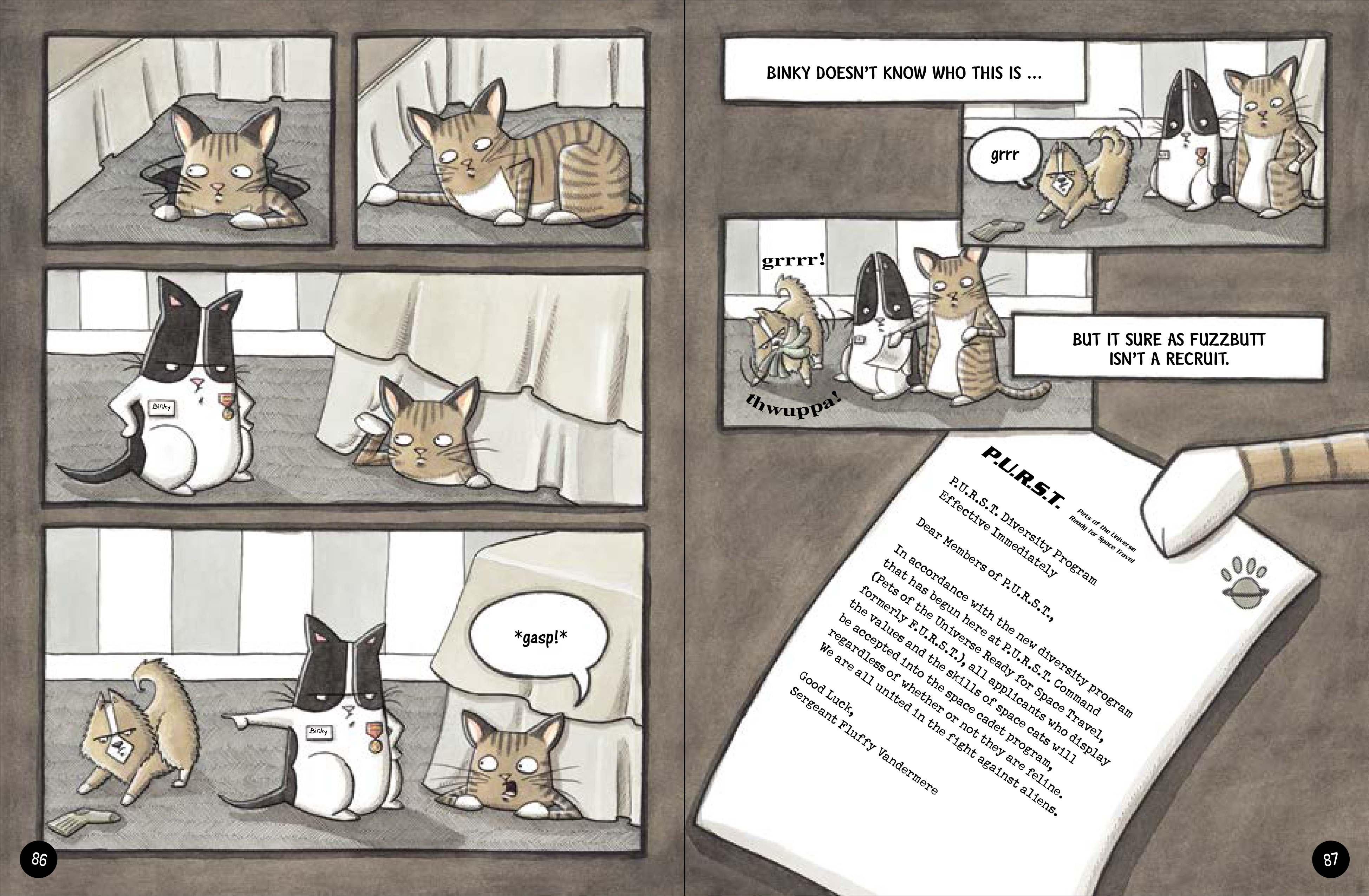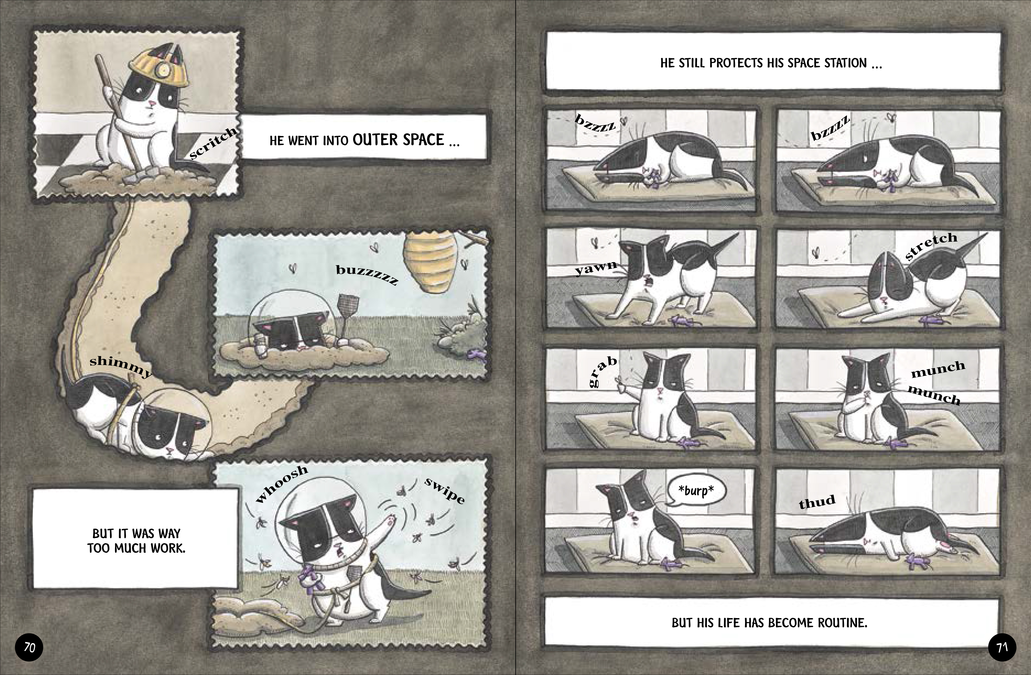 因为这只脑洞大开、戏精十足的猫咪宾奇将带你走进他的太空世界,你会发现原来火箭可以这样制造、一会宇航员居然是这样训练出来的;也会跟随机智勇敢的宾奇与泰迪鼠一起体验外太空之旅的刺激与惊奇......柔和的色调,富于变化的漫画分镜和拟声词,形象鲜明的角色,再配以微妙的冷幽默,所有这些元素融为一体,让孩子忍俊不禁。