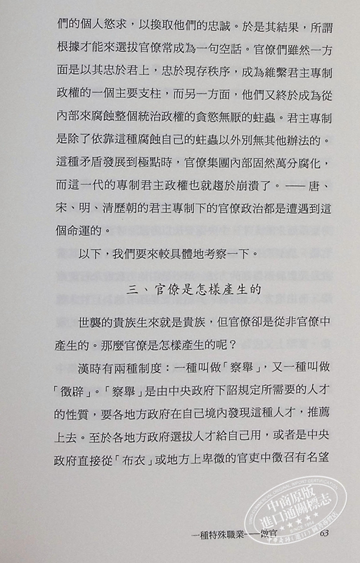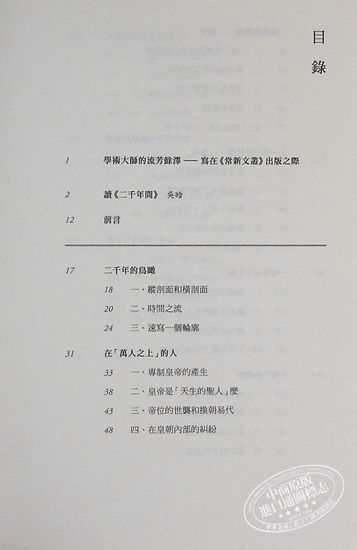 全書以通貫性的觀點透視自秦至清二千多年間的歷史,就古代中國為什麼會產生皇帝,以至做官與當兵是怎樣成為皇帝制度的兩條支柱等一系列問題,作深入淺出的剖析。這些論述均清新可喜,使讀者對中國歷史感到無窮趣味。