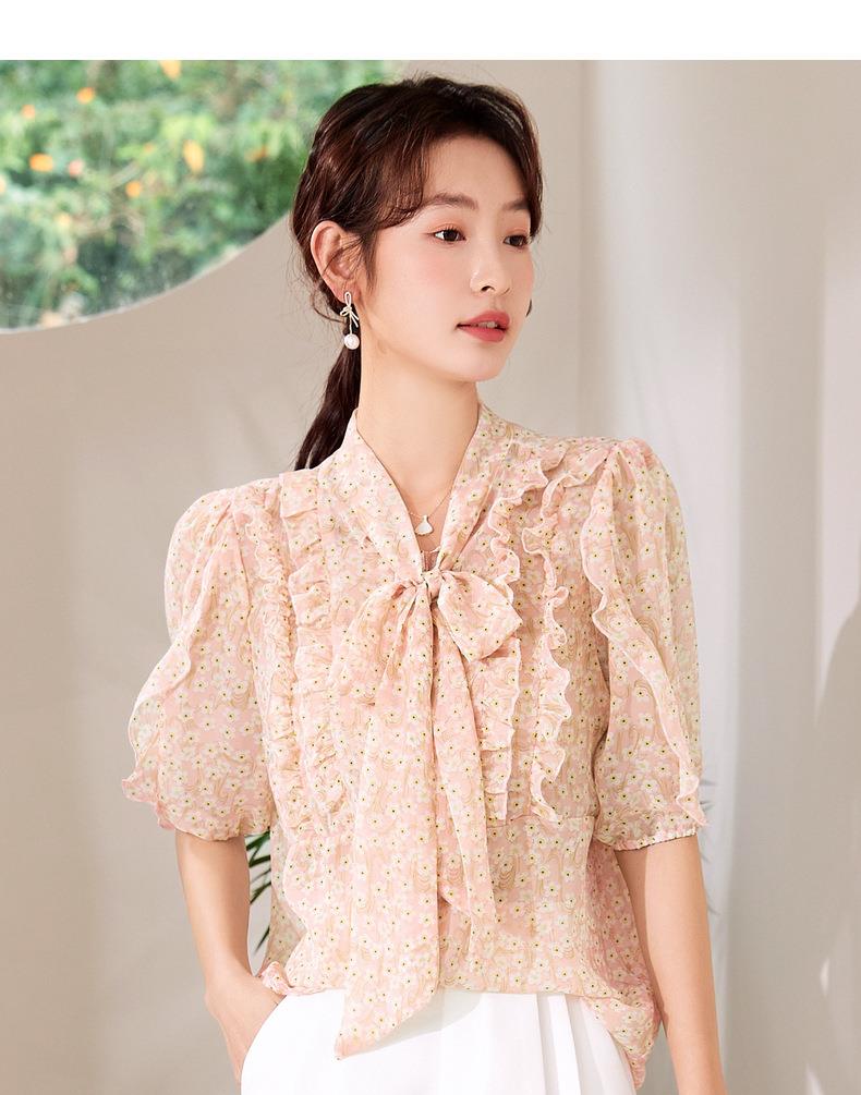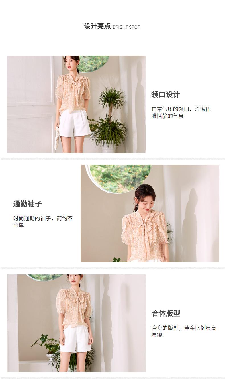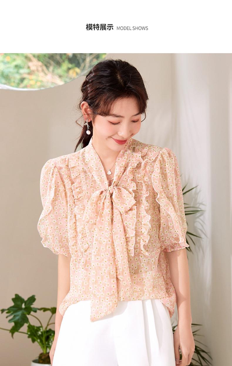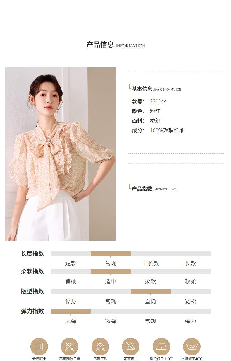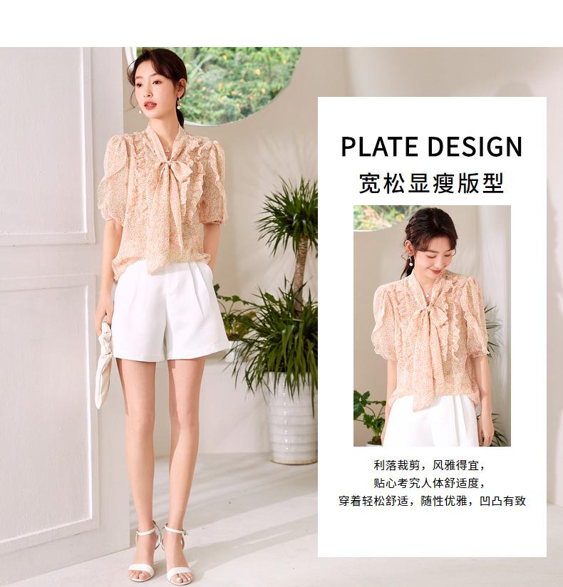百姿 荷叶边系带衬衫2023夏季新款甜美优雅直筒显瘦雪纺衬衣女