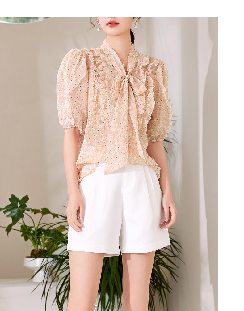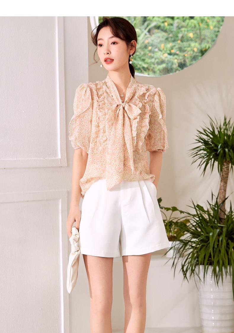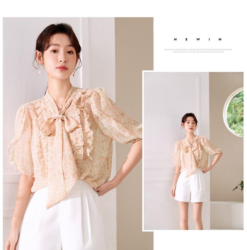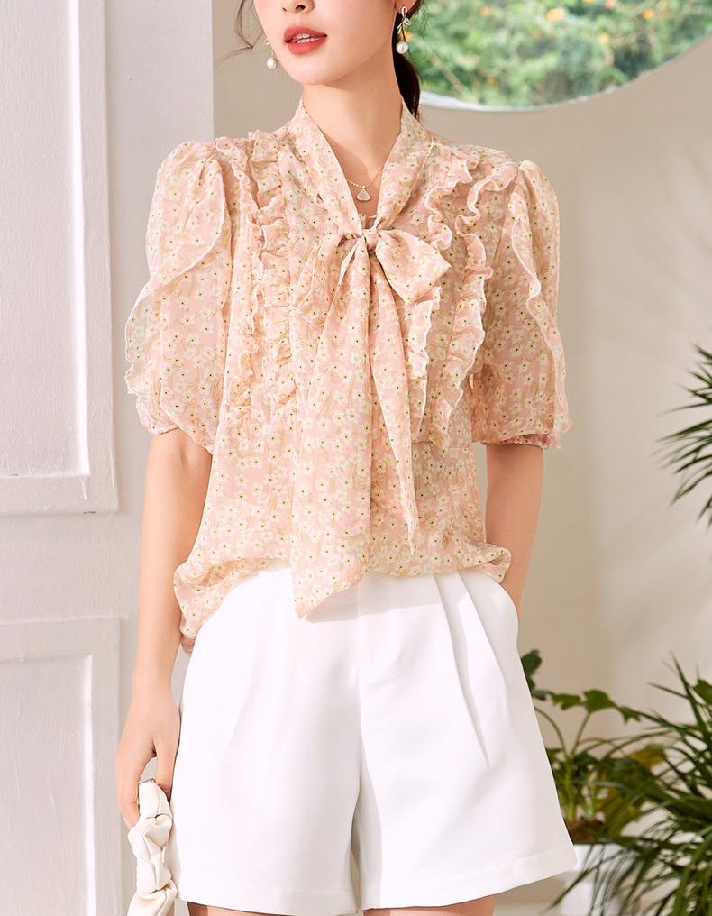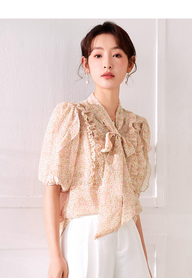 百姿 荷叶边系带衬衫2023夏季新款甜美优雅直筒显瘦雪纺衬衣女