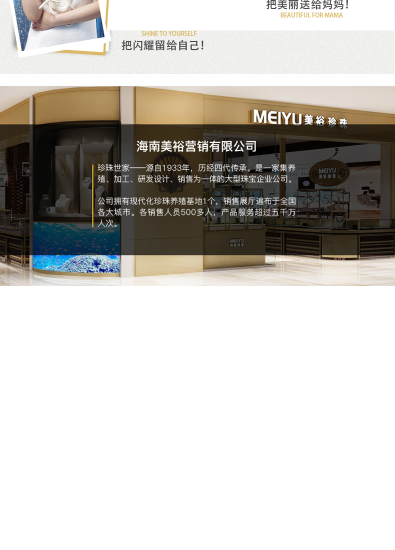 - 珍珠世家,代代相传。美裕珍珠,1933年起源于印尼,成长于海南岛。依托海南资源优势和自身专业优势,以经营南珠、南洋珠为主,专注于珍珠文化的挖掘和传播,把珍珠代表的爱意,永不间断地传承下去。