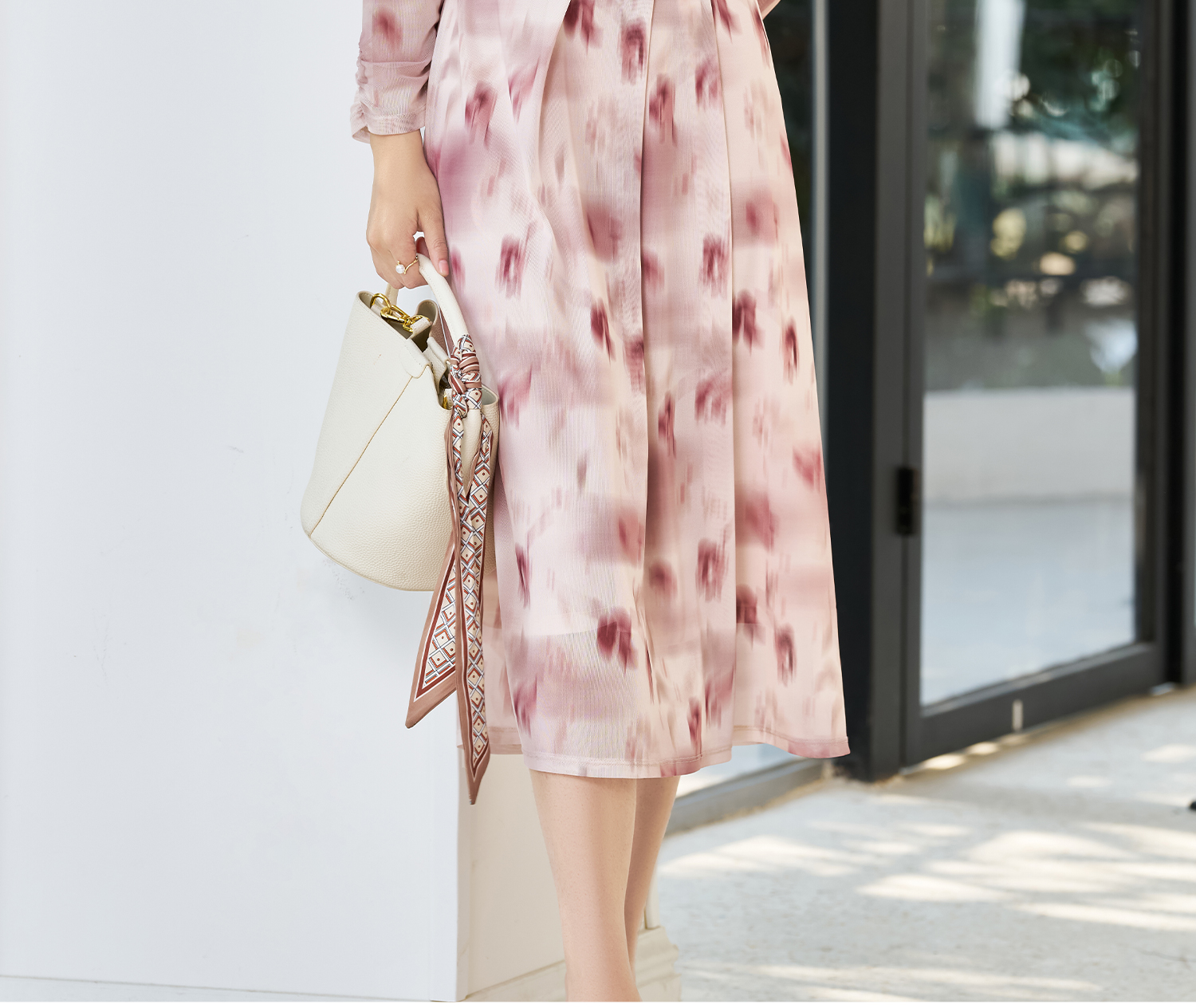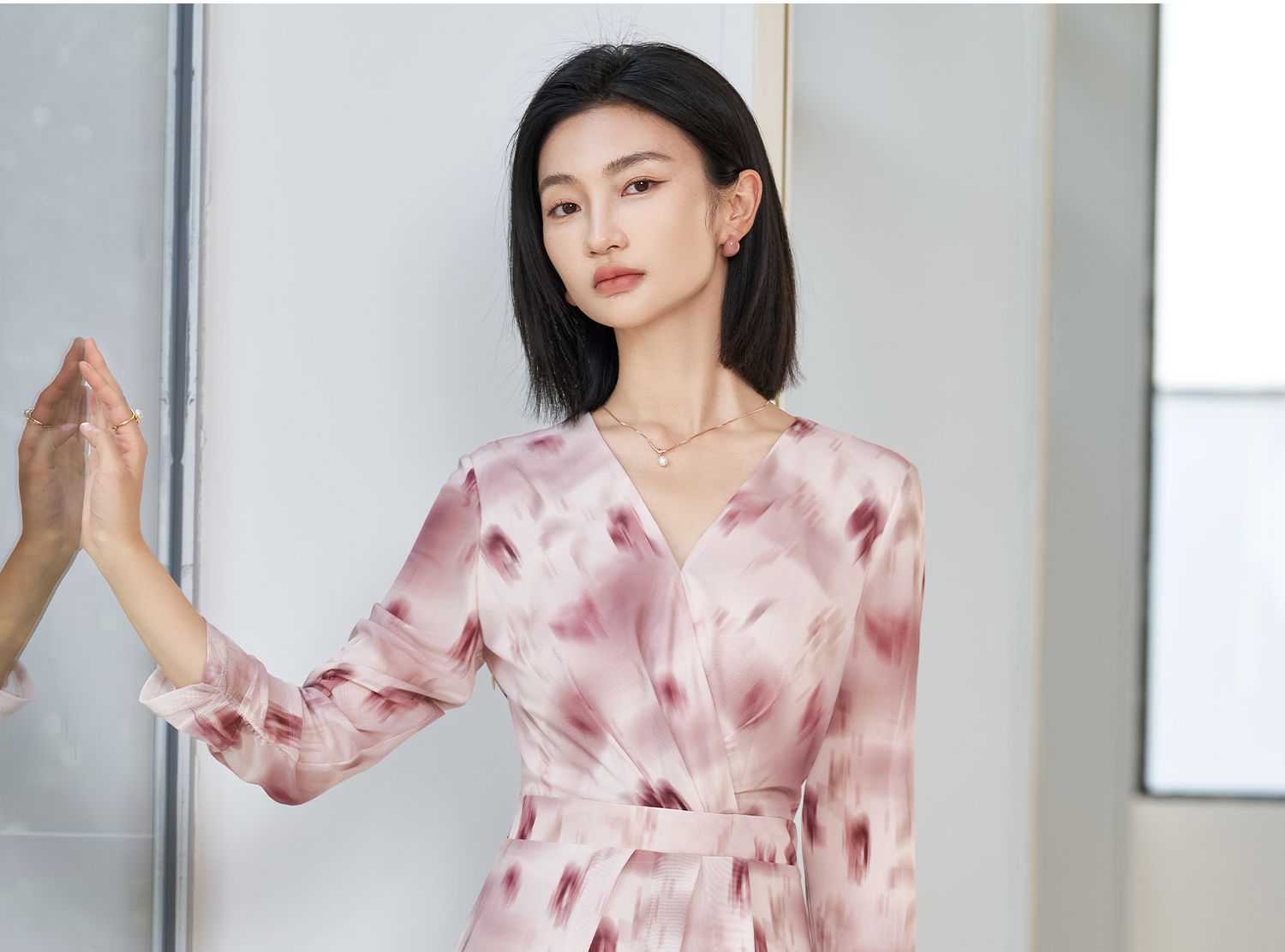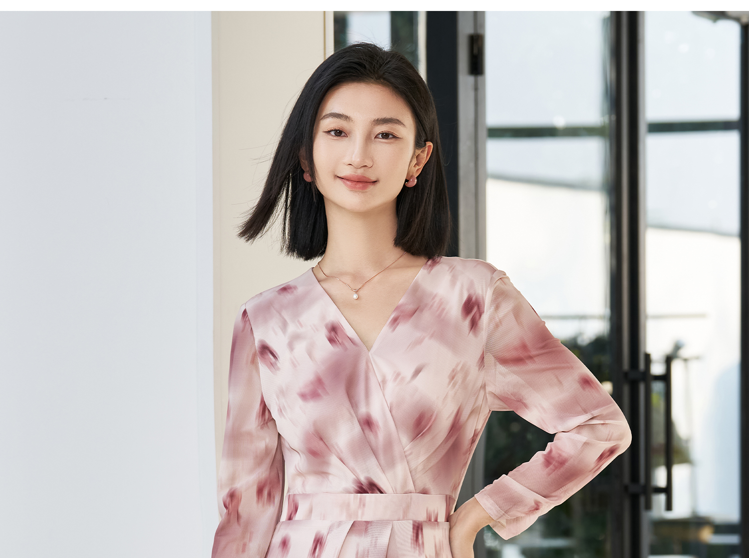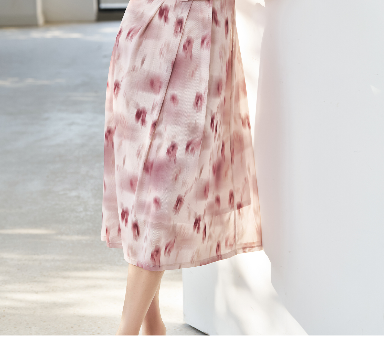 米思阳2026春季新款知性优雅气质玫瑰粉印花透气舒适连衣裙4932