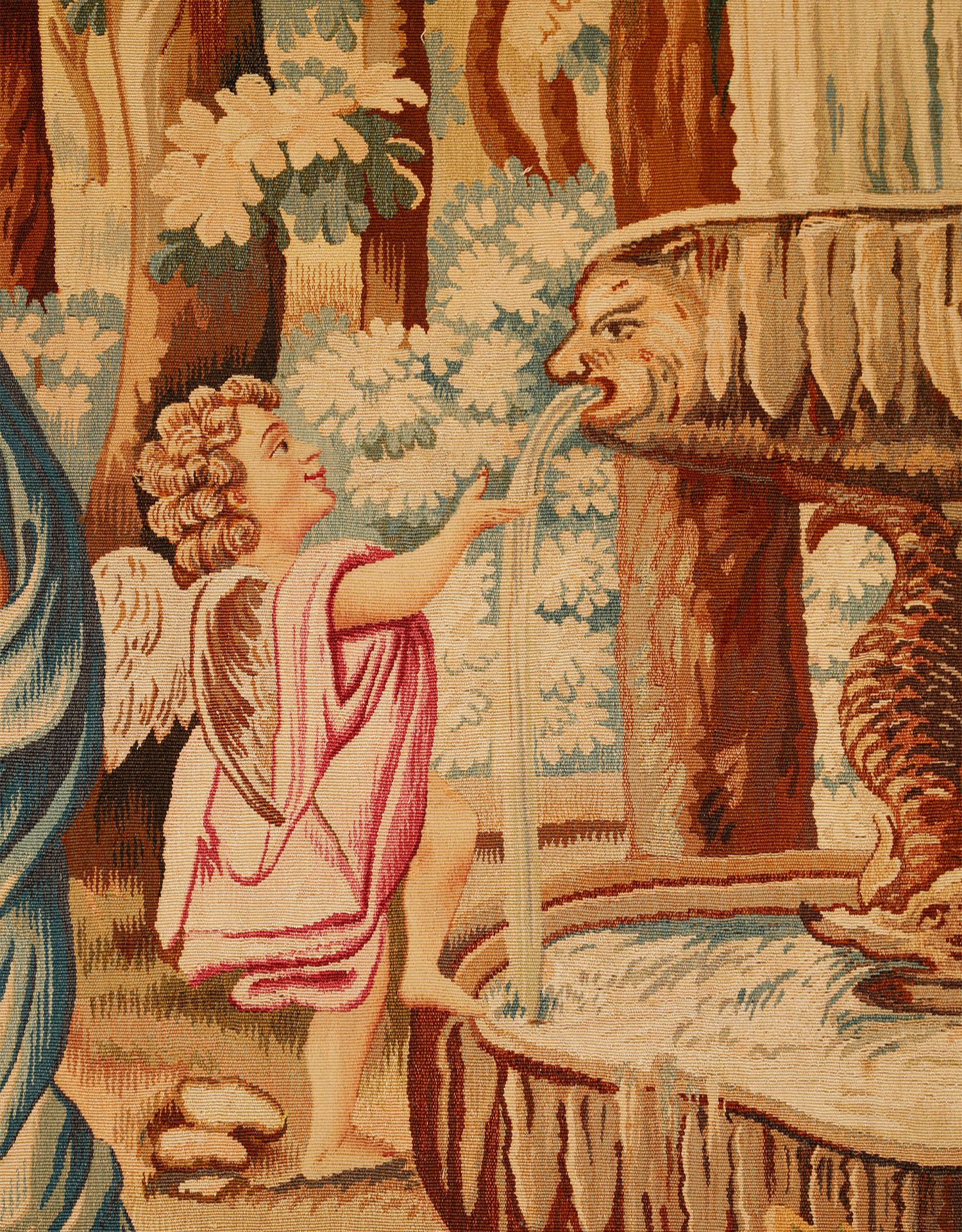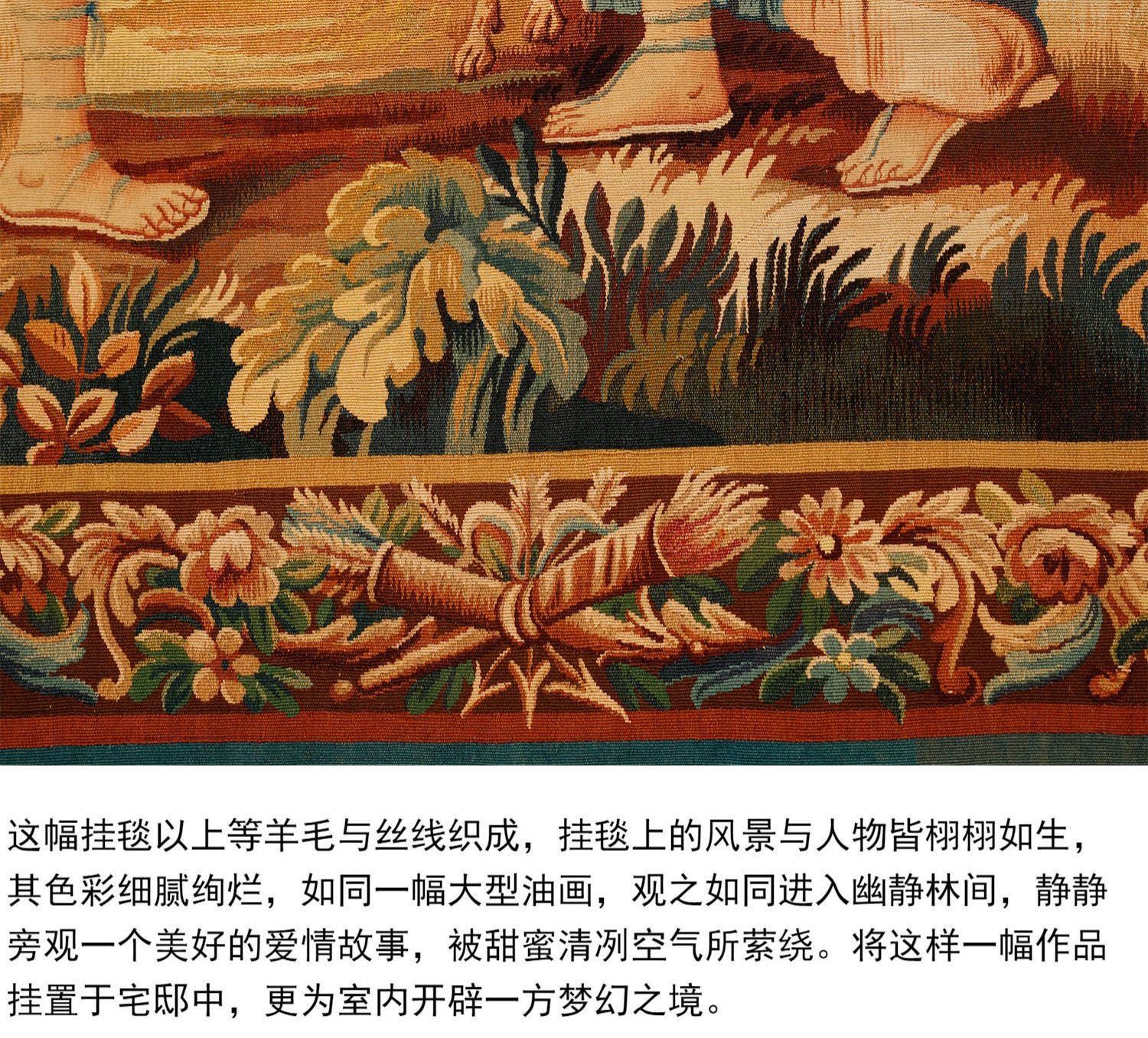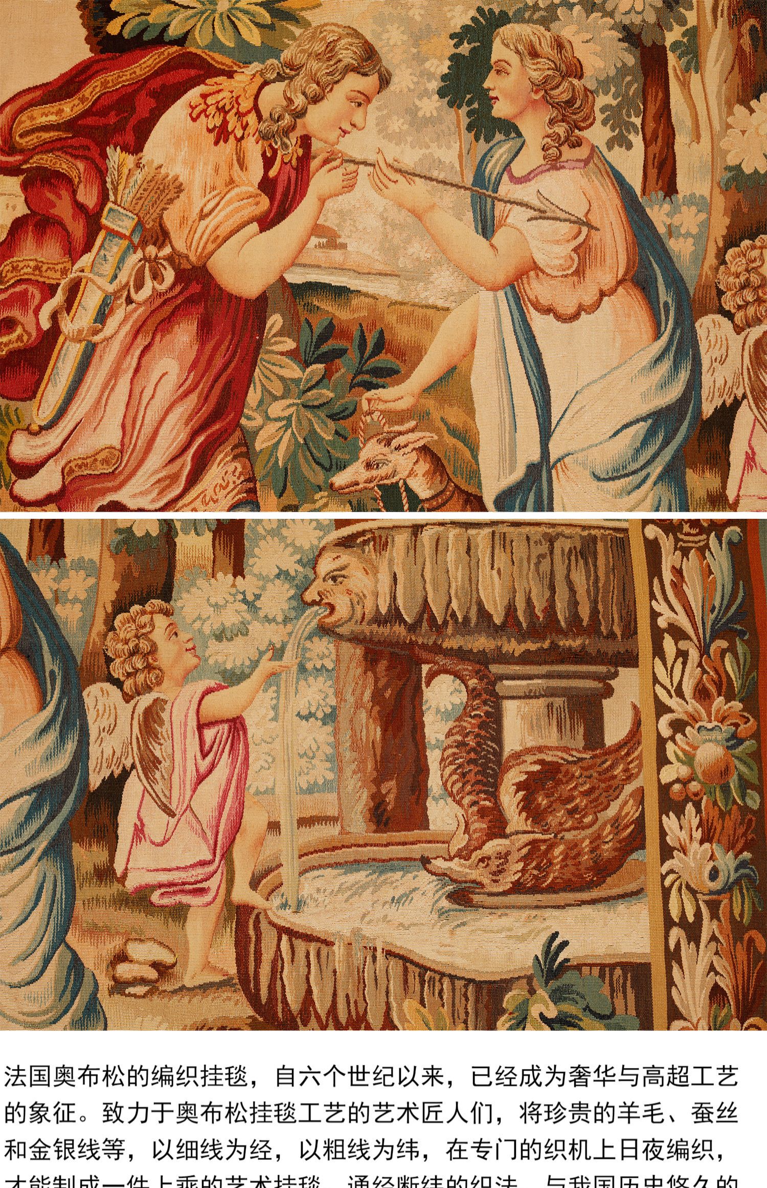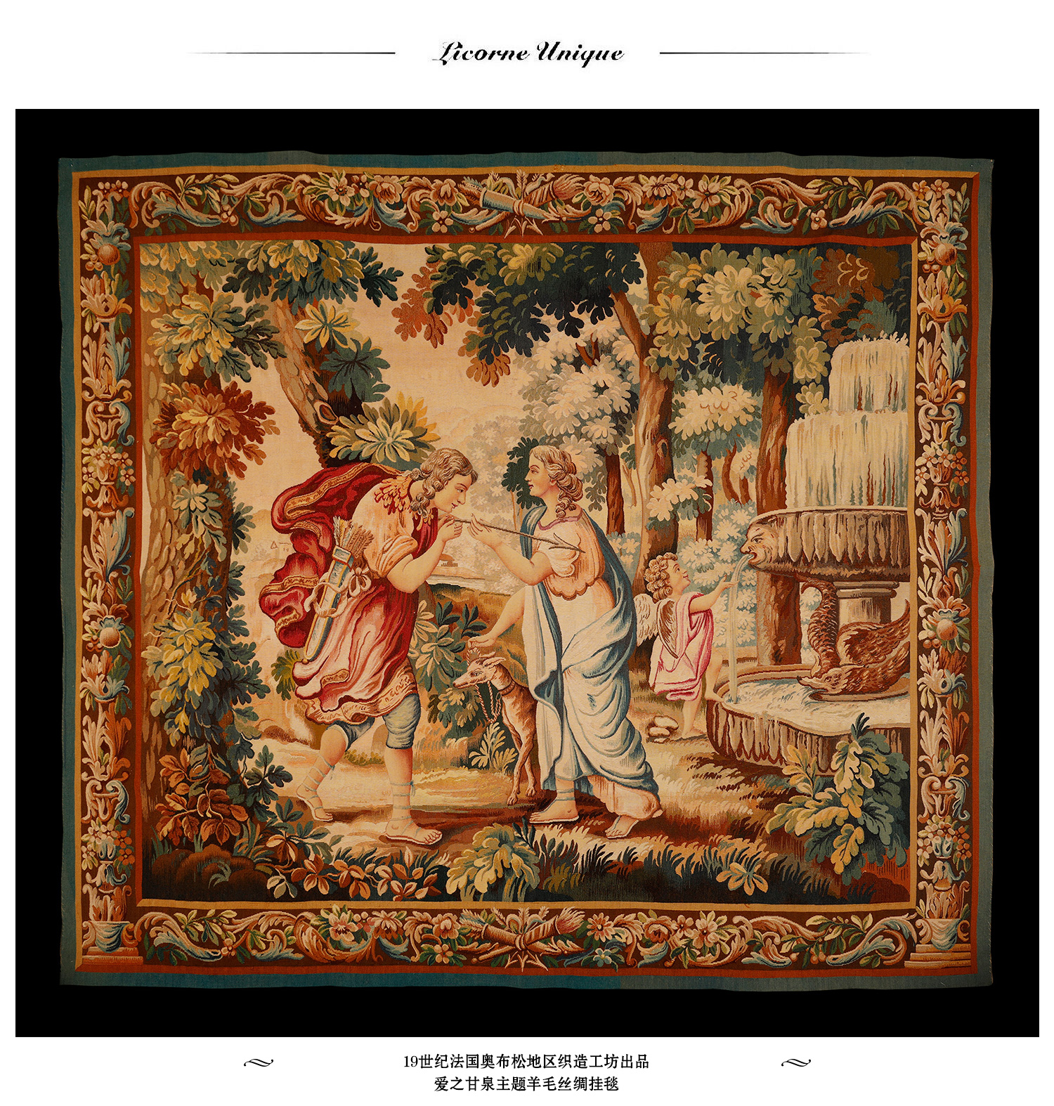 独角鹿西洋古董法国奥布松织造工坊爱之甘泉主题羊毛丝绸挂毯