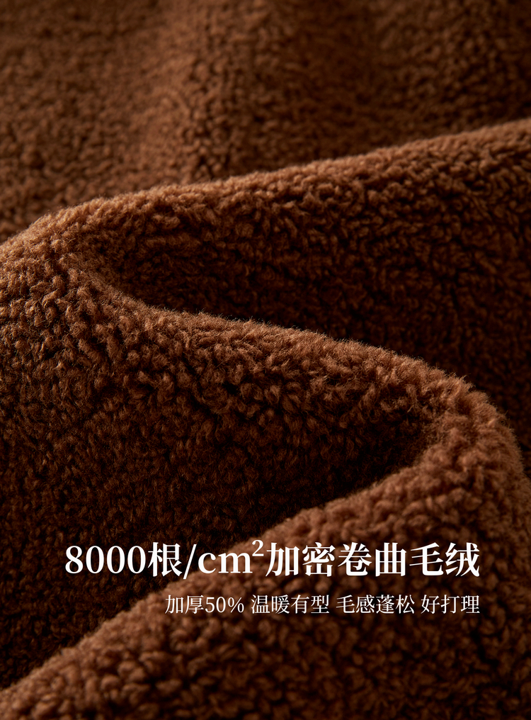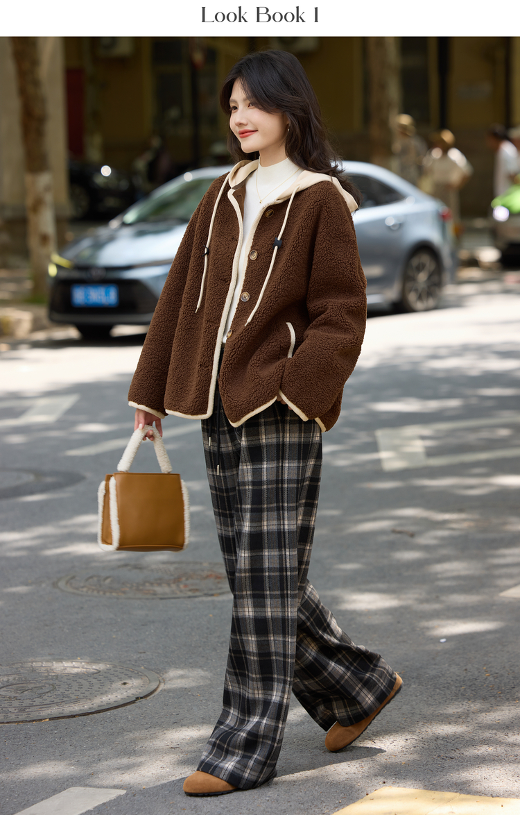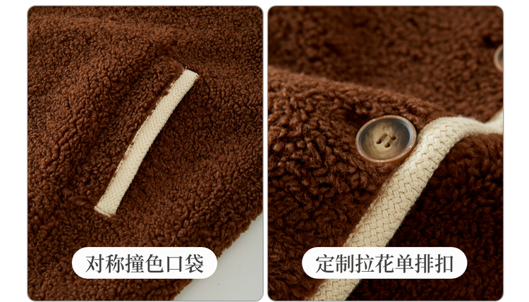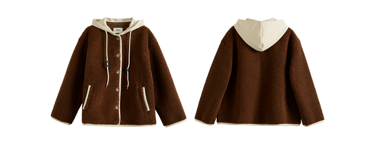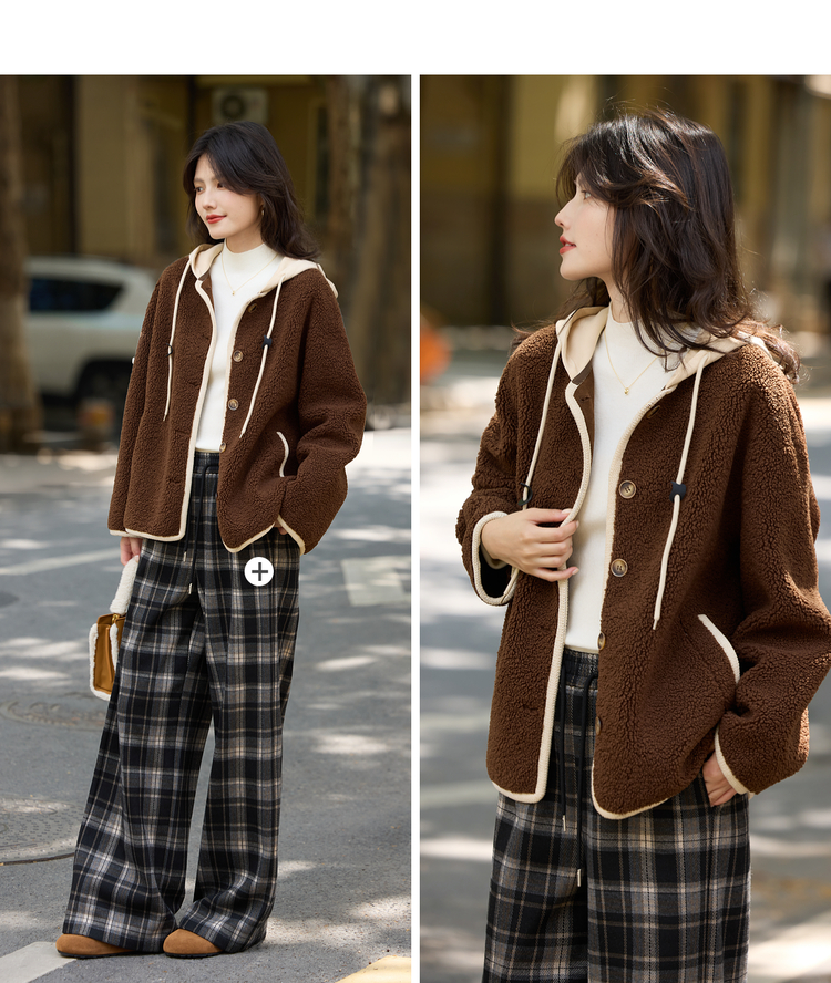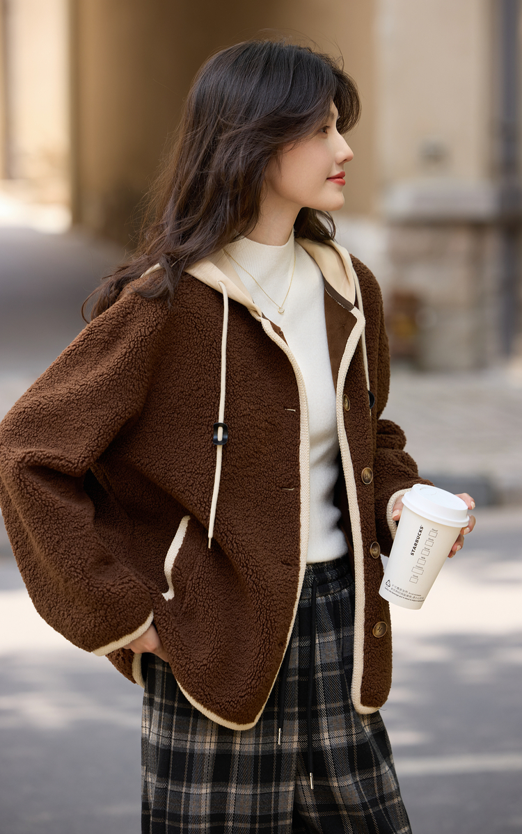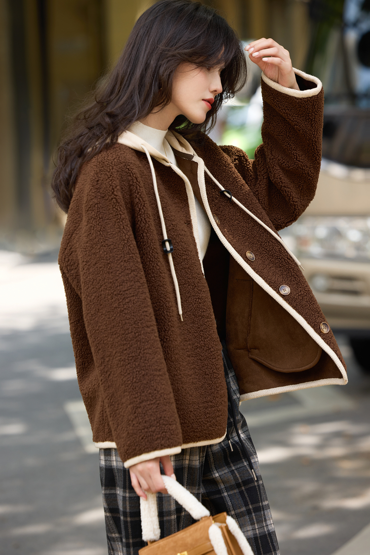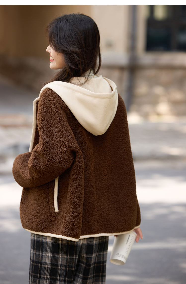 【年货节】熙世界仿羊羔绒短外套女宽松休闲2025秋冬新款撞色连帽毛绒绒上衣