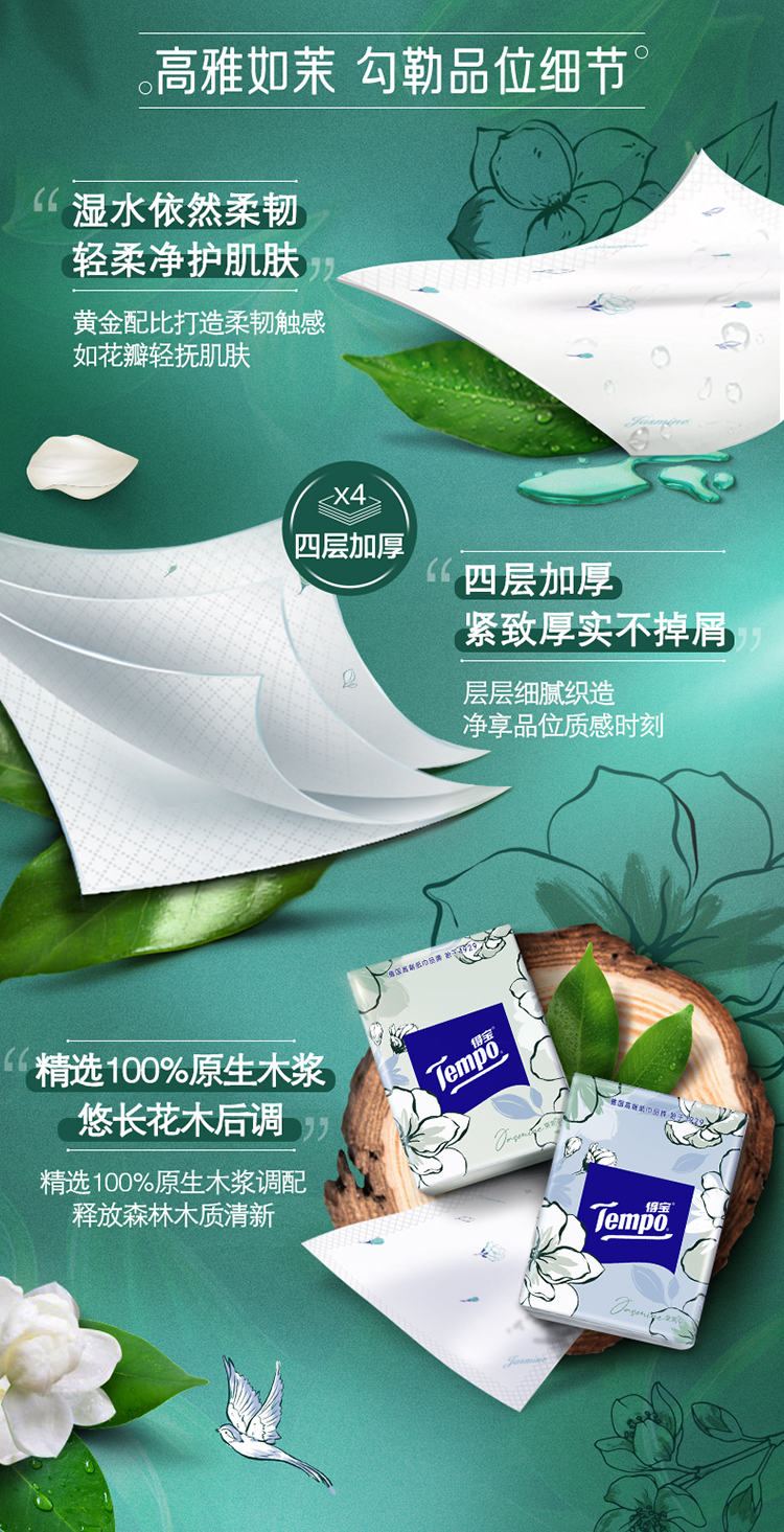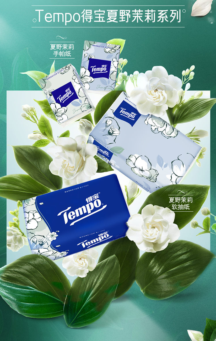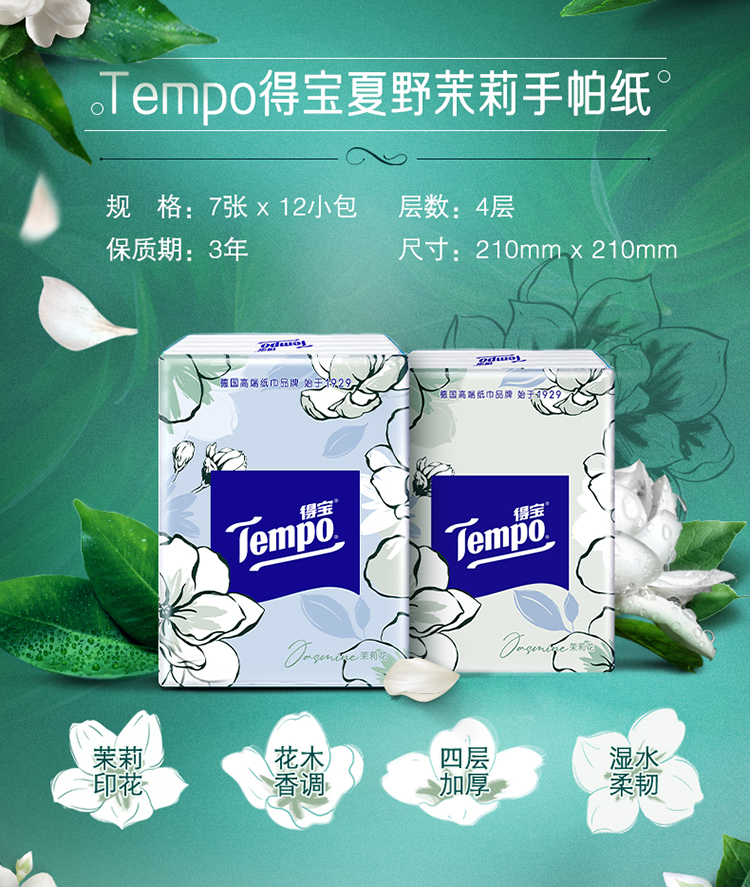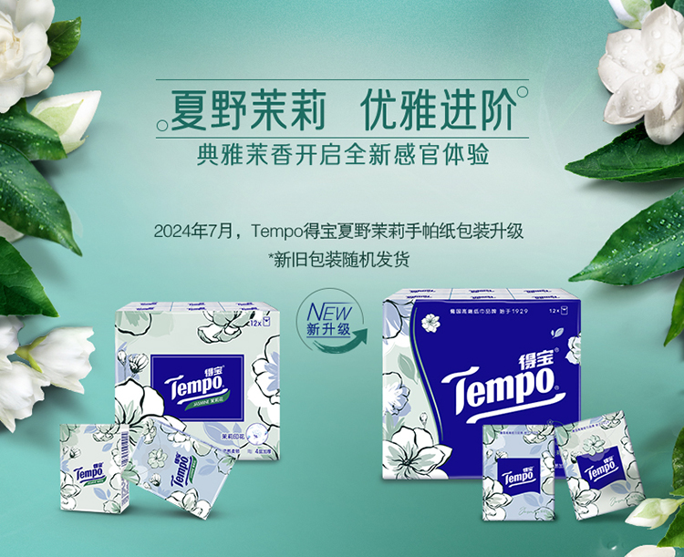 『得宝Tempo』手帕纸茉莉花味4层12包 纸巾小包便携装手帕纸餐巾纸(新旧包装随机发货/旧包装无印花)