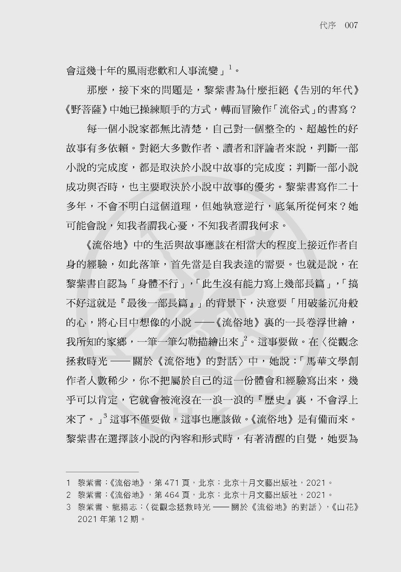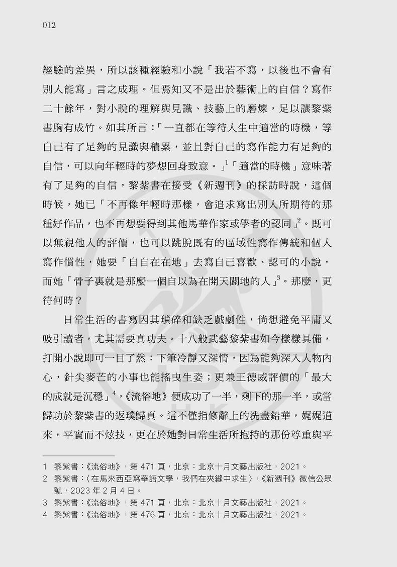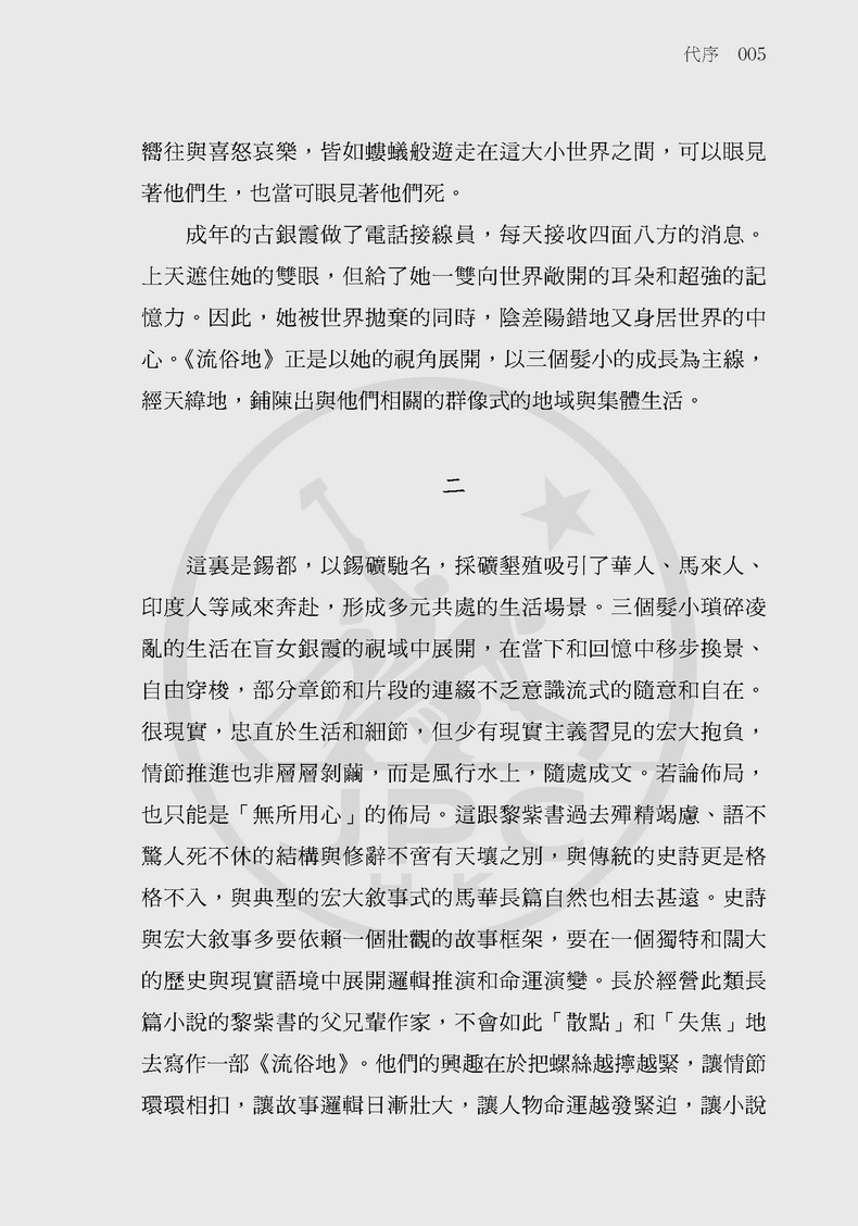 黎紫書以「流俗」為鏡,映照出個體在時代變遷中的微光;以女性獨特的視角和經驗,細密縫綴歷史的經緯度,拓展了馬華文學的敘事圖景。「吾若不寫,無人能寫。」鉛華洗盡,她以平實卻自信的筆觸,為故鄉存史,鋪展出這幅色彩斑斕的文學版畫。