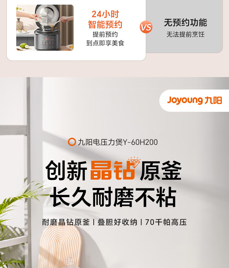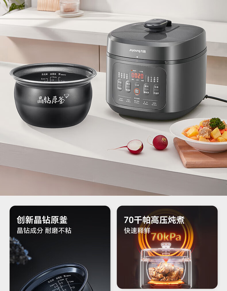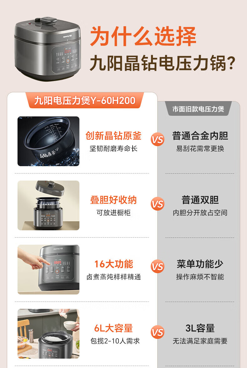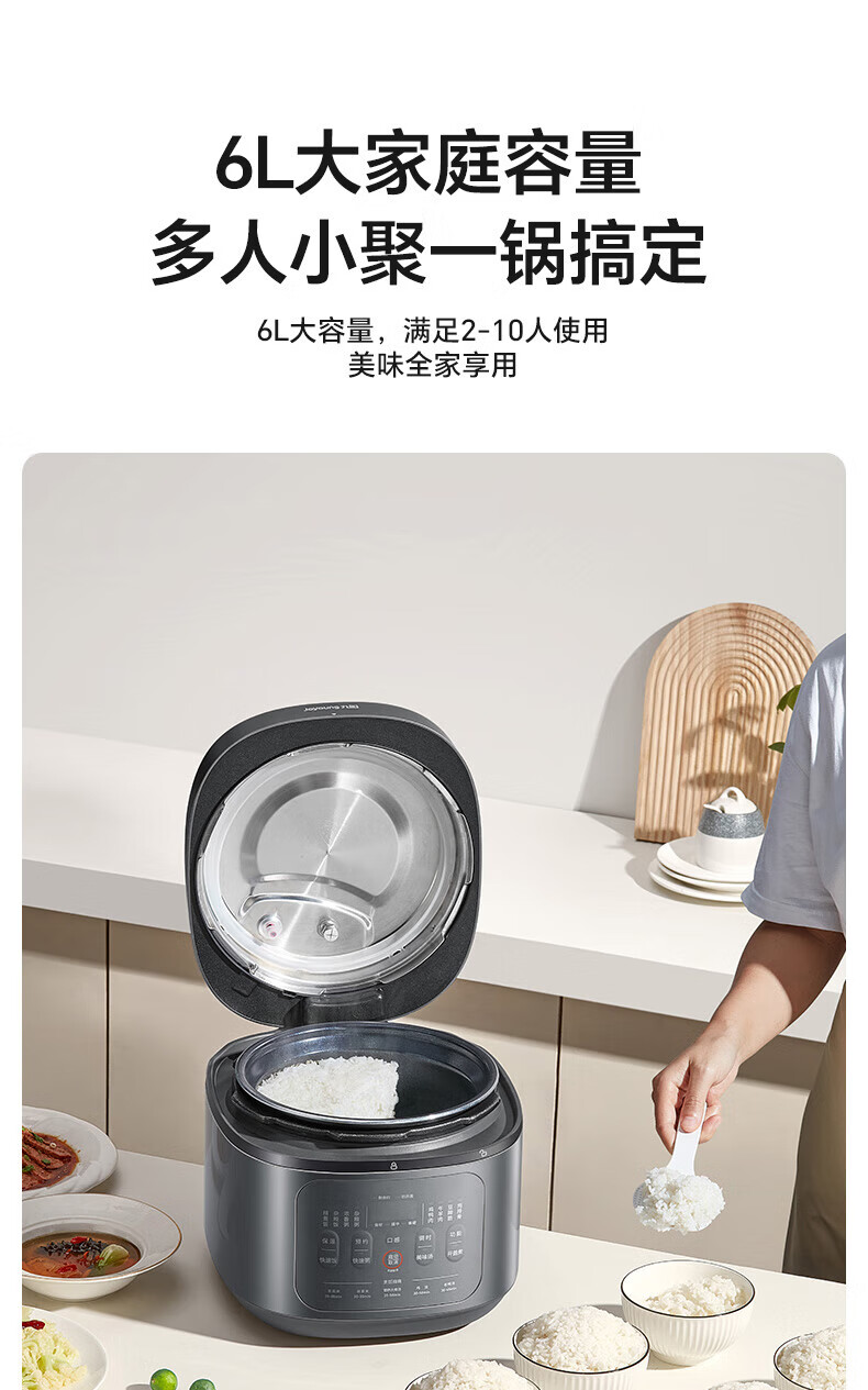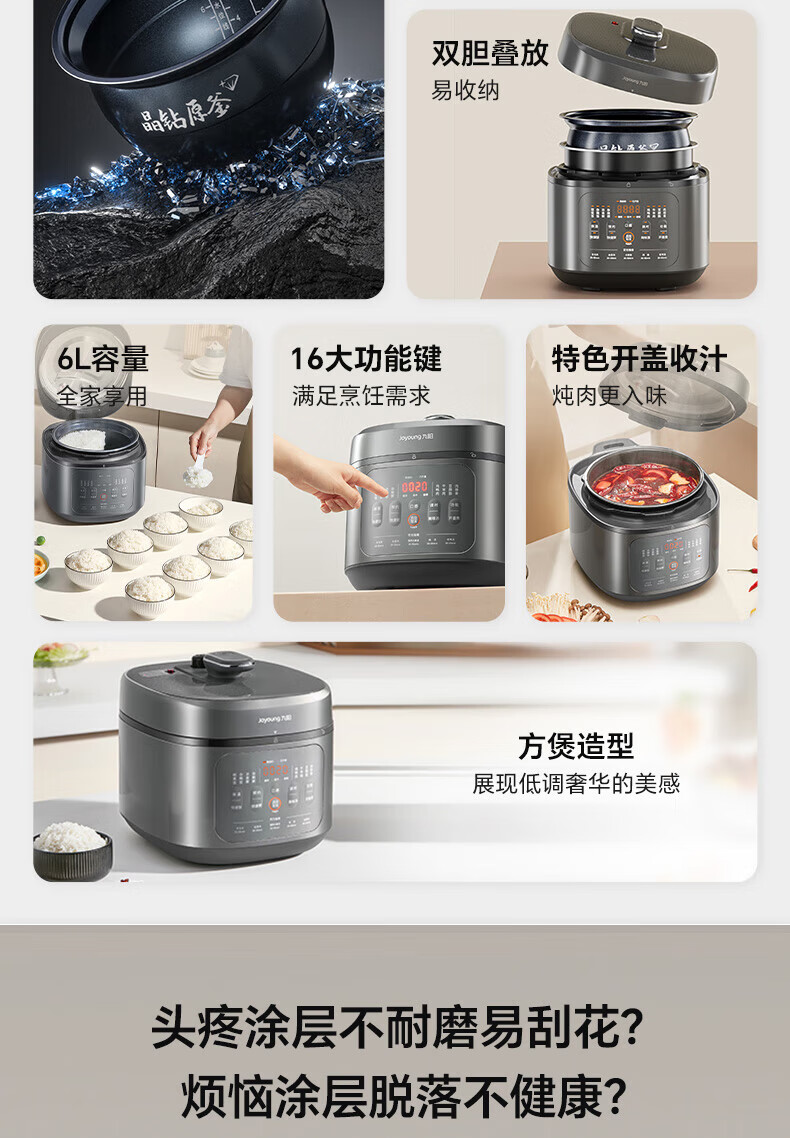 九阳(Joyoung) 大容量6L 电压力锅 双胆叠放 特色开盖收汁 16大功能键 晶钻原釜 智能加热 预约定时 双胆煮饭煲汤炖肉 Y-60H200