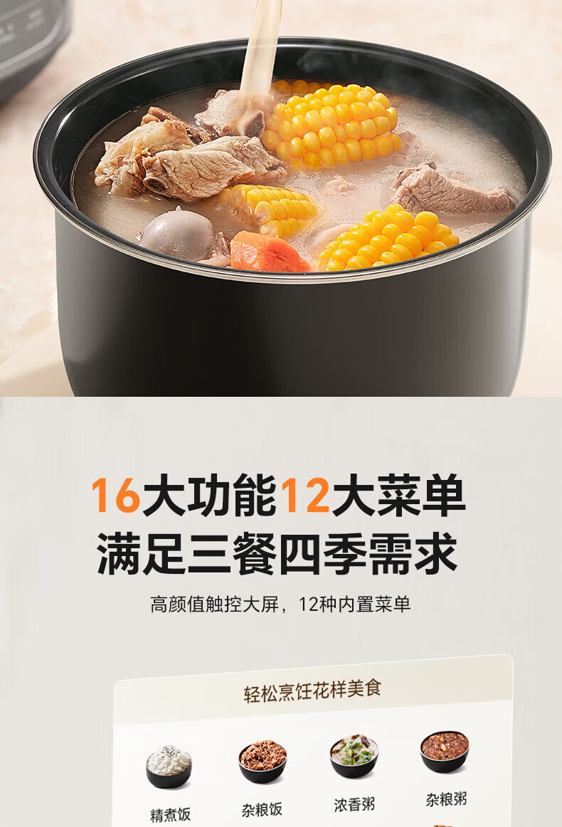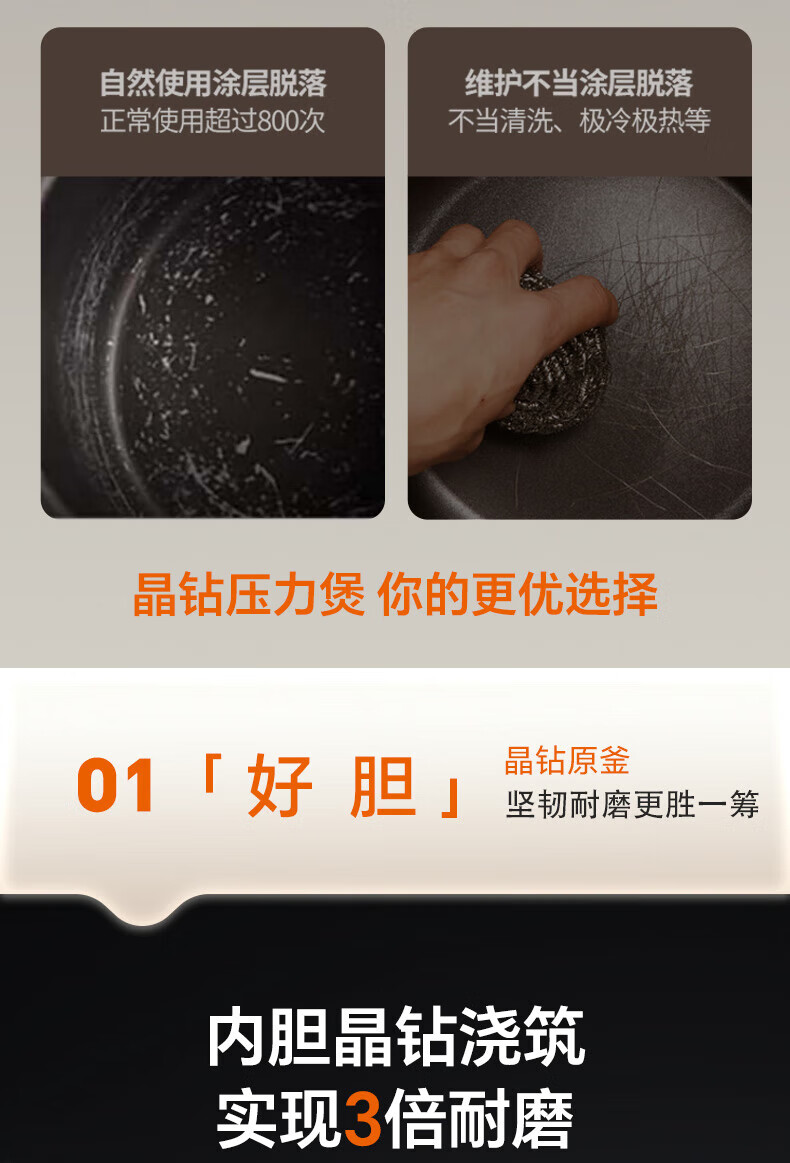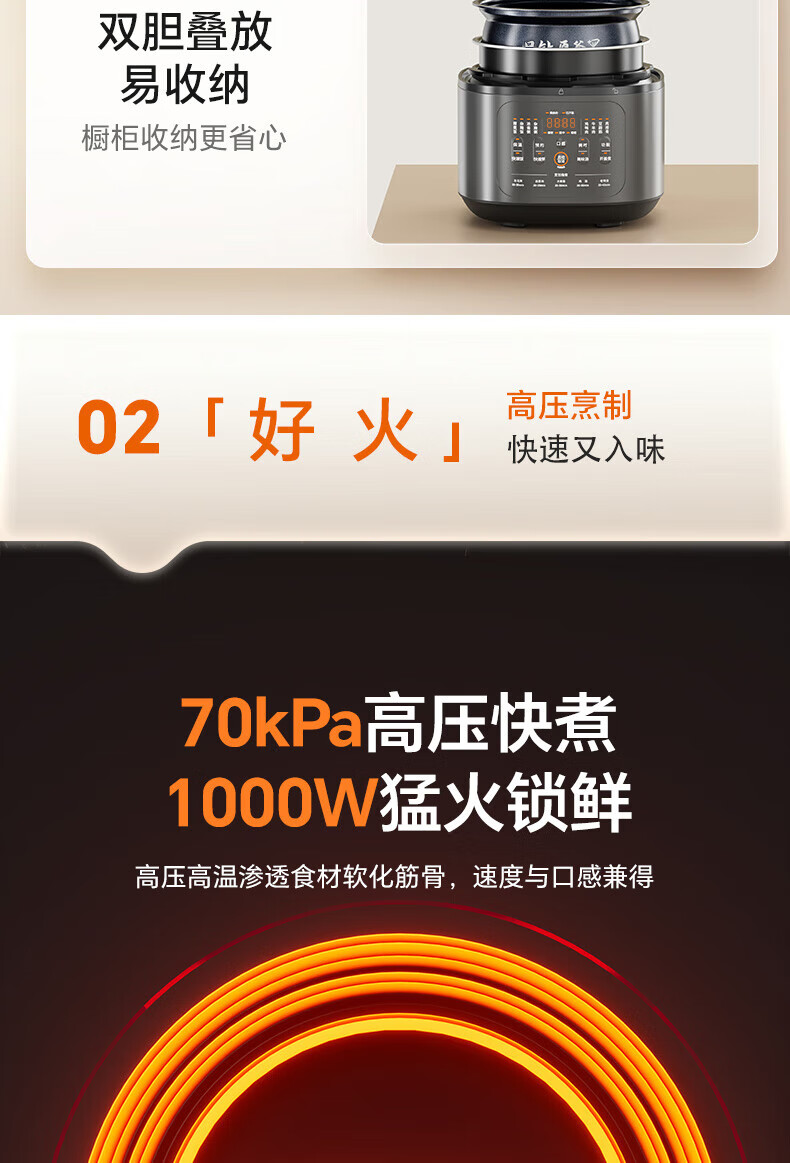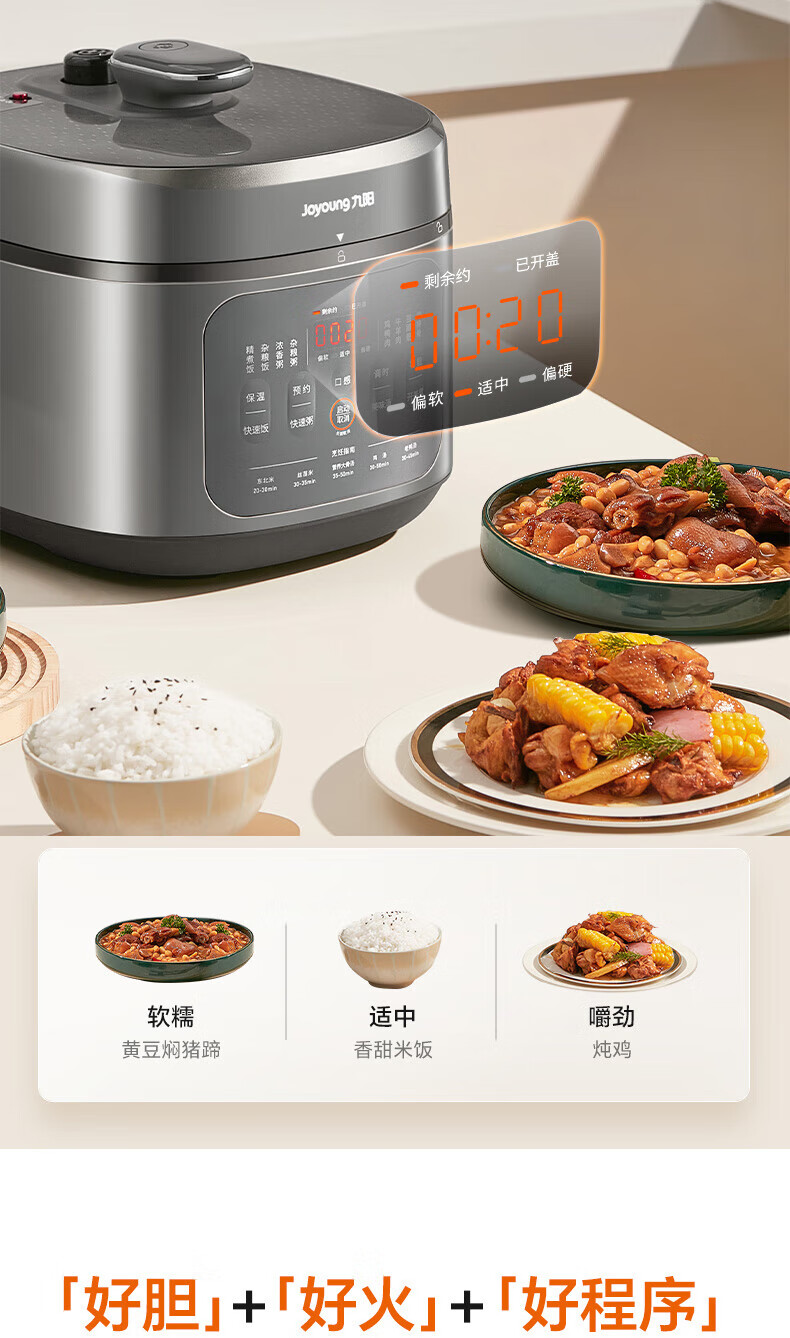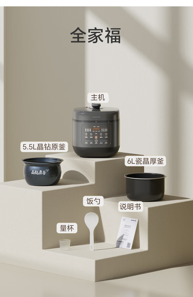 九阳(Joyoung) 大容量6L 电压力锅 双胆叠放 特色开盖收汁 16大功能键 晶钻原釜 智能加热 预约定时 双胆煮饭煲汤炖肉 Y-60H200