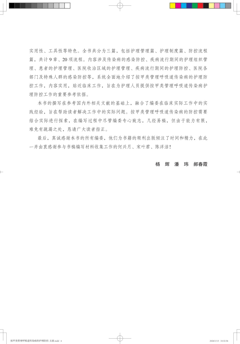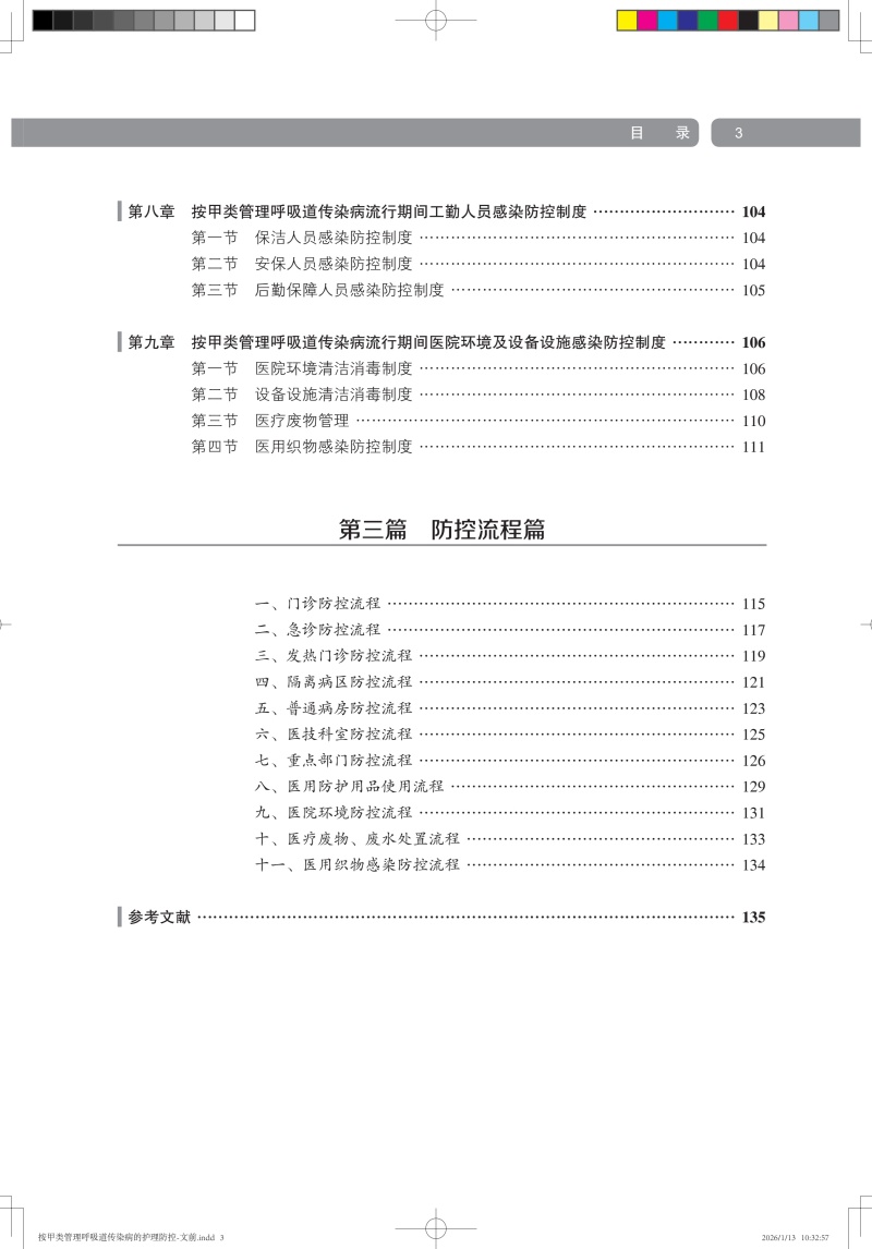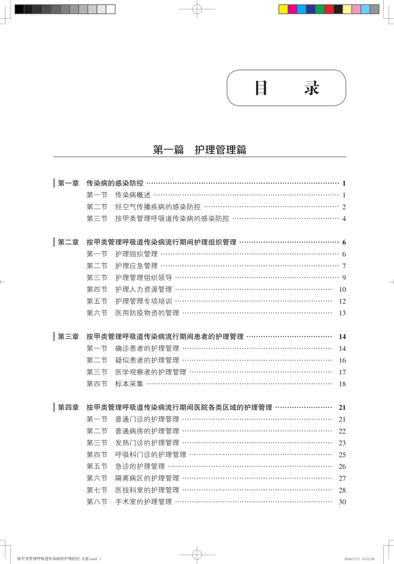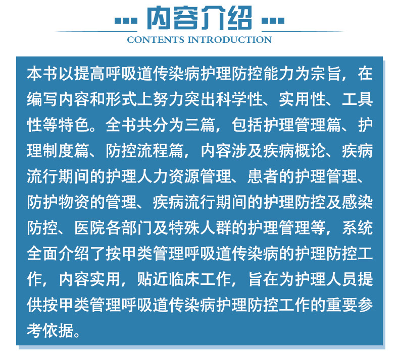 本书以提高呼吸道传染病护理防控能力为宗旨,在编写内容和形式上努力突出科学性、实用性、工具性等特色。全书共分为三篇,包括护理管理篇、护理制度篇、防控流程篇,内容涉及疾病概论、疾病流行期间的护理人力资源管理、患者的护理管理、防护物资的管理、疾病流行期间的护理防控及感染防控、医院各部门及特殊人群的护理管理等,系统全面介绍了按甲类管理呼吸道传染病的护理防控工作,内容实用,贴近临床工作,旨在为护理人员提供按甲类管理呼吸道传染病护理防控工作的重要参考依据。