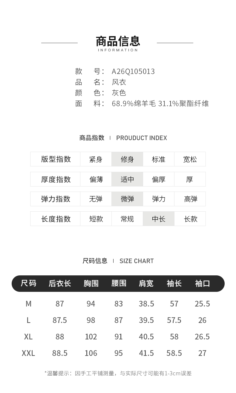 【特价款不退不换】阿菁娜经典简约斜纹羊毛中长款风衣A26Q105013
