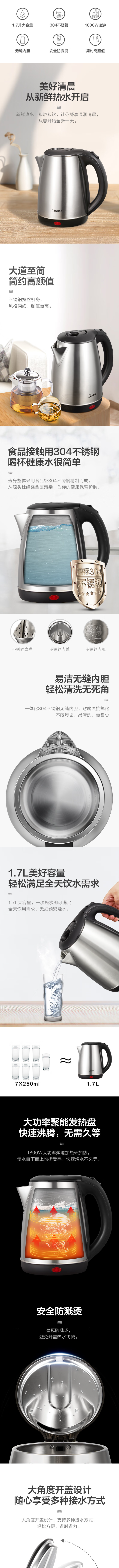 美的(Midea)(510479)烧水壶电热水壶1.7L大容量电水壶304不锈钢内胆1500W快速沸腾自动断电 MK-AEK1719 304不锈钢 1.7L