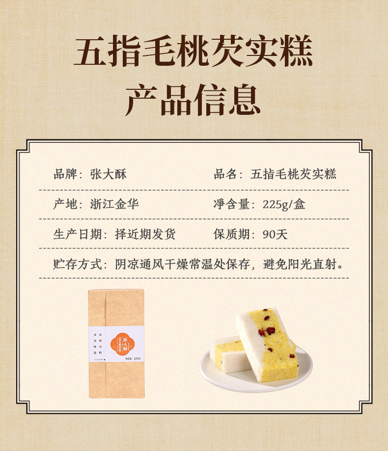 【品名】张大酥五指毛桃芡实糕 【规格】225g/盒 【保质期】90天 【储存方法】请置于阴凉干燥处,避免阳光直射 【产地】浙江金华 【发货地】浙江金华 【发货快递】极兔、圆通、申通、邮政 【不发货区域】新疆、西藏、内蒙古、青海、甘肃、宁夏、港澳台地区不发 【发货时效】48小时,节假日顺延 |
