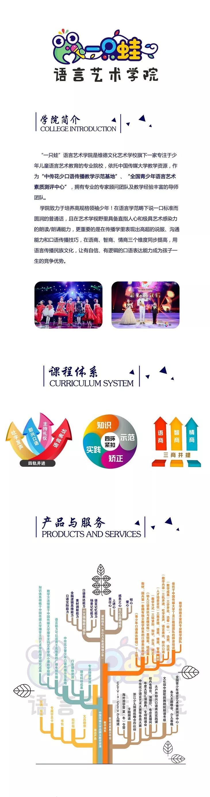 维德·一只蛙语言艺术学院是一家专注于少年儿童语言艺术教育的专业院校,依托中国传媒大学教学资源,作为“中传花少口语传播教学示范基地”、“全国青少年语言艺术素质测评中心”和“文化部中国歌剧舞剧院朗诵考级考点”,拥有专业的专家顾问团队及教学经验丰富的导师团队,为幼儿园、中小学提供3-16岁青少年和学龄前儿童语言艺术培养的全套解决方案。