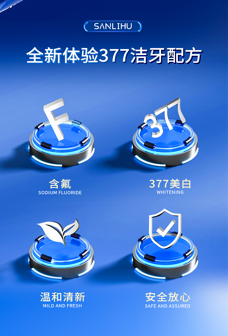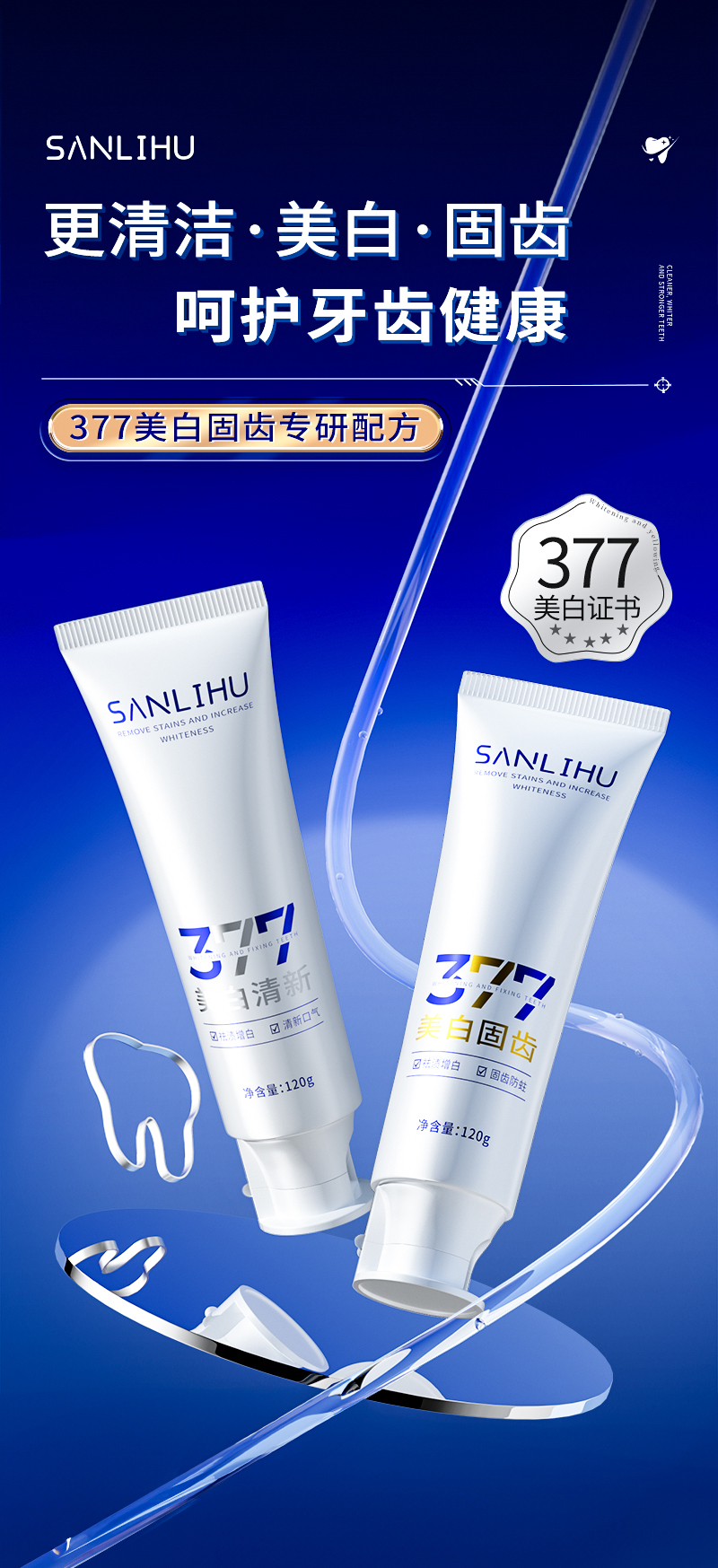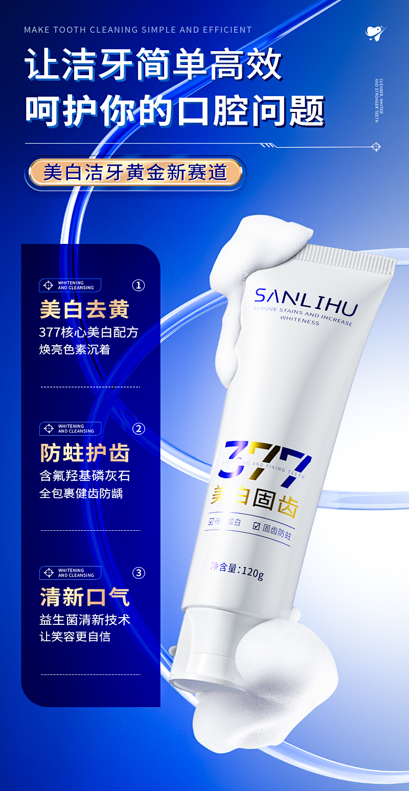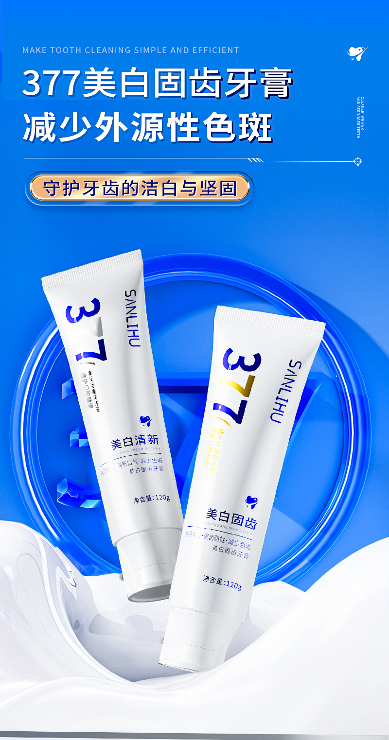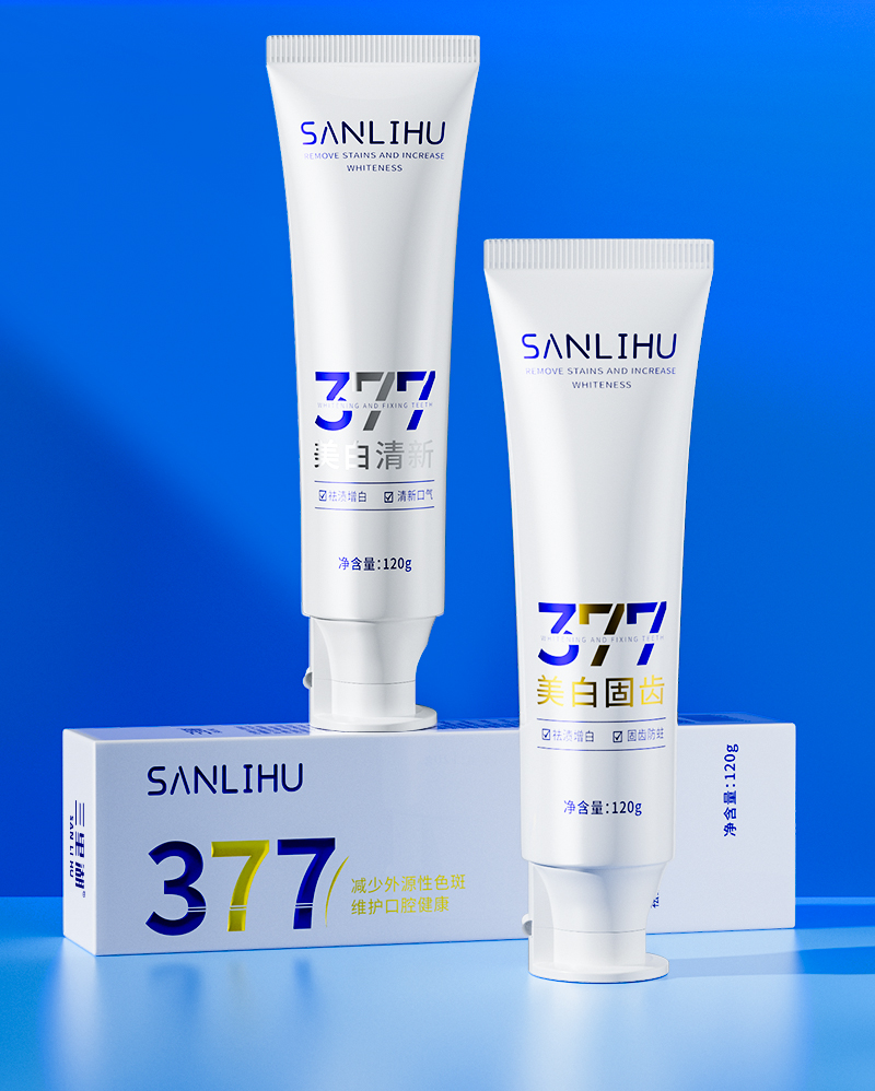 【3支装】377美白固齿牙膏、添加进口皱波角叉菜提取物、美白清新口气、120g/支、粤国牙膏网备字2024703955-2
